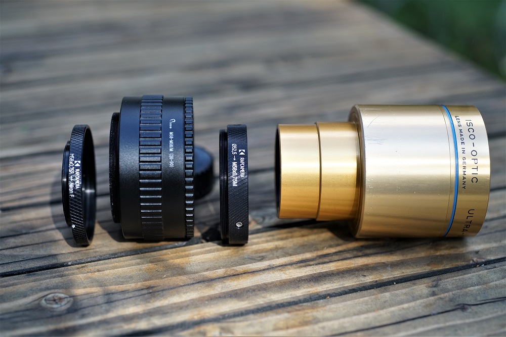 Ganz links ist der Adapter von M58 auf Nikon F, ganz rechts der Adapter von M58 auf das ISCO Objektiv. Dieser wird