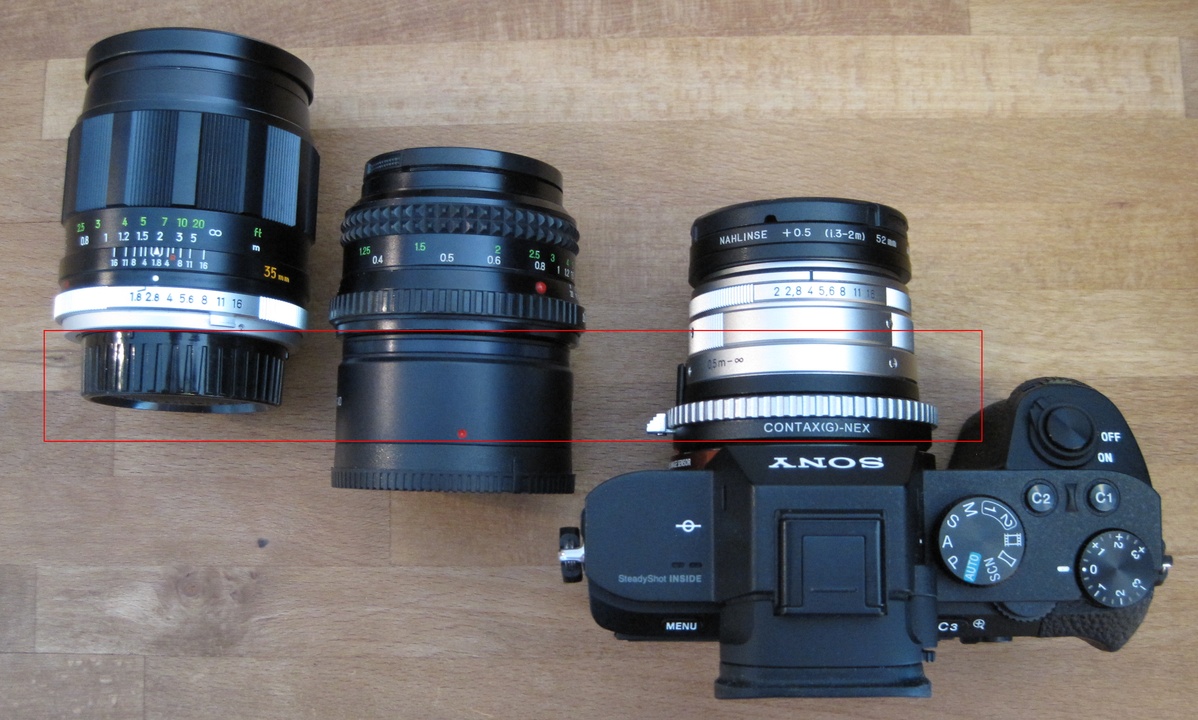 In diesem Bild habe ich die Bajonett-Auflageflächen so gelegt, dass man auch gleich eine Vorstellung bekommt, wieviel das betreffende Objektiv an der Alpha 7ii aufträgt.