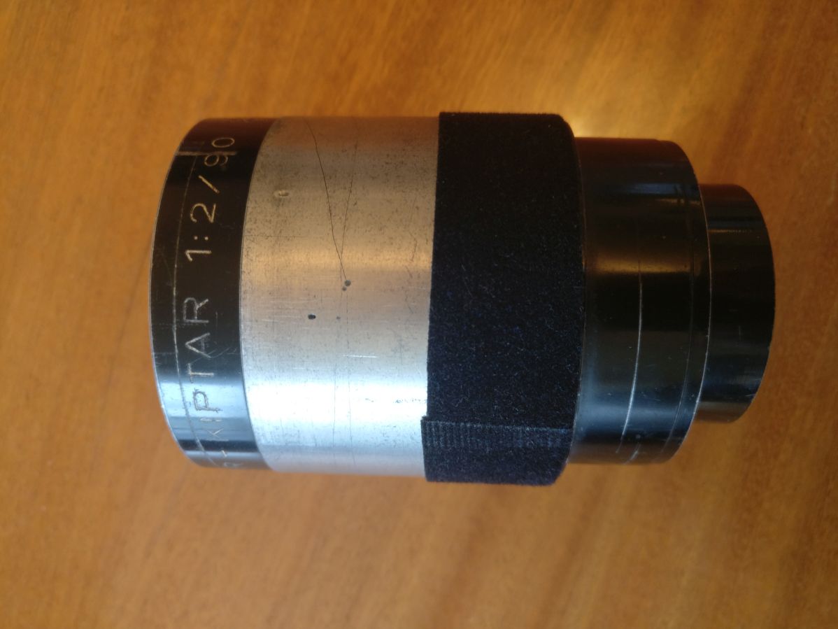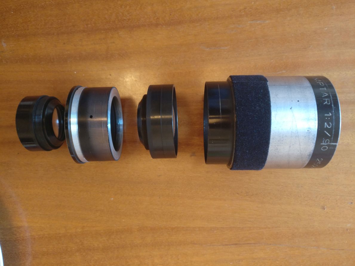 Das Objektiv besteht eigentlich aus 4 Teilen, wobei es seine eigene Sonnenblende netterweise schon mitbringt. Hinteres Glas 3,7 cm Durchmesser, vorne 4,7 cm. Gesamtlänge des Objektivs 9 cm. Zwei Linsenblöcke, die ich aber nicht weiter versucht habe zu öffnen.