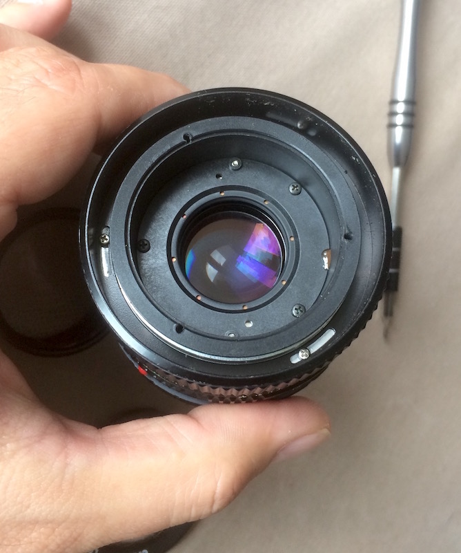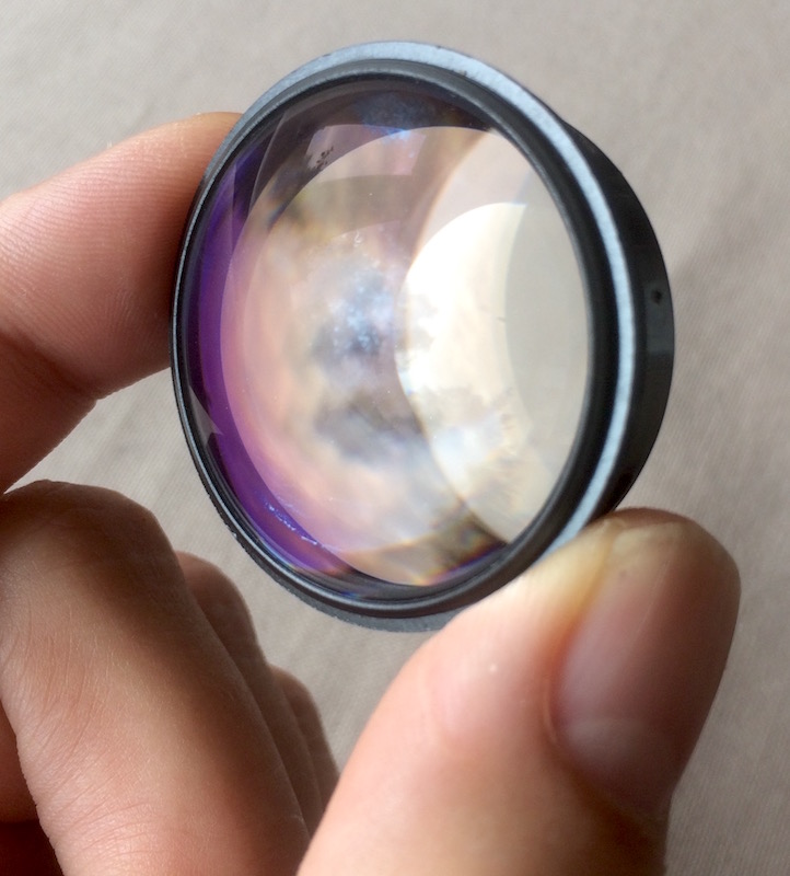 habe diesen Tubus dann vorsichtig seitlich öffnen können und die drei Linsen gereinigt. Man muss aufpassen, denn sobald man den Tubus öffnet, kommen einem gleich die zwei asphärischen ersten Linsen ( hinter/ aufeinander angeordnet) entgegen. man muss sich die Anordung gleich merken für den Wiederzusammenbau.