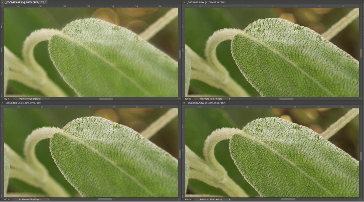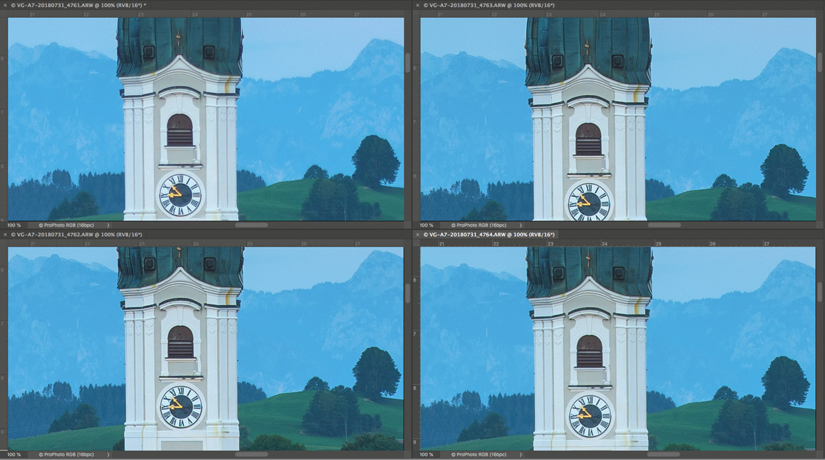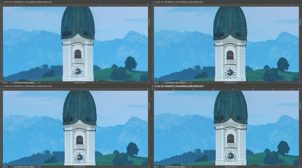 Bildmitte bei f/3,7 (links oben), f/5 (links unten), f/7,1 (rechts oben) und f/10 (rechts unten)