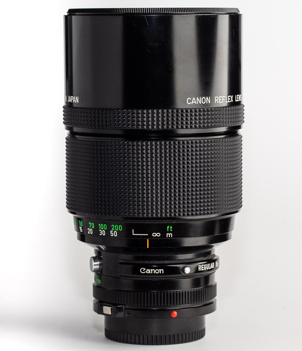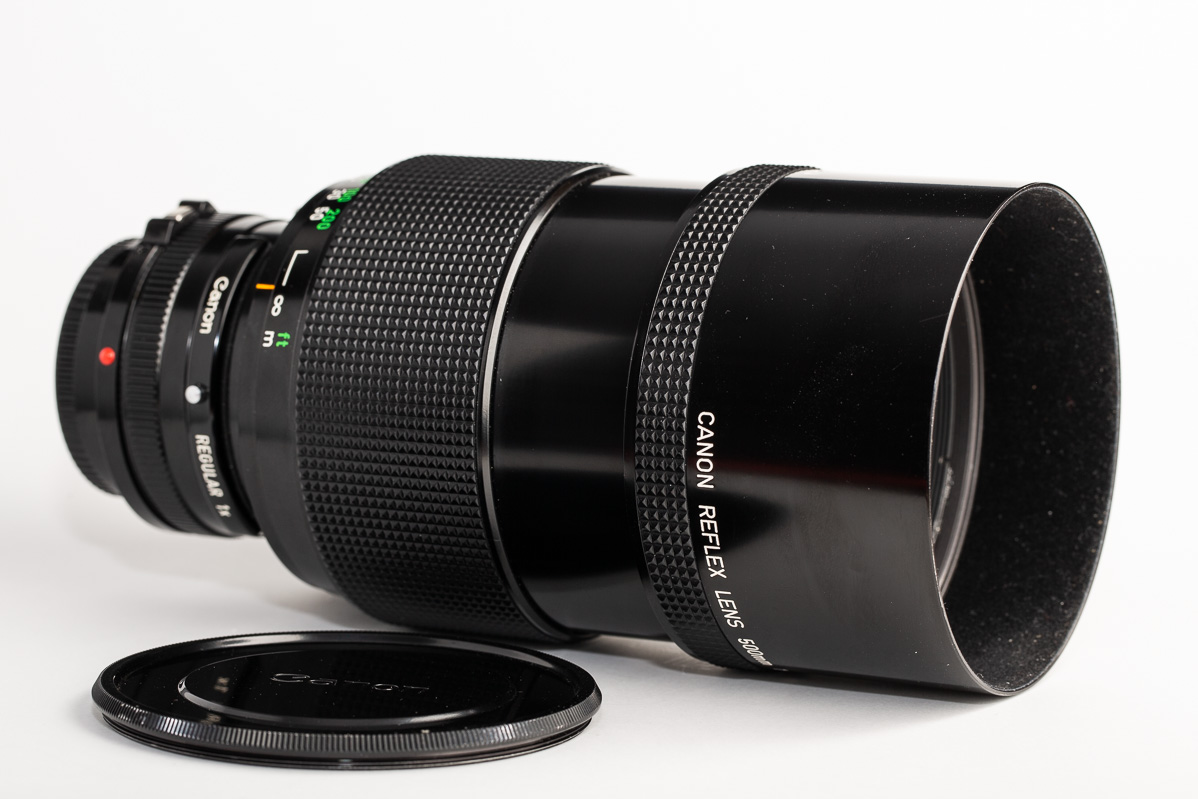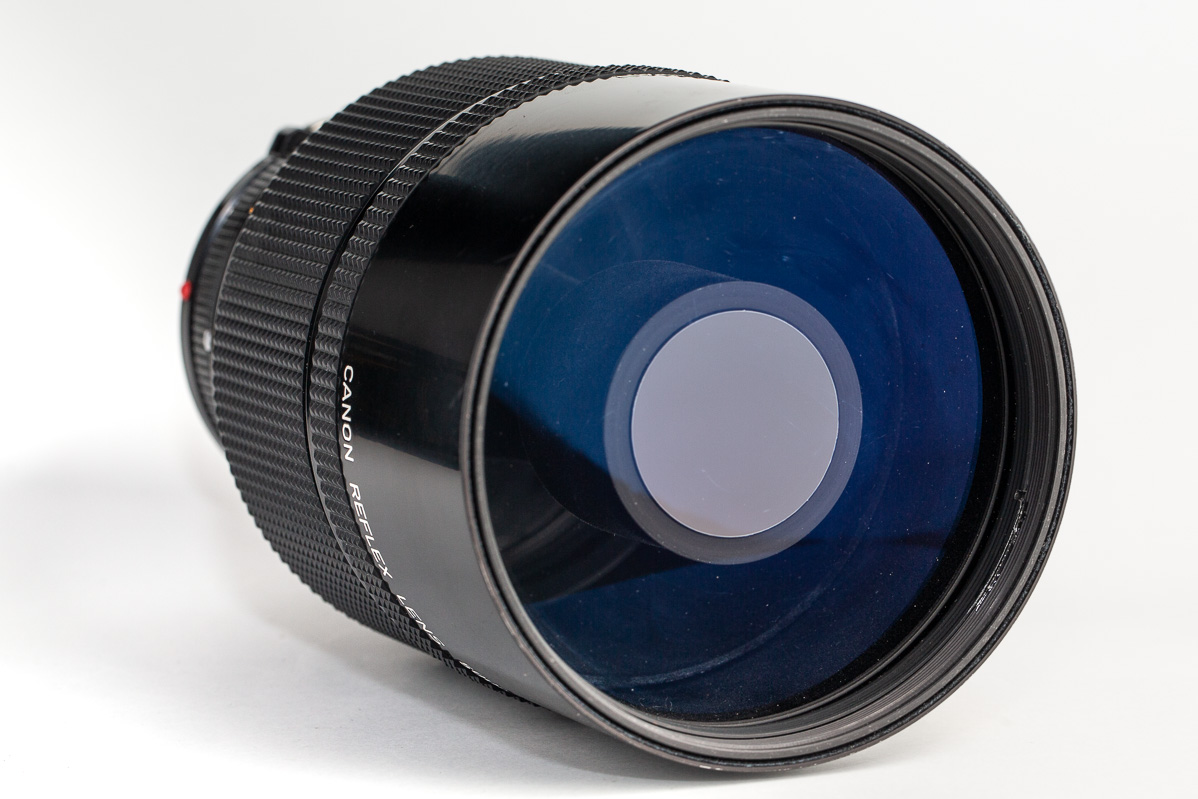 heute stelle ich Euch ein Objektiv vor, das hier noch nicht behandelt wurde, das Spiegellinsenobjektiv Canon Reflex Lens 500 mm 1 : 8. Dieses existierte zu Canon FD-Zeiten in zwei Versionen, die sich nur durch den Anschluss unterscheiden : die ältere Version von 1978 hat noch das Klemmringbajonett, während die jüngere von 1980 das neue Drehbajonett besitzt. Beiden gemeinsam ist der optische Aufbau mit einem Haupt-und Fangspiegel und mehreren Linsen (6 Elemente in 3 Gruppen), die für eine relativ kurze Bauform sorgen. Verglichen mit anderen Objektiven dieses Typs ist das Canon Spiegellinsenobjektiv aber weder besonders kurz (Länge 146 mm) noch leicht (710 g). Der Durchmesser des vordersten Elements ist ebenfalls beachtlich : bei 80 mm und einer Brennweite von 500 mm ergibt sich rein rechnerisch ein Öffnungsverhältnis von f/6,25 - dieses dient sicherlich dazu, den Lichtverlust durch den Fangspiegel auszugleichen und damit die angegebene Lichtstärke von f/8 weitgehend zu erhalten.