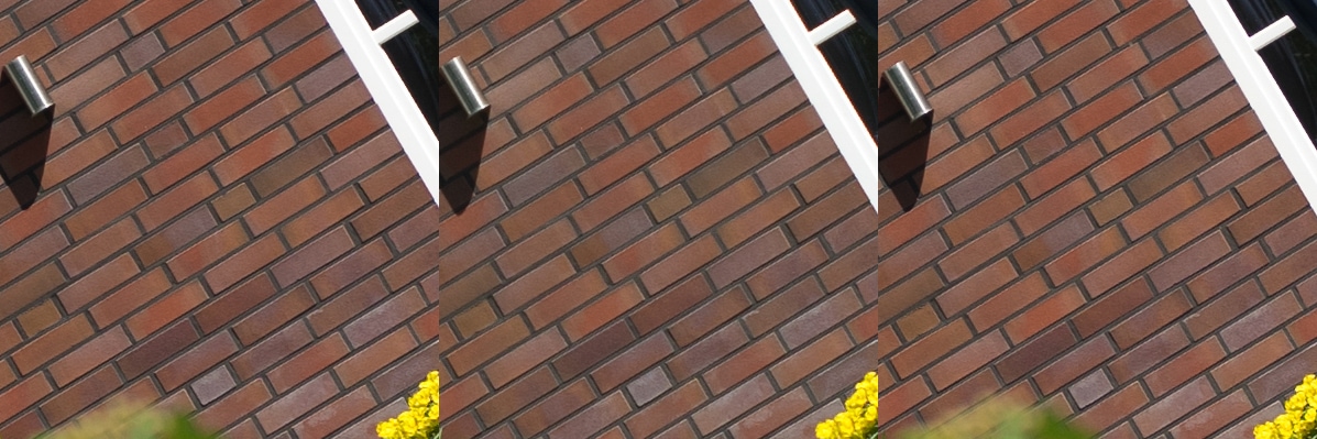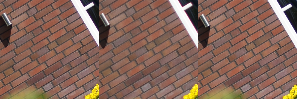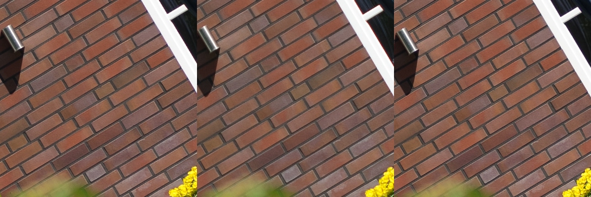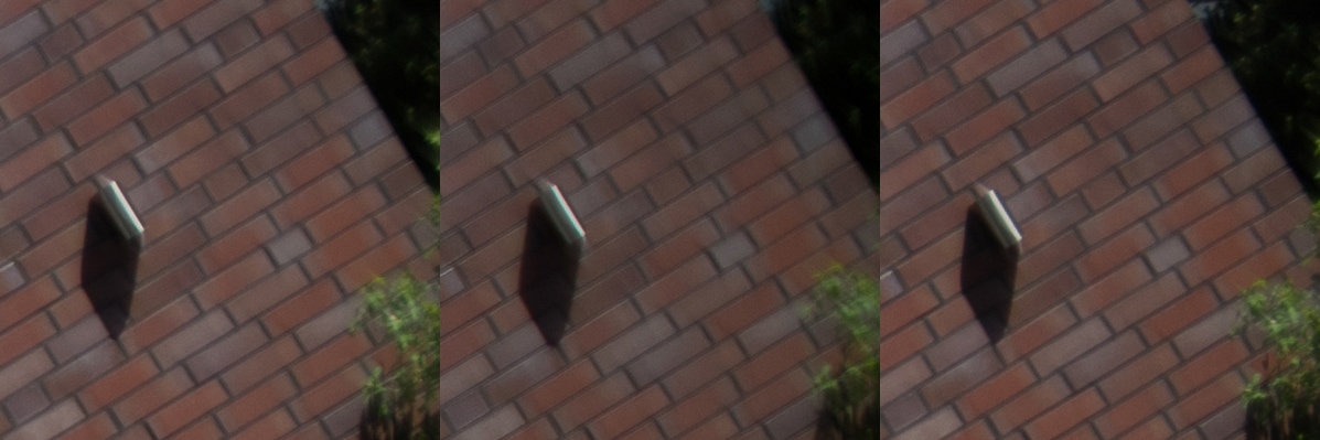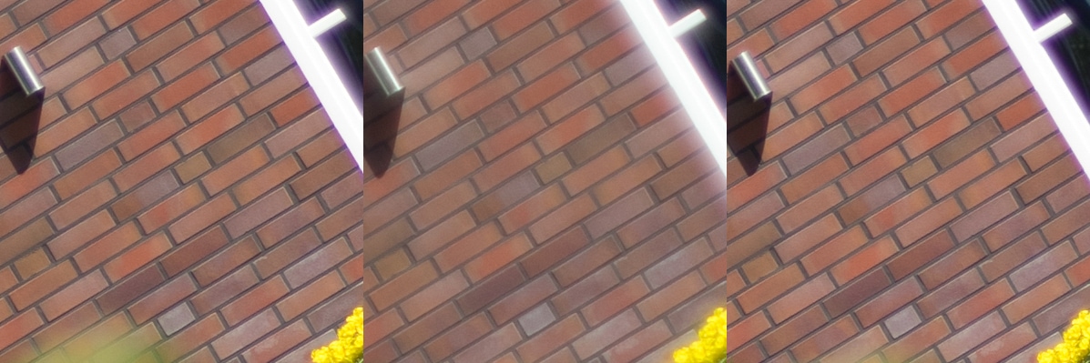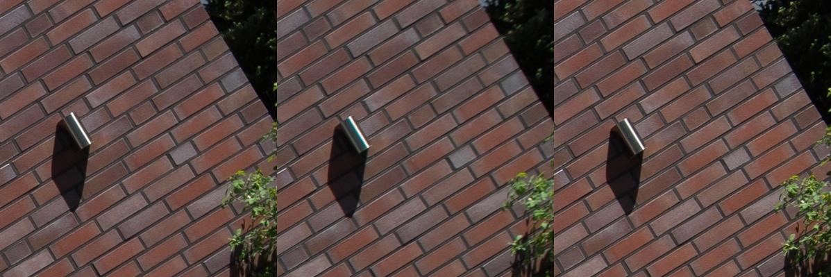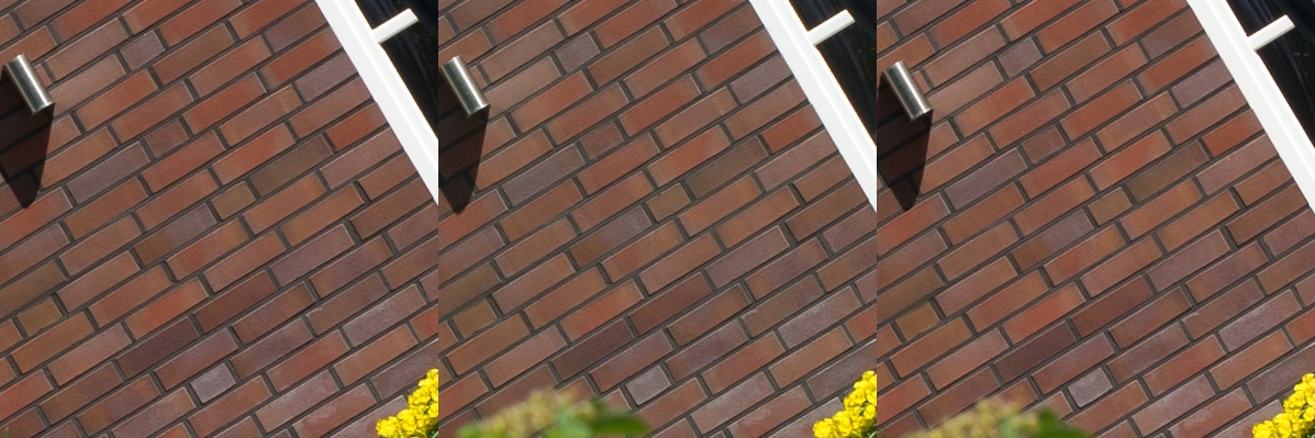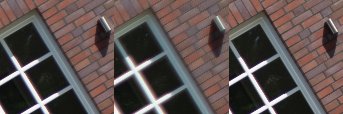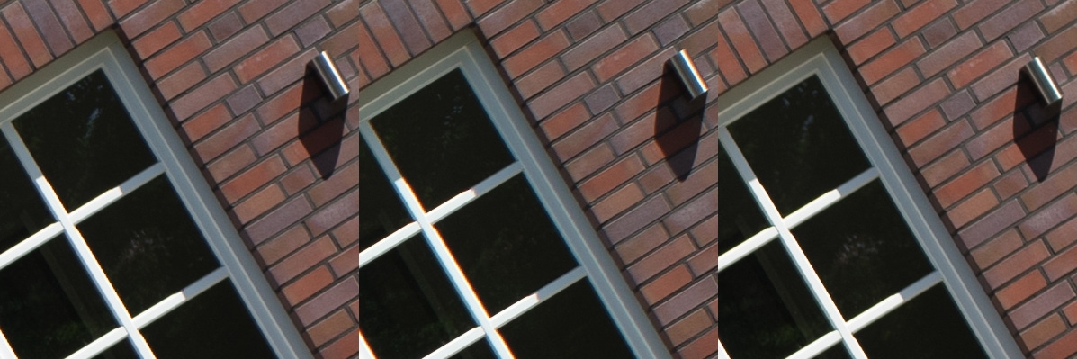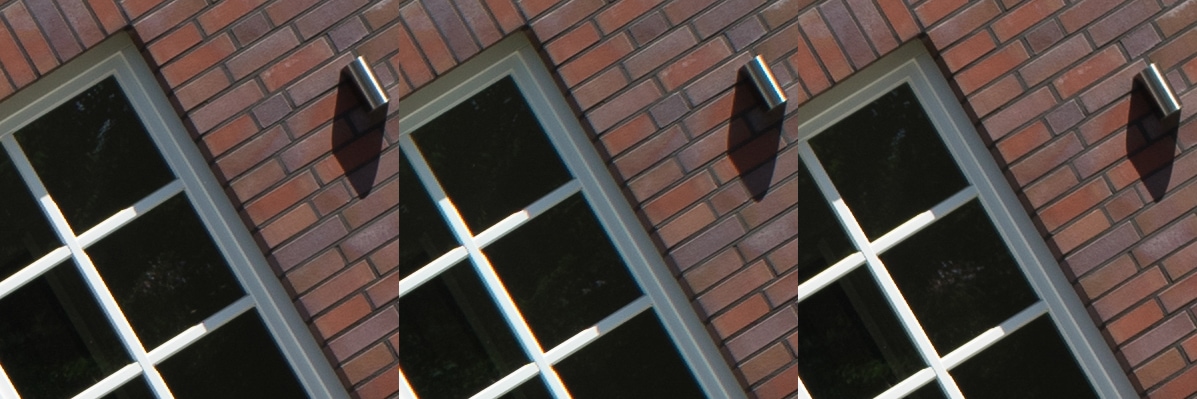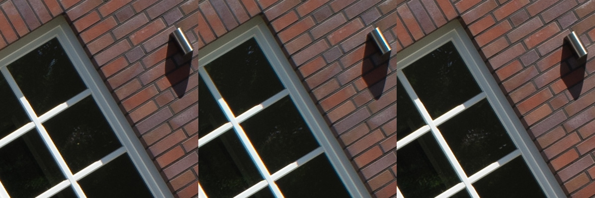 Aus diesen Bildern habe ich dann Center, Midframe und Corner gecroppt, die schauen wir uns hier an, im 100 % Pixelpeepmodus.
