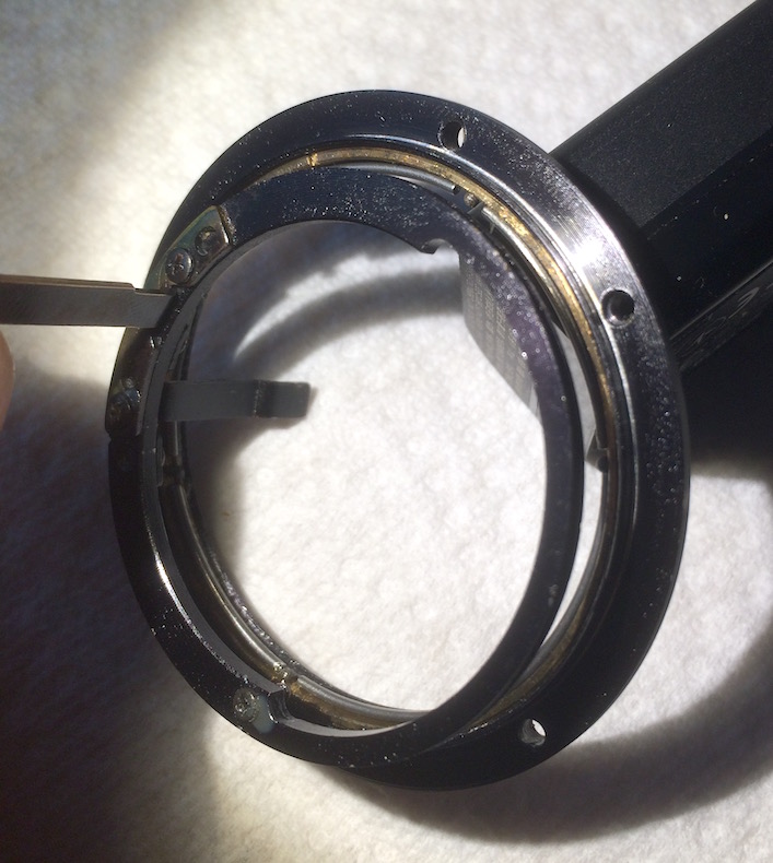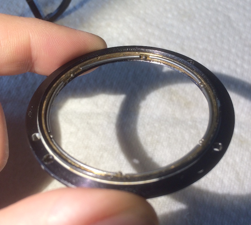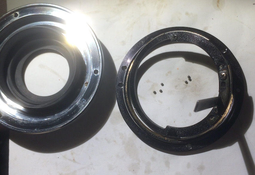 Hab heute ein kleines Tokina Zoom ( 25-50mm f4) geöffnet um es zu reinigen, da is der MD mount auseinandergefallen. Es geht um den inneren Ring, an dem der Blendenhebel sitzt.. er besteht aus zwei Ringen, einen inneren Messingring und einen äusseren der dann in den eigentlichen schweren MD mount geschraubt wird. Der innere läuft im äusseren durch eine Art Kugellager das aus sechs kleinen gebogenen Teildrähten plus sechs winzigen Kügelchen dazwischen zusammengesetzt ist.