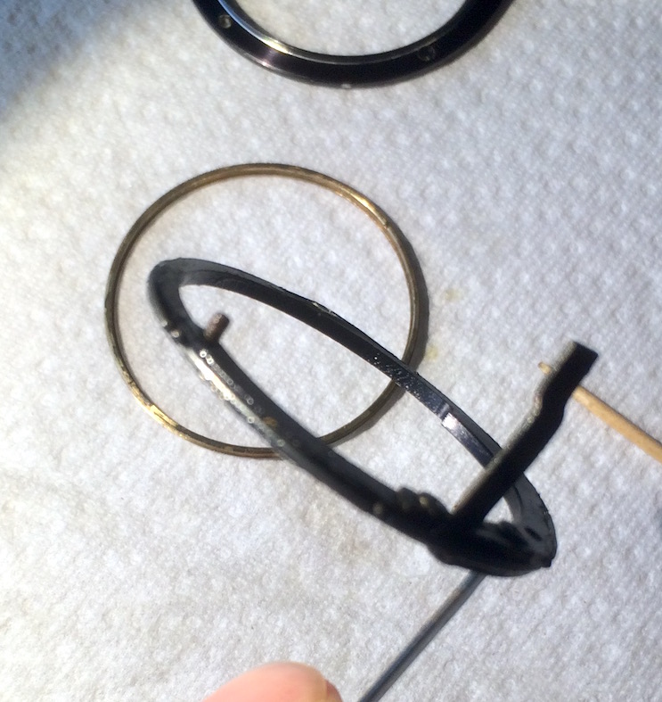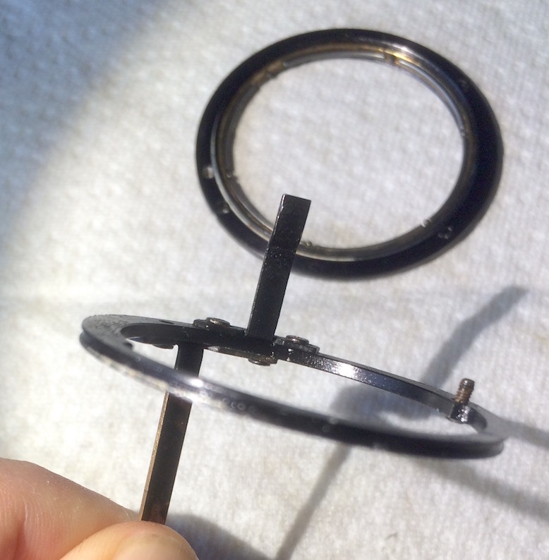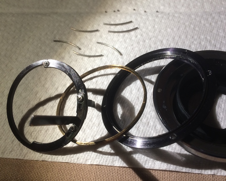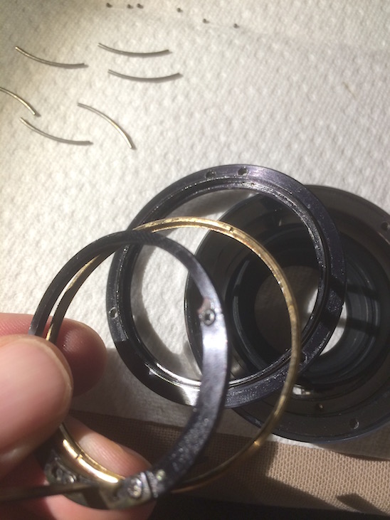 Entweder kann man diese Lagersystem (aus Stäbchen und Kügelchen, so nenn ich das jetzt mal) seitlich um den Blendenhebelring herum installieren oder im Messingring. Anders halten beide Ringe gar nicht aneinander.