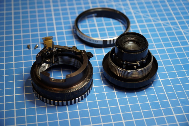 Also beim Zusammenschrauben des Mittelteils (auf dem Foto rechts) und dem Außenteil (auf dem Foto links) kann ich alles sauber zusammensetzen, Blende öffnet und schließt in allen Varianten, wie sie soll. Fokussiere ich, kann ich von Unendlich bis kurz vor 35 cm drehen, danach, fällt das Innenteil heraus.