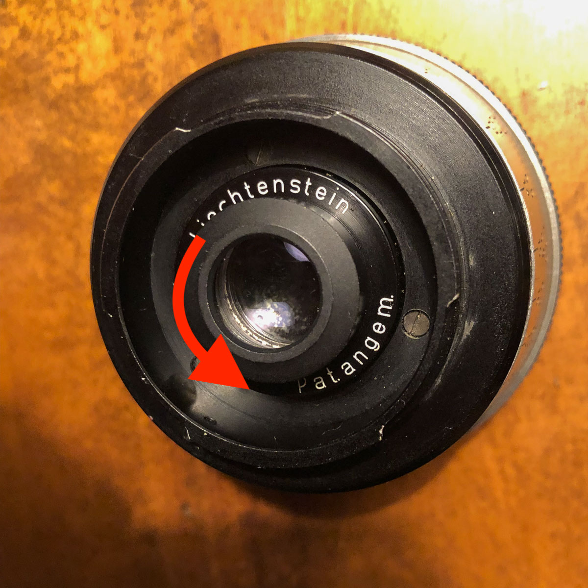 Somit kann die vordere Linse entnommen werden und die Blende ist von vorn frei zugänglich bzw. bei geöffneter Blende auch die zweite Linse.