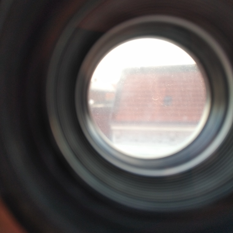 Das Glas selbst ist oberflächlich angegriffen evtl Glaskorrosion. Dieses Objektiv lässt sich trotz Plastik öffnen.