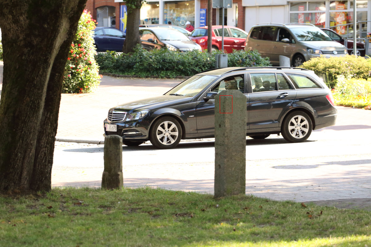 Deshalb zunächst zwei Bilder, bei denen der AF quasi bei einem vorbeifahrenden Auto - trotz diverser bei der Nachverfolgung zufällig ins Bild geratener Hindernisse/Ablenkungen - dem Objekt einwandfrei und schnell folgt.