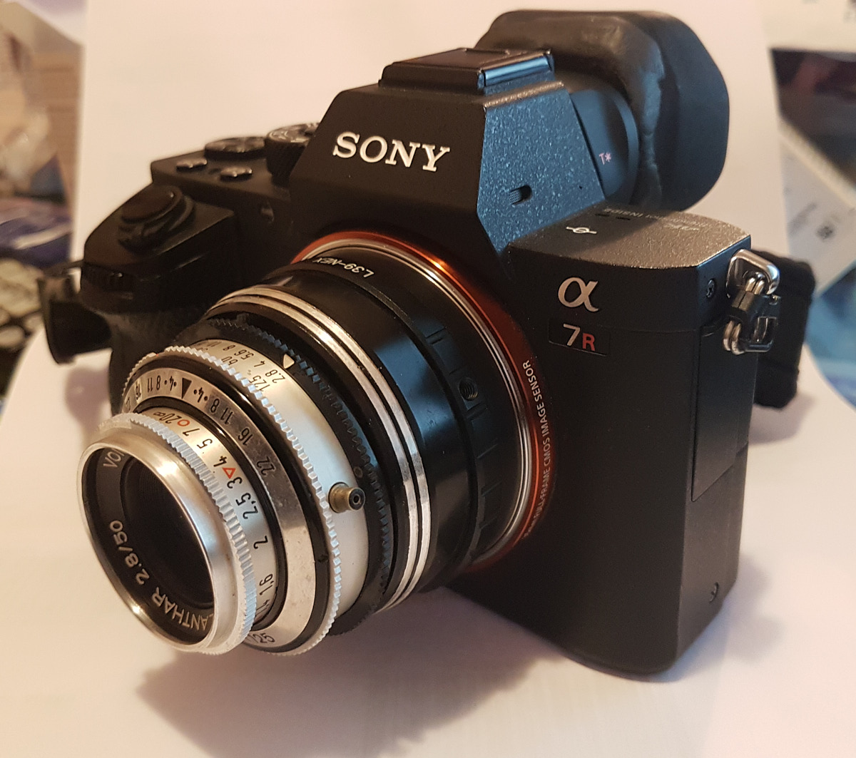 M39 auf Sony E-Mount-Adapter und an die Sony Alpha 7R II montiert (man will ja doch gleich sehen, wie sich das Objektiv an der Großen macht.).