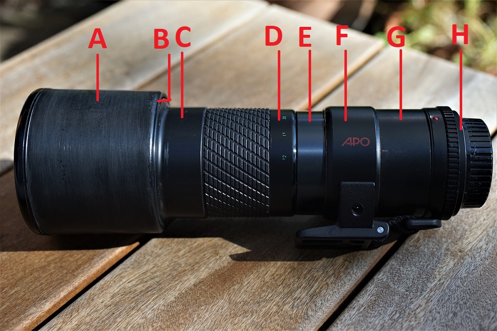 Die Stativschelle, der restliche Tubus und der Blendenring (F, G H) ließen sich dann