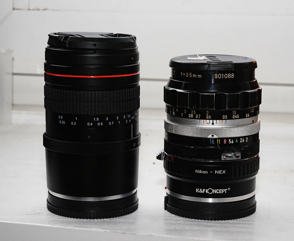 Das Glas wiegt 360g, ist also etwas leichter als mein Nikon Nikkor-O 2.0/35mm mit E-Mount-Adapter.