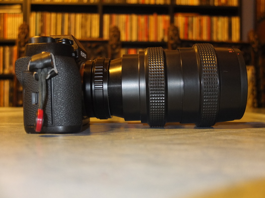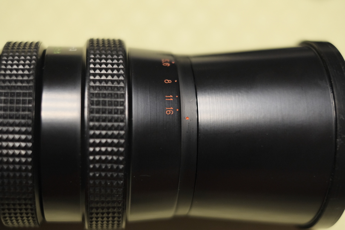 Seltsam ist für mich die fehlende Entfernungsskala, es gibt gar keine Skalen auf dem Objektiv. Ebenso wenig kann ich mir die verschiedenen Anfangsblendenwerte erklären. 2,8 auf der Bezeichnung, die Blendenskala geht aber erst ab 3,2 los. Darunter lässt sich auch nichts drehen, während man sichtbar über die 16 hinaus drehen kann. Auch merkwürdig, das bei mittels M42-Adapter an die Kamera angeflanschtem Objektiv die Blendenzahlen ca. 45 Grad zur Seite geneigt sind, anstatt sich mittig oben am Objektiv zu befinden, ein Fokussieren auf Unendlich ist damit möglich.