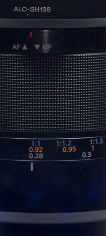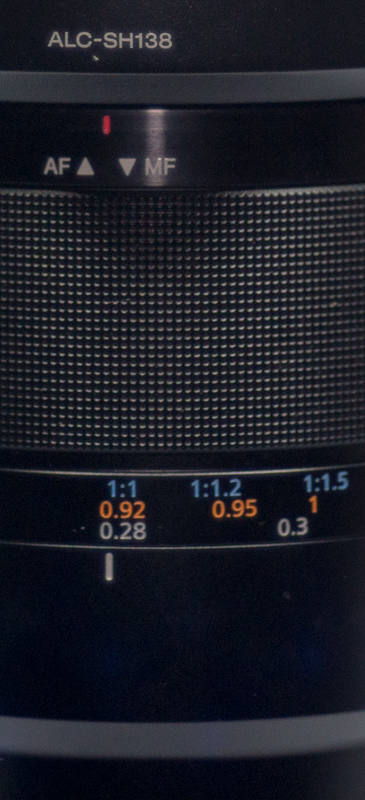 Es geht bis zu einem Maßstab von 1:1 und verdoppelt dabei seine Länge. Der Fokusring braucht knapp 360 Grad von Unendlich bis 1:1 und bietet einen angenehmen Wiederstand.