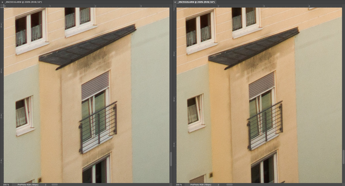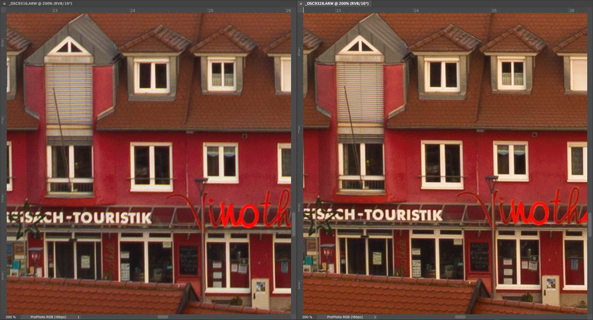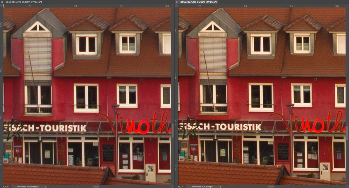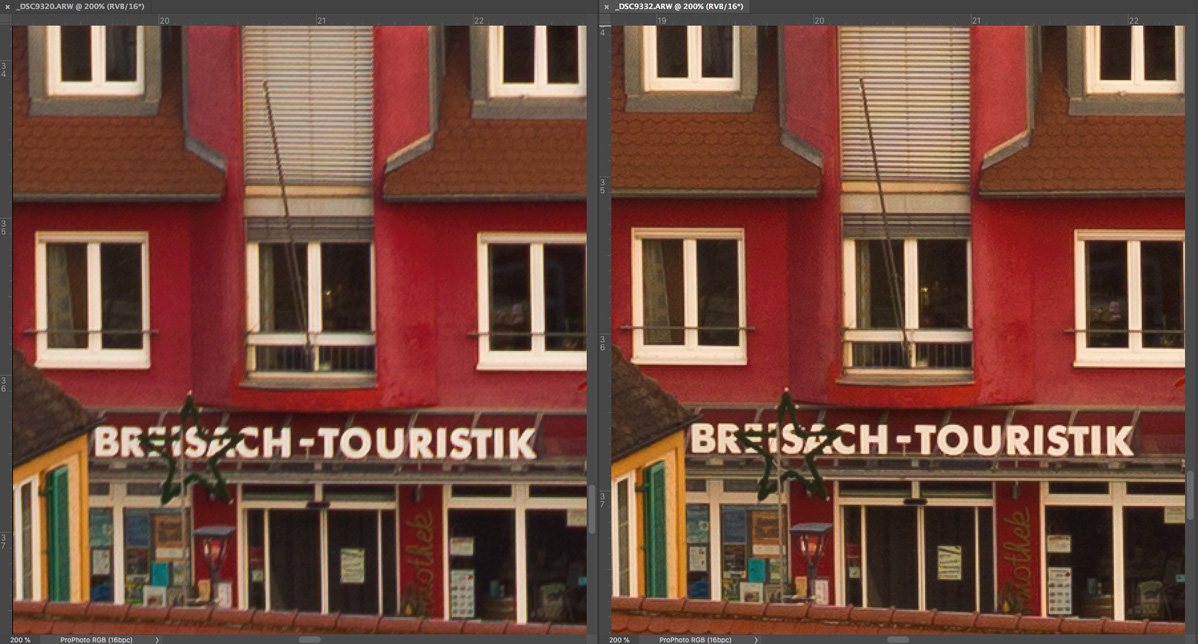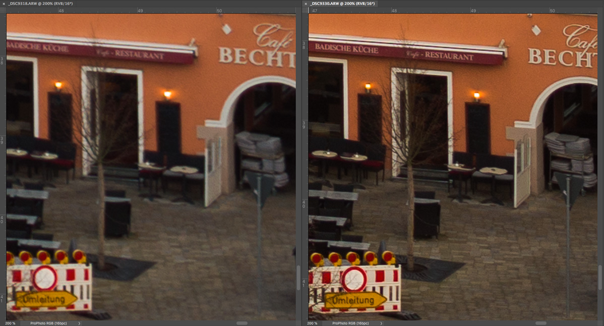Bei der Beurteilung der Fotos sollte man bedenken, dass es sich um 200 % -Ausschnitte von 36 Megapixel-Aufnahmen handelt, die sonst selbst auf sehr grossen Abzügen unsichtbare Unterschiede zu Tage bringen.