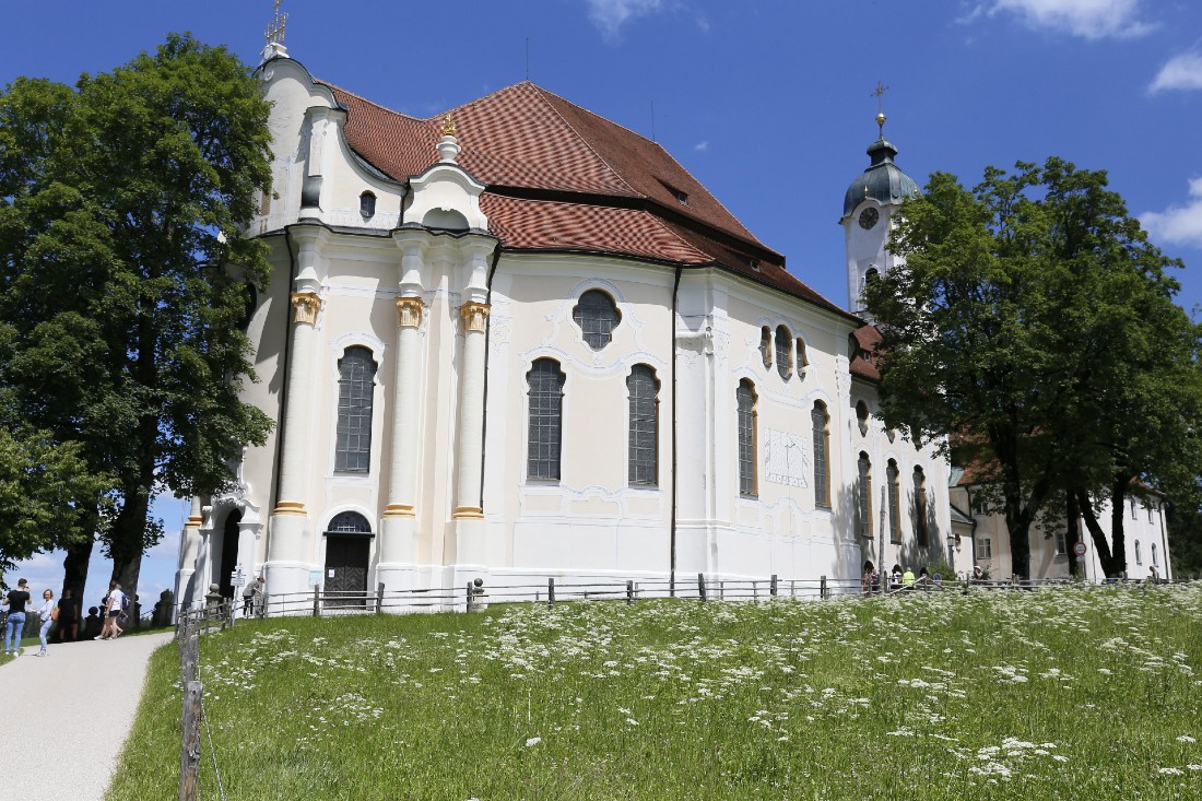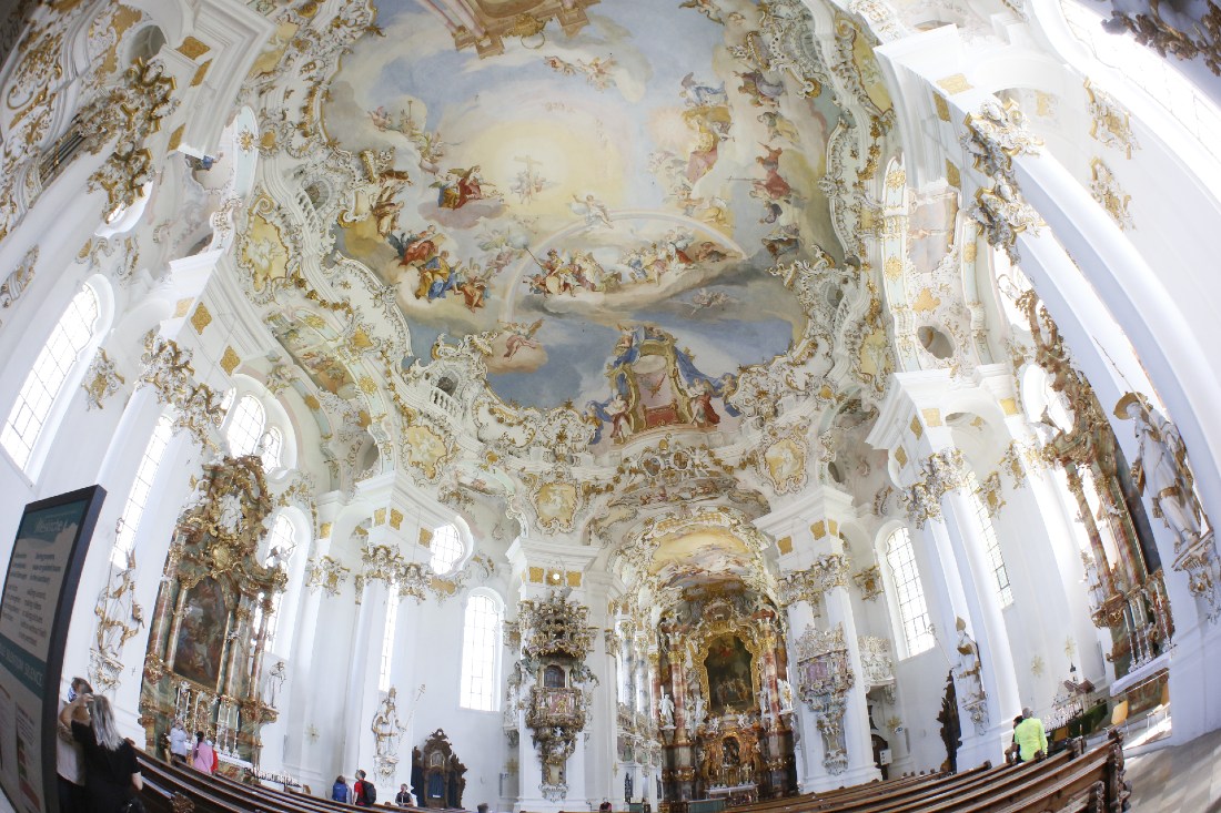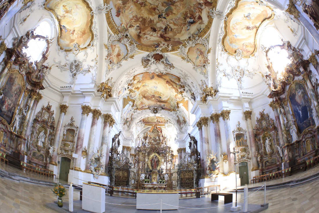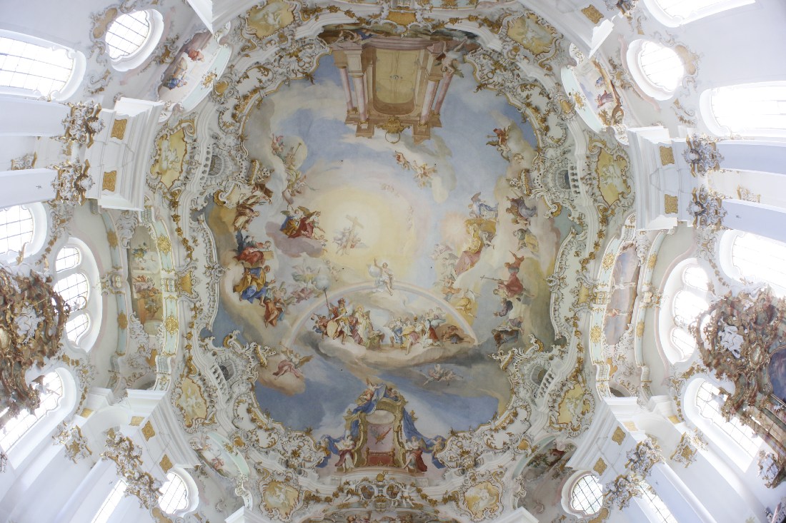 Aufgefallen ist mir auch der wunderbar weiche Übergang von den hellen Fenstern zu den dunkleren Partien im Bild. Die Überbelichtung ist von mir gewünscht, eine im Vergleich dunklere Belichtung läßt die Leichtigkeit der Malereien und Reliefs trist wirken.