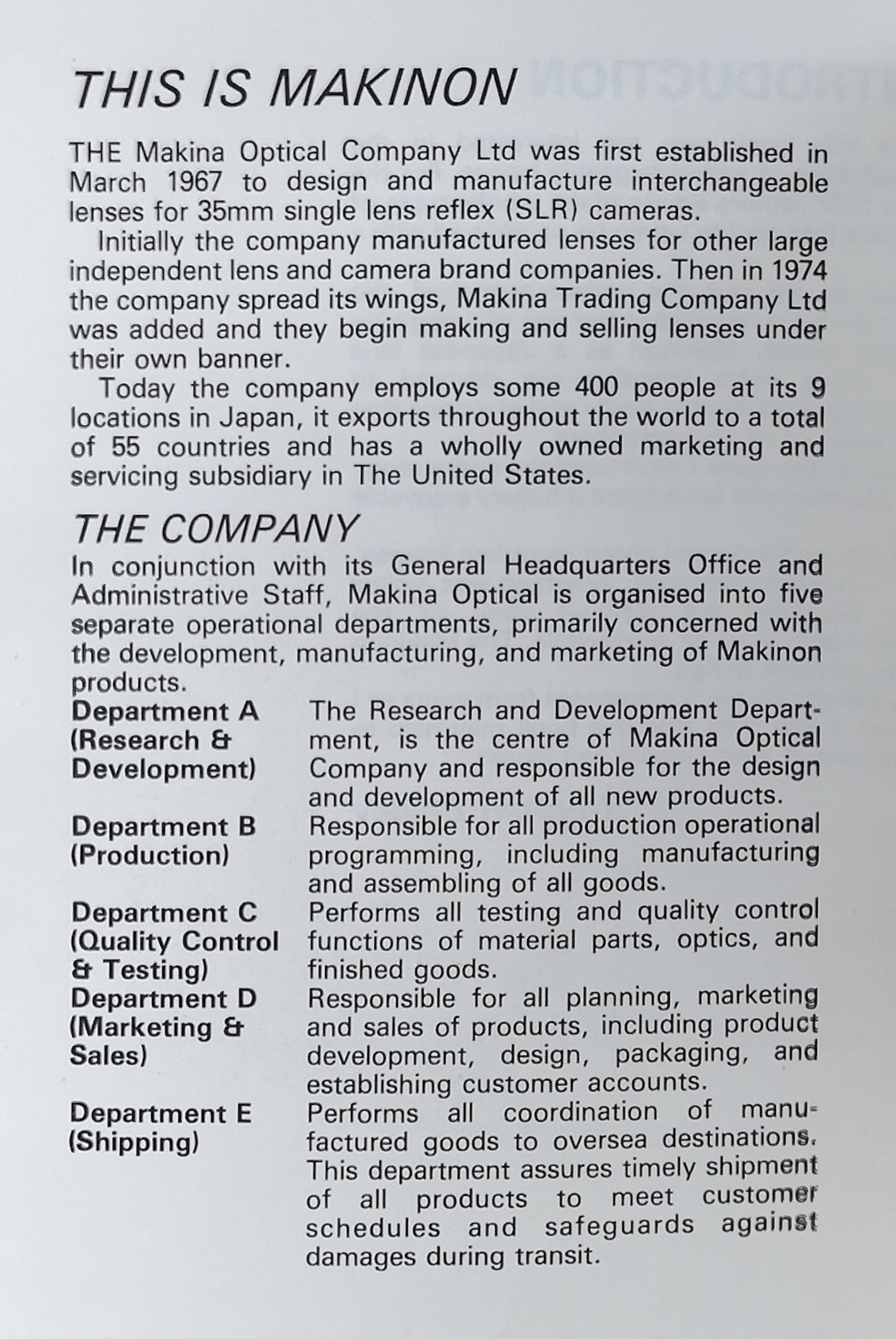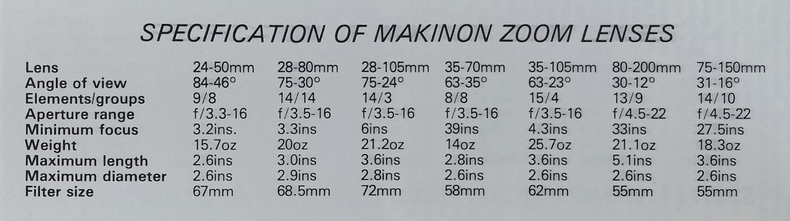 Ich hänge das mal hier an, ein paar Seiten aus der Broschüre Makinon Lens Photography von Stephen Bayley. Das Büchlein wurde 1983 bei Dorkstar Ltd in UK publiziert um die Verkäufe dort zu stimulieren. Inhaltlich ist es so das übliche in eben solchen Büchern. Was man so mit den verschiedenen Brennweiten aufnehmen kann und soll, ein paar Bilder der Objektive und ein paar Beispielbilder. Leider gibt es keine Linsenschnitte und zu den einzelnen Objektiven nur rudimentäre Angaben. Die Listen sind darüberhinaus nicht komplett, es gibt also mehr Objektive von Makinon, als im Buch angegeben. 35mm oder 200mm fehlen beispielsweise bei den Primes, bei den Zooms ist nur ein 28-80 gelistet, obwohl es zweit gab. Aber auch der Eintrag bei http://camera-wiki.org/wiki/Makina_Optical ist nicht vollständig.