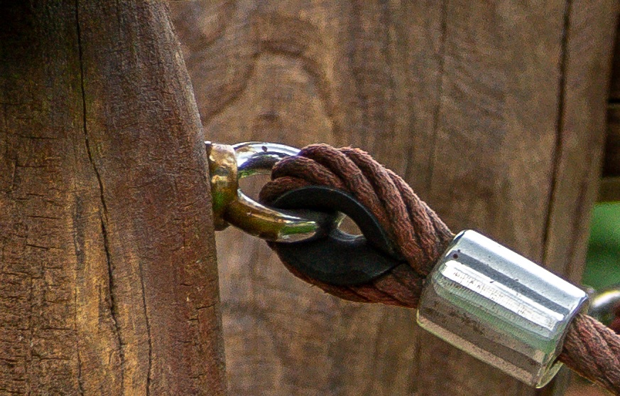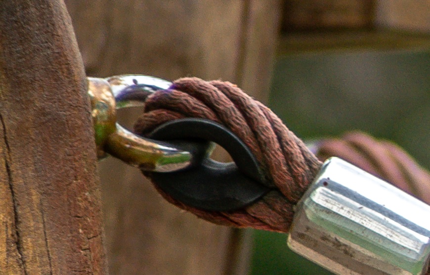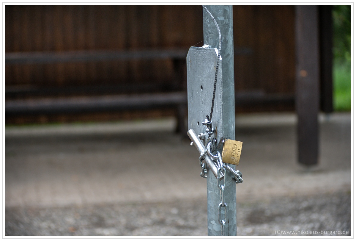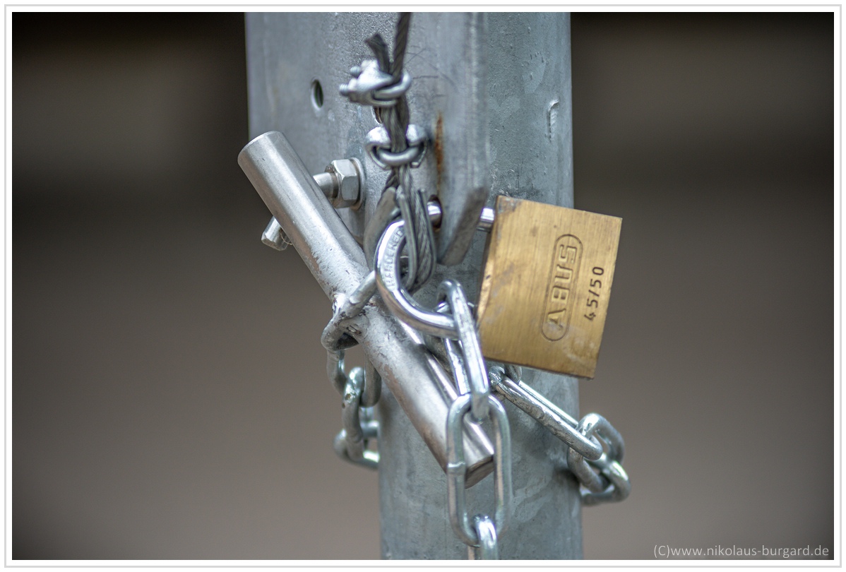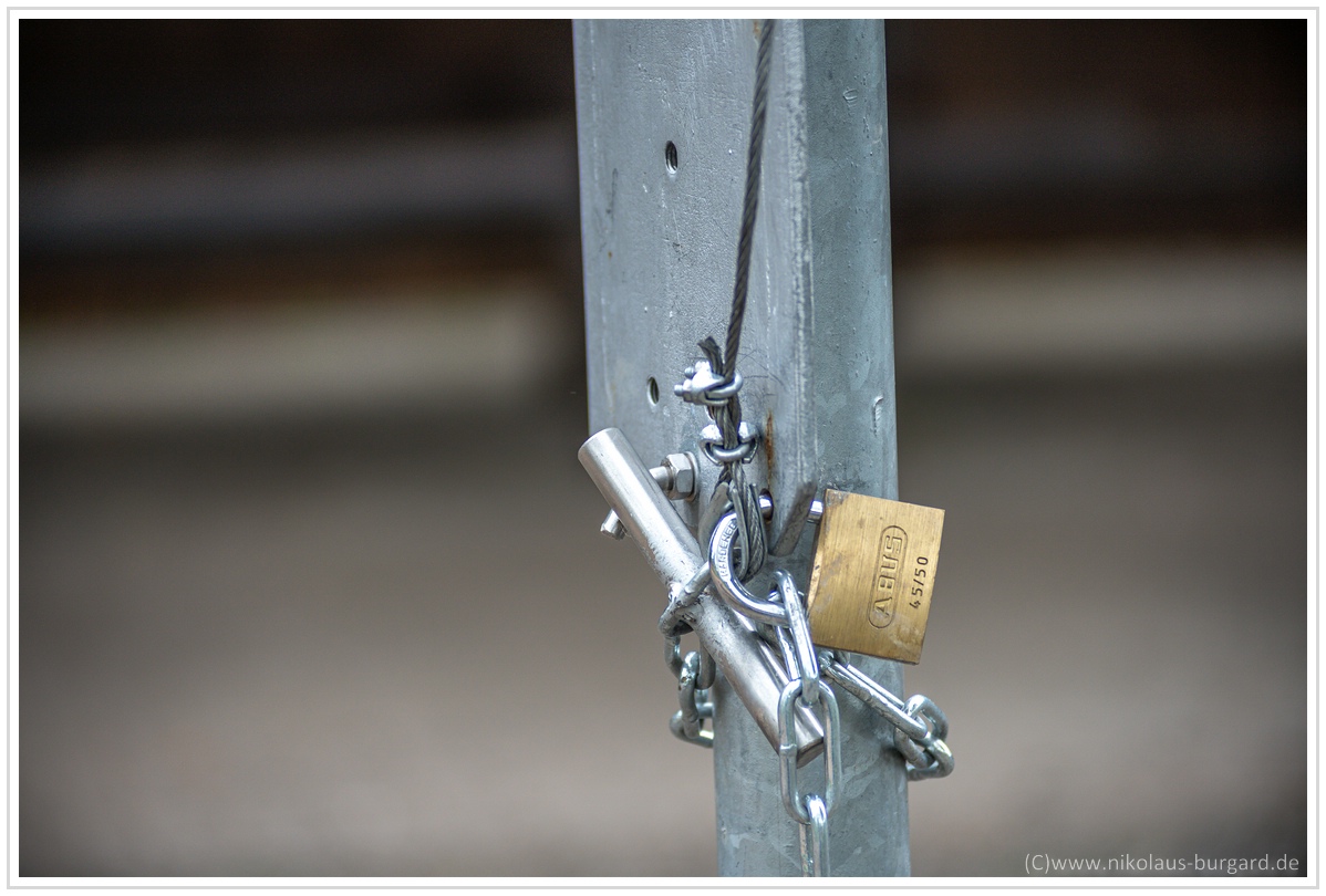 Scharfgestellt hatte ich auf das unterhalb des Schlosses diagonal verlaufende Kettenglied. Man sieht deutlich die lila-/magentafarbenen Farbfehler vor der Schärfeebene bei allen Brennweiten.