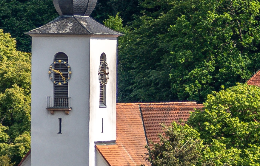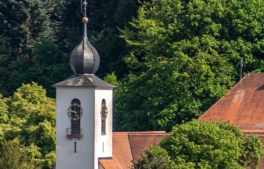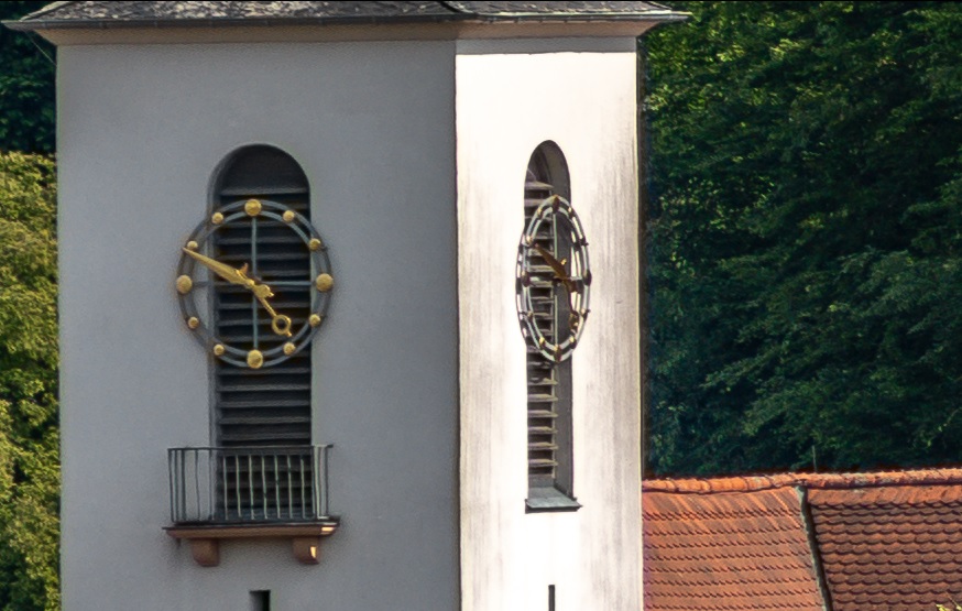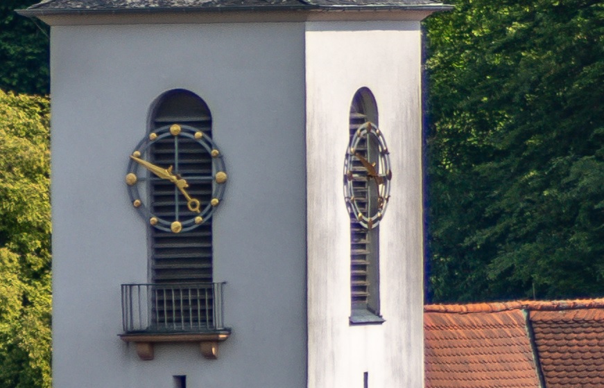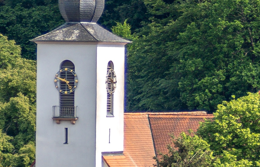 Am Kirchturm sieht man bei Offenblende wieder die Farbfehler an den Kontrastkanten, aber das ist kein Beinbruch.