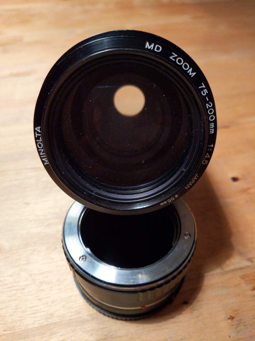 Weniger für den Einsatz an meinen Digitalkameras, sondern hauptsächlich für die Analogfotografie habe ich für ein paar Euro ein Minolta MD Zoom 4.5/75-200mm gekauft.