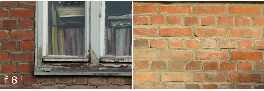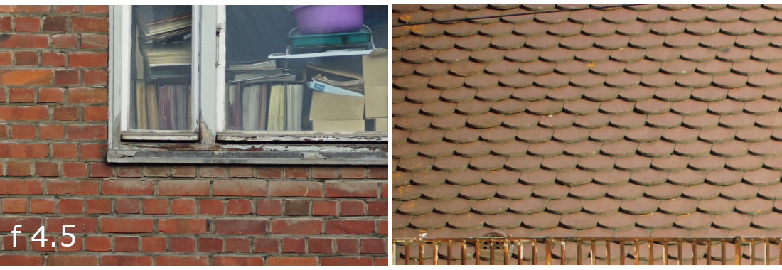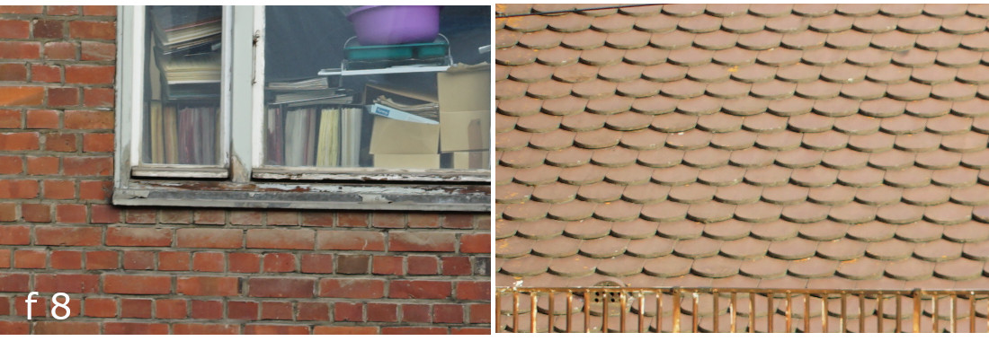 Es folgen Testbilder mit meiner Sony A7II auf das gegenüberliegende ca. 15m entfernte Ziegelgebäude, leider ohne Stativ erstellt und deshalb nicht ganz optimal.