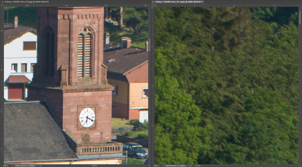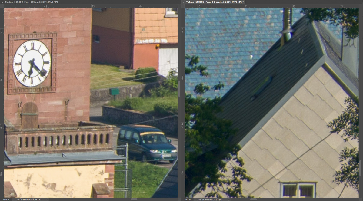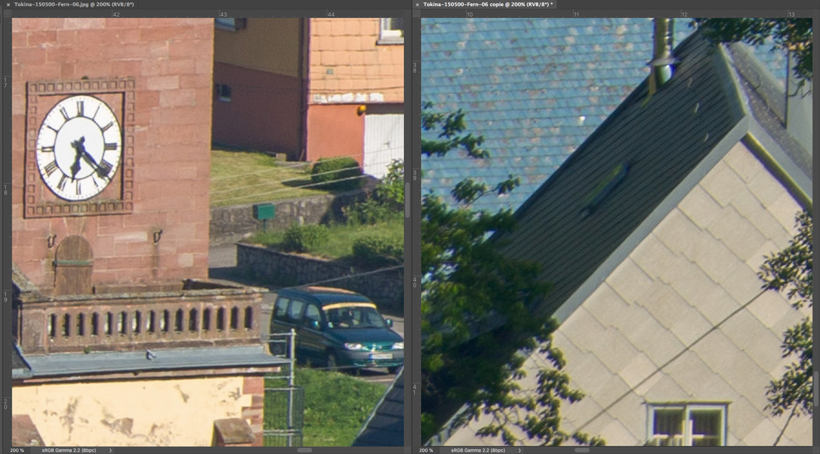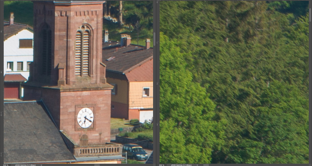 Nachfolgend eine Testserie bei Unendlich, mit der Sony A7R nebst Stativ und 10 s Selbstauslöservorlauf bei 100 ISO fotografiert. Es wurde mit maximaler Lupenvergrösserung auf das Ziffernblatt der Kirchturmuhr scharfgestellt. Die Bilder wurden nur mit Standardeinstellung in Camera Raw geschärft, die chromatischen Abberationen bleiben unkorrigiert. Letztere sind aber sehr moderat und in Camera Raw noch gut beherrschbar. Nach der automatischen Korrektion verschwinden sie fast vollständig. Bedenkt bitte, dass es sich hier um fast ungeschärfte Ausschnitte in 200% - Vergrösserung handelt.