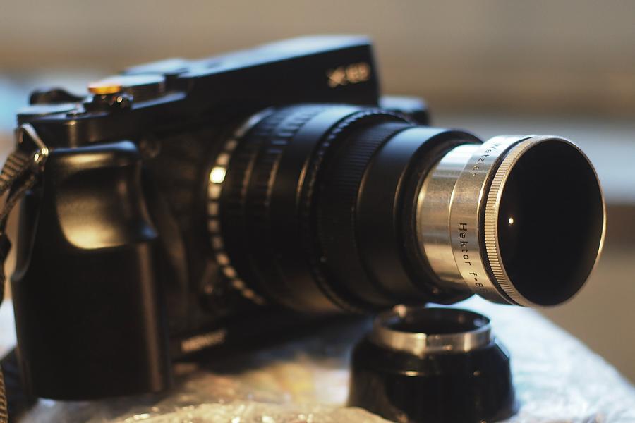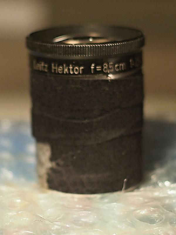 Zu den bestgeeignetsten Objektiven für diese Versuche gehören die Leitz Objektive, davon habe ich das Hektor 2,5/8,5cm gewählt, weil es sehr häufig in alten Projektoren ist (der Vorderring ist schwarz, Durchmesser 35mm)