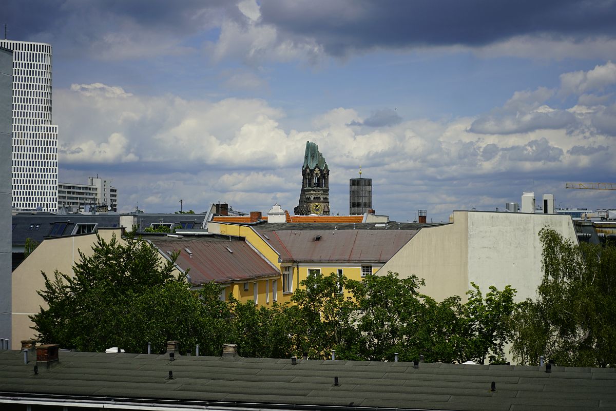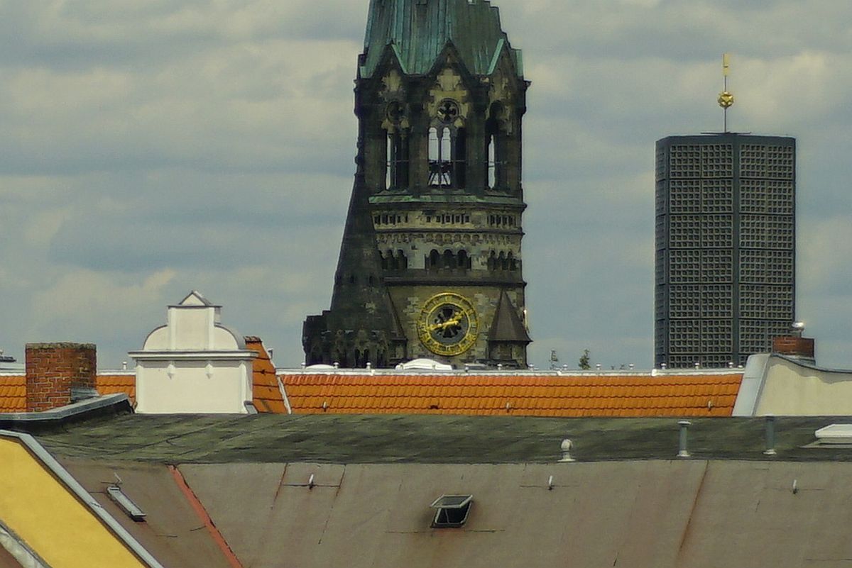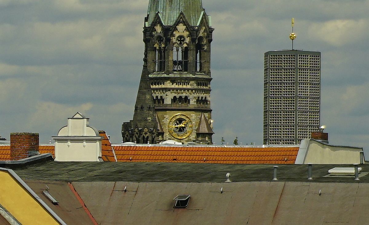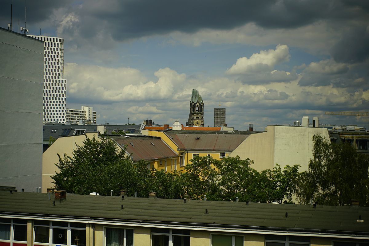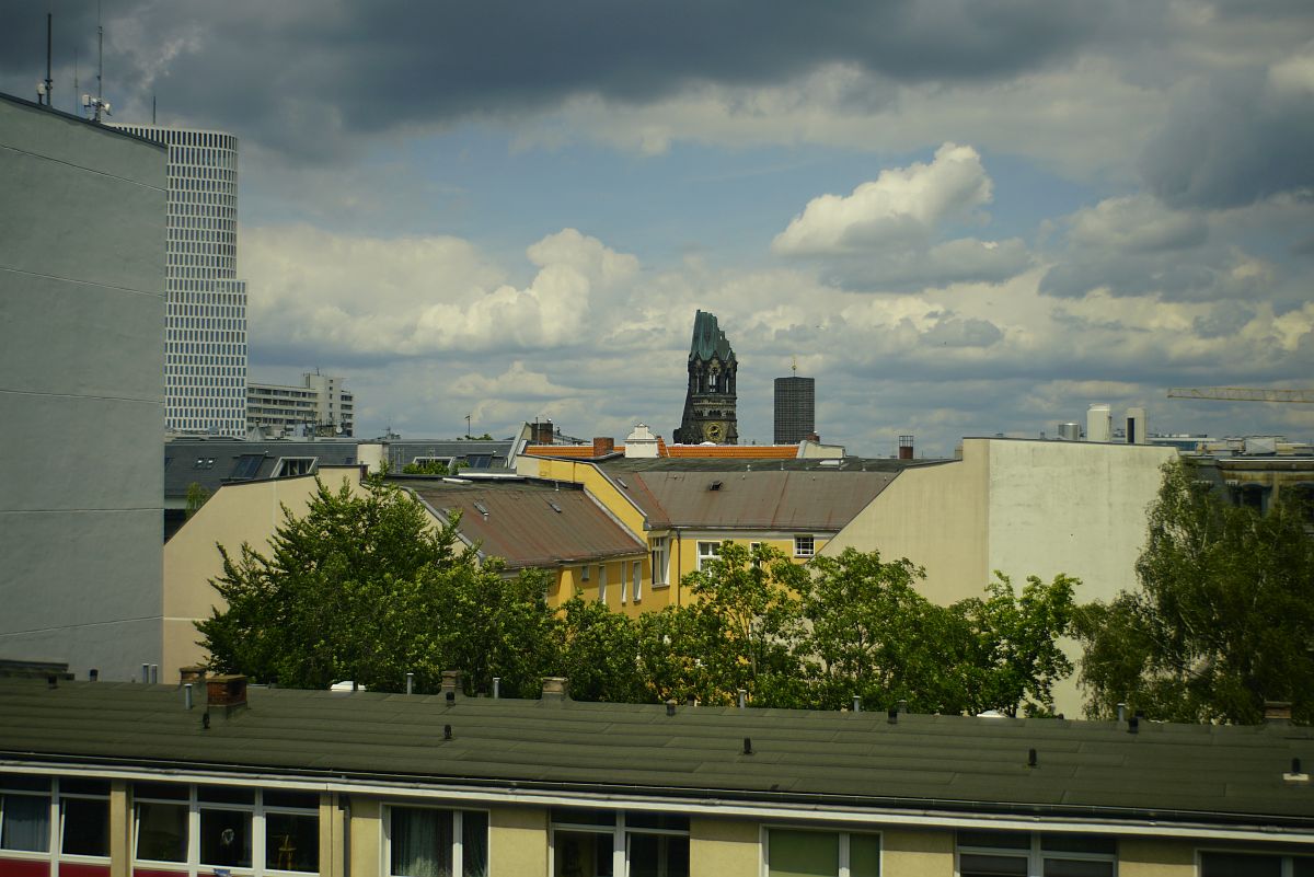 So, jetzt gleich die erste Ergänzung, der Blick aus meinem Arbeitszimmer in der Uni auf die ca. 600m entfernte Gedächtniskirche. Erst Offenblende mit Crop, dann Blende 4,5 mit Crop: