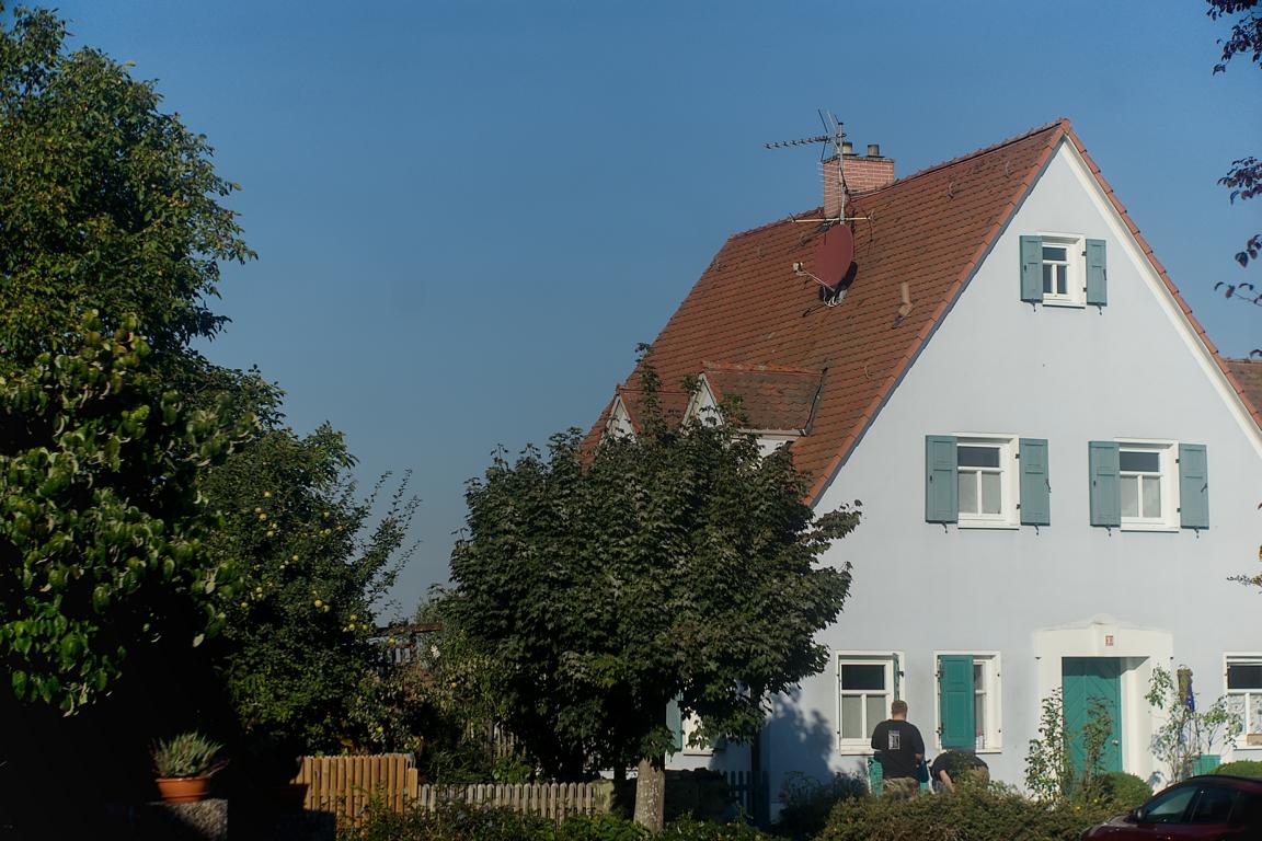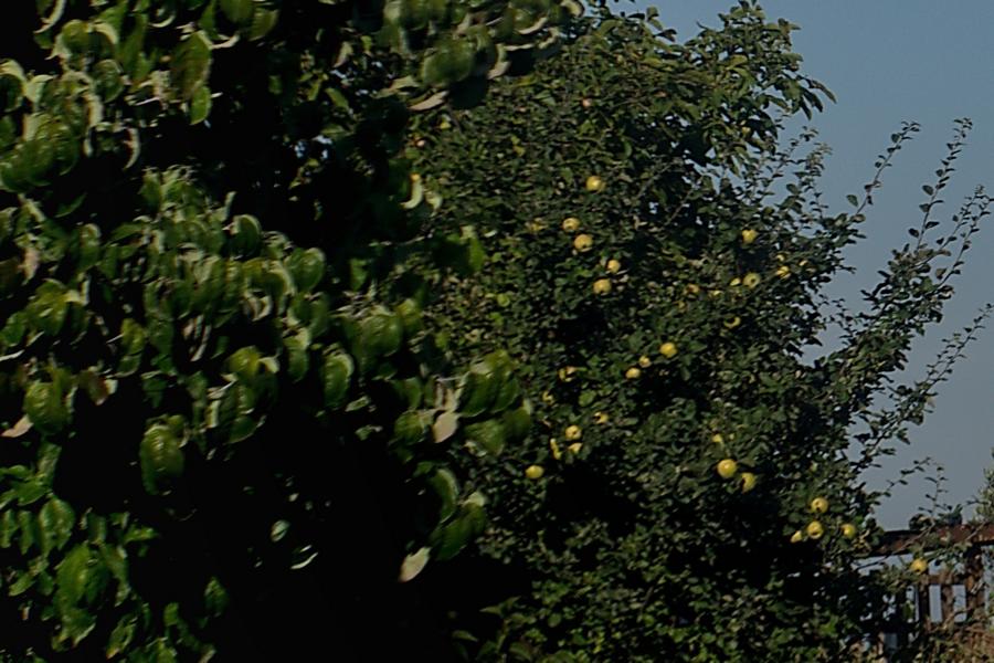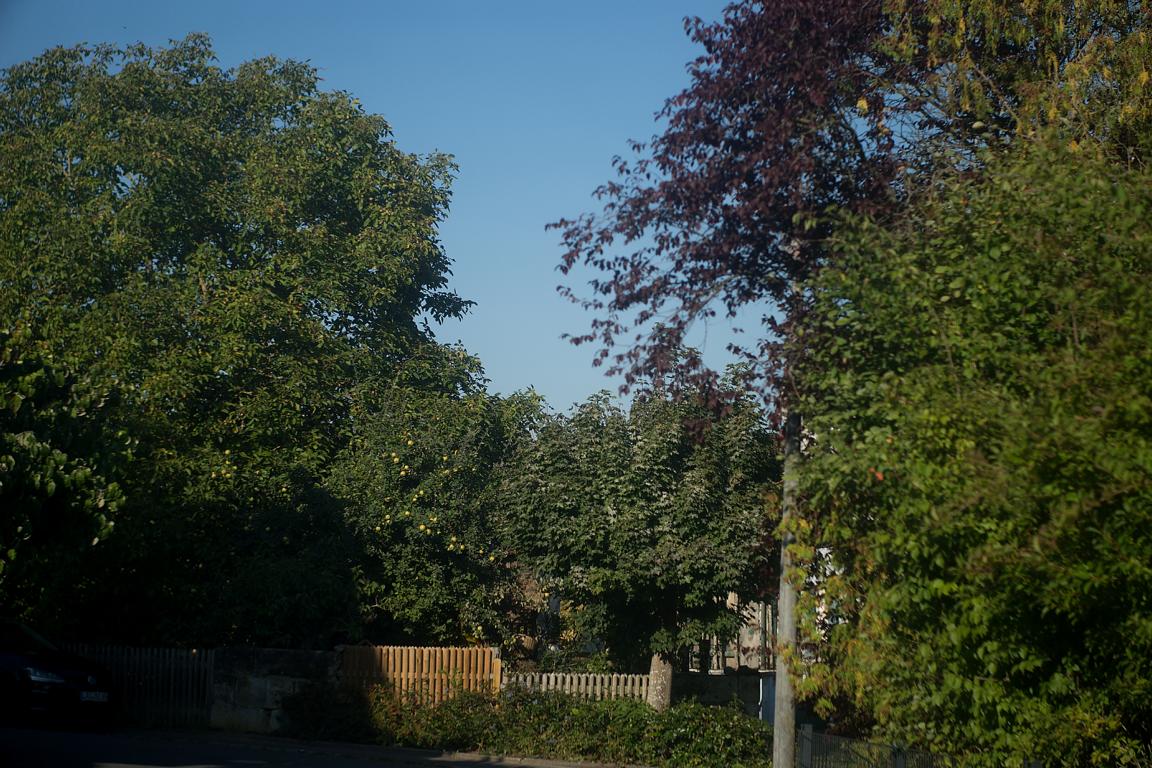 links Mitte der Baum mit den Äpfeln steht etwa 2m vor der Fassade