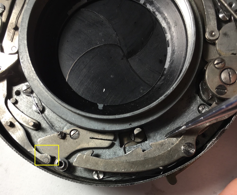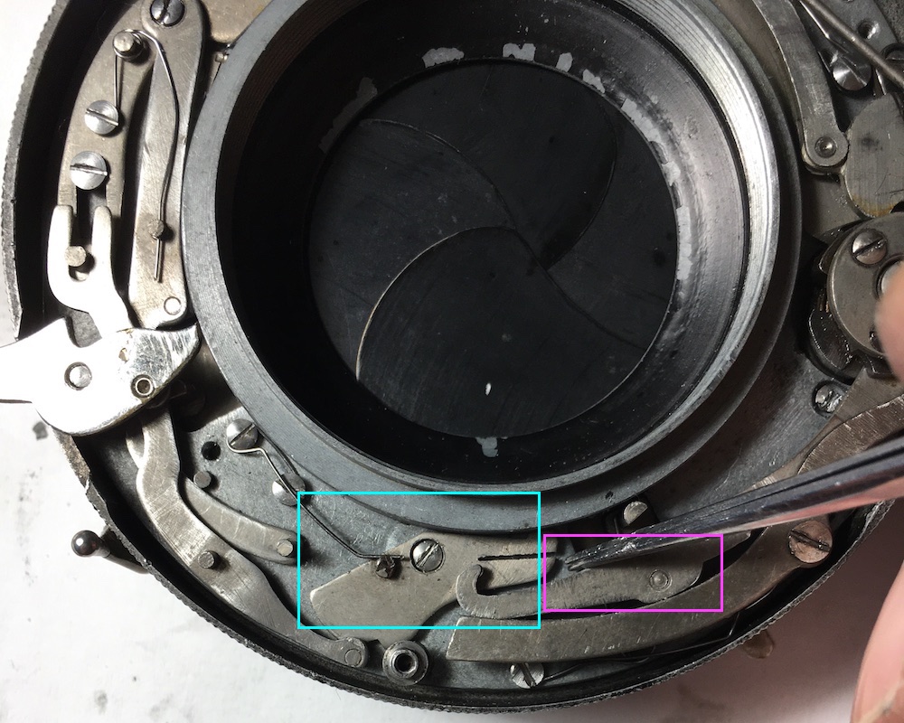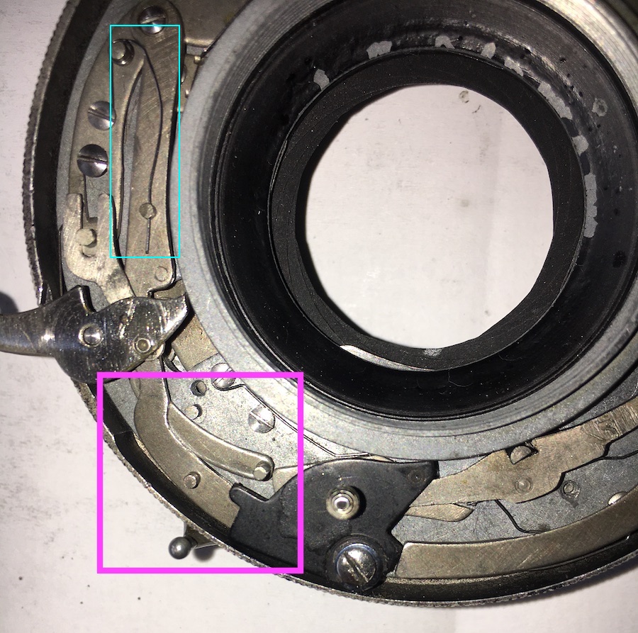 der pink markierte Arm ( auf dem Plan 3a) aktiviert den Blendenhebel, also zum Öffnen des Verschlusses. Unter dem Arm ist eine Feder eingehängt.