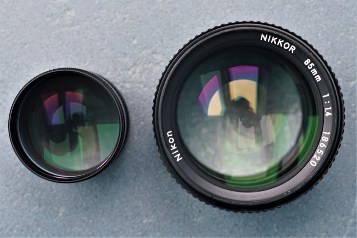 Damit ersichtlich ist, wie klein es ist, habe ich es zusammen mit dem AIS-Nikkor 1,4/85mm abgelichtet: