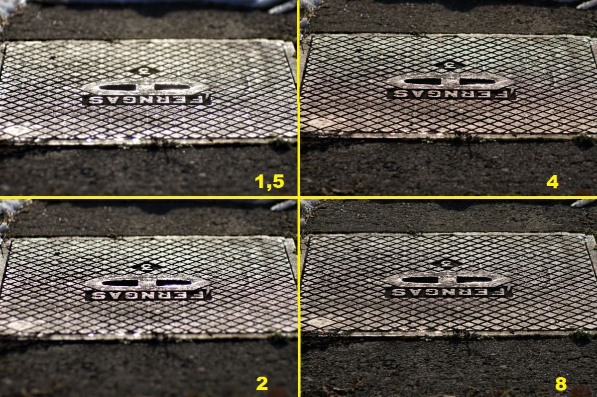 Ich habe die Blendenreihe 1,5 // 2 // 4 // 8 gewählt und jeweils einen crop aus der Bildmitte gezogen.