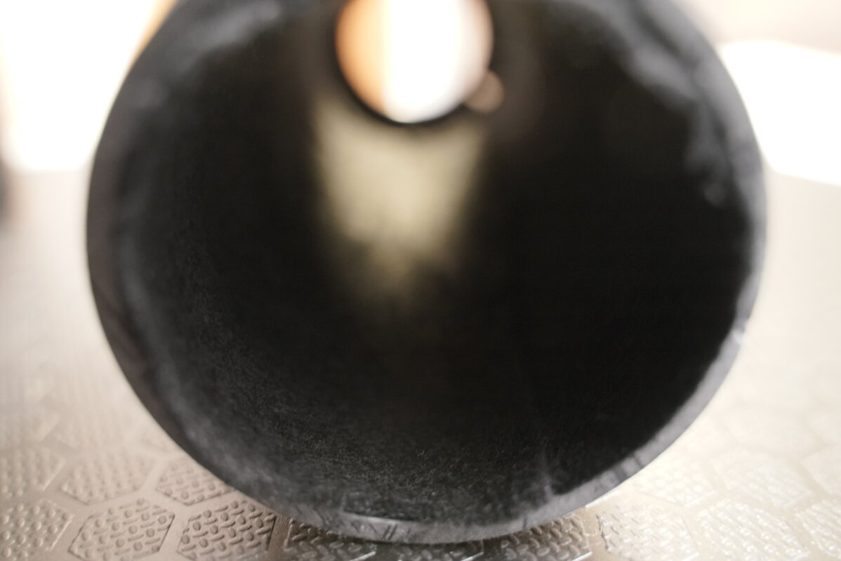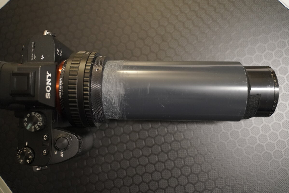 Adaptiert habe ich es an einer Sony Alpha A7 III. Für andere Projektionsobjektive hatte ich schon einen m65 Helicoid mit 62,5mm Aufnahme. Darin habe ich ein passend zugesägtes 63mm PVC-Rohr gespannt. (So 0,5mm abzufeilen ist echt Arbeit...). Die Länge ist so gewählt, das ich bei komplett zusammengefahrenen Helicoid auf unendlich komme. Das PVC-Rohr habe ich von innen mit schwarzem Filz ausgekleidet, da der Kontrast sonst völlig zusammengebrochen wäre. Das Objektiv deckt deutlich größere Formate ab und erhellt somit das ganze Rohr von innen. Das Objektiv habe ich dann in etwas Filz eingerollt und in die vordere Öffnung des Rohrs gequetscht, so dass es fest sitzt. Diese Lösung habe ich erst einmal gewählt, da der Aufbau so wieder komplett reversibel ist und ohne Spezialwerkzeug leicht zu erledigen war.