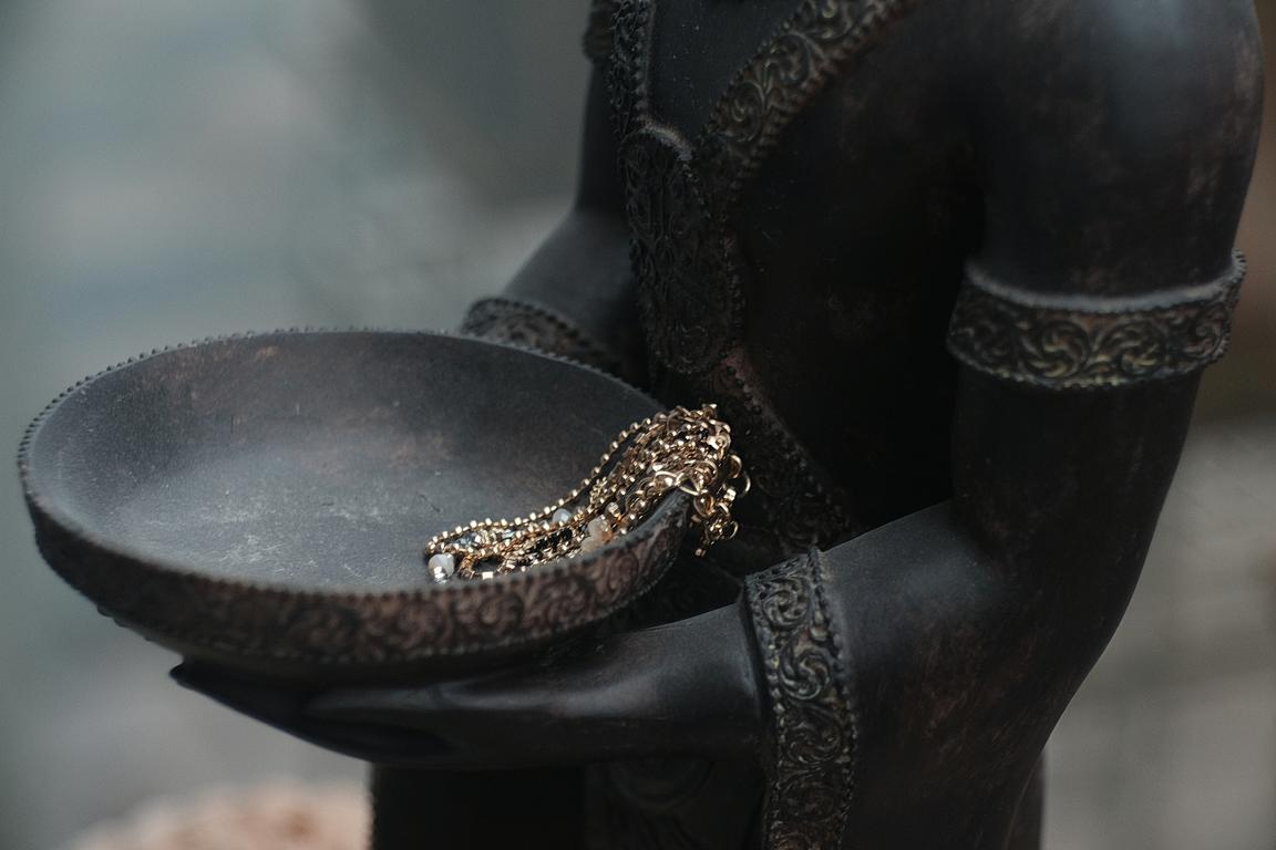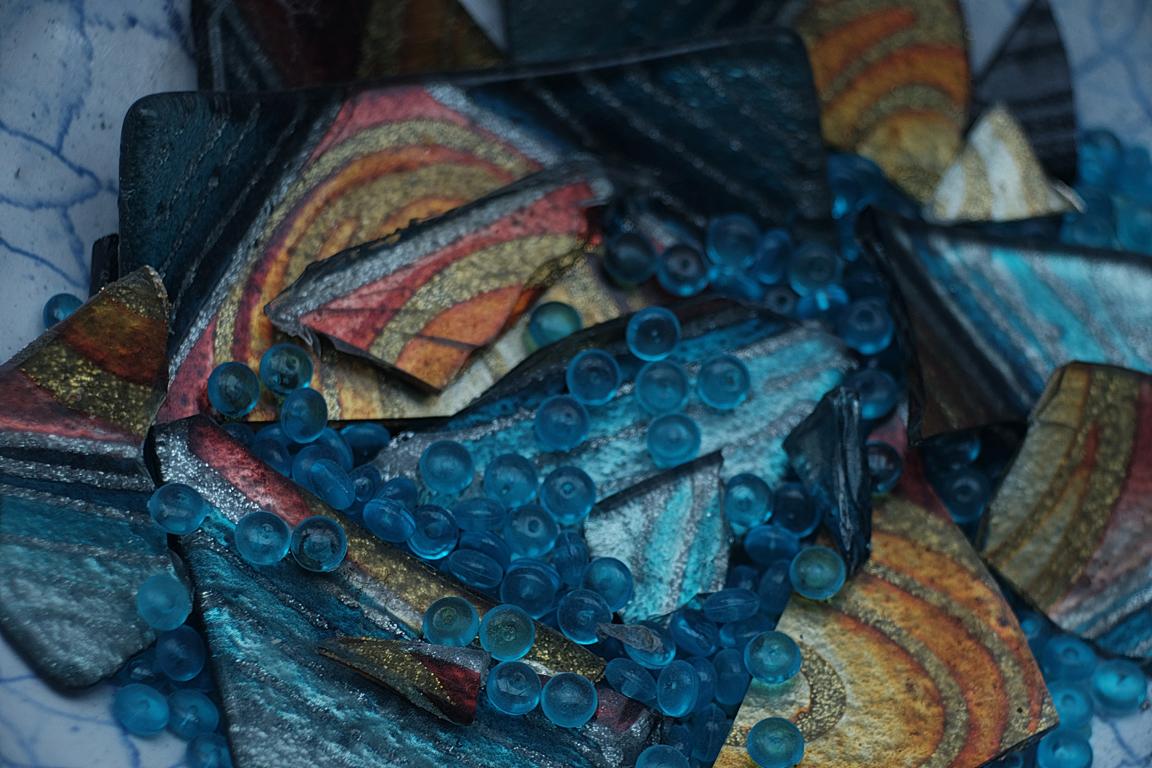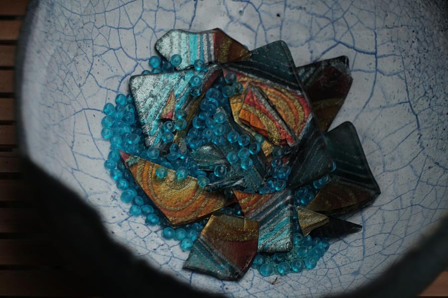 das sind bemalte Keramik-Scherben mit Glaskugeln in einer Halbschale