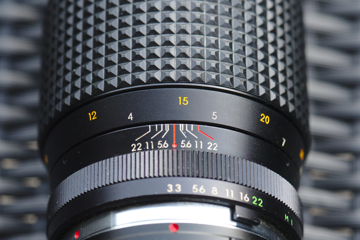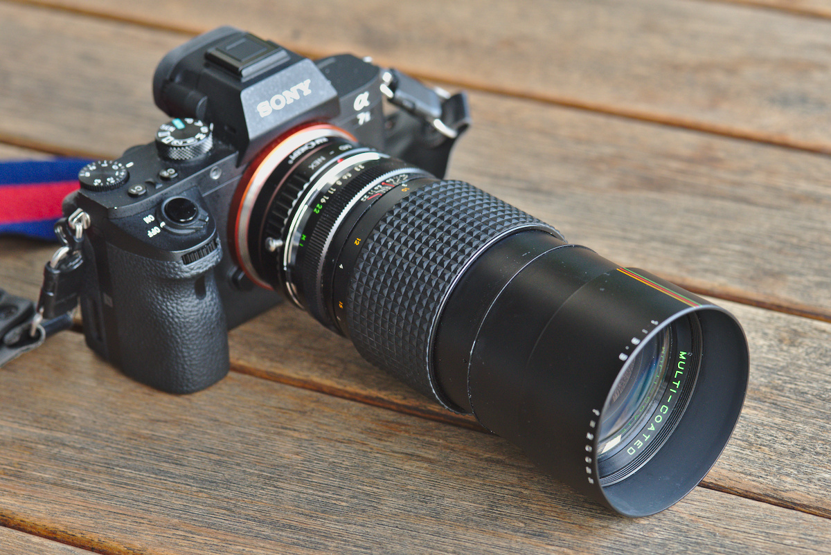 Mein Exemplar hat ein Minolta-Bajonett, andere Anschlüsse gab es natürlich auch. Die Blende zeigt bei f/5.6 die gefürchtete Ninja-Form. Es ist eine Sonnenblende integriert, die sich aber nur ca. 2 cm ausziehen lässt.