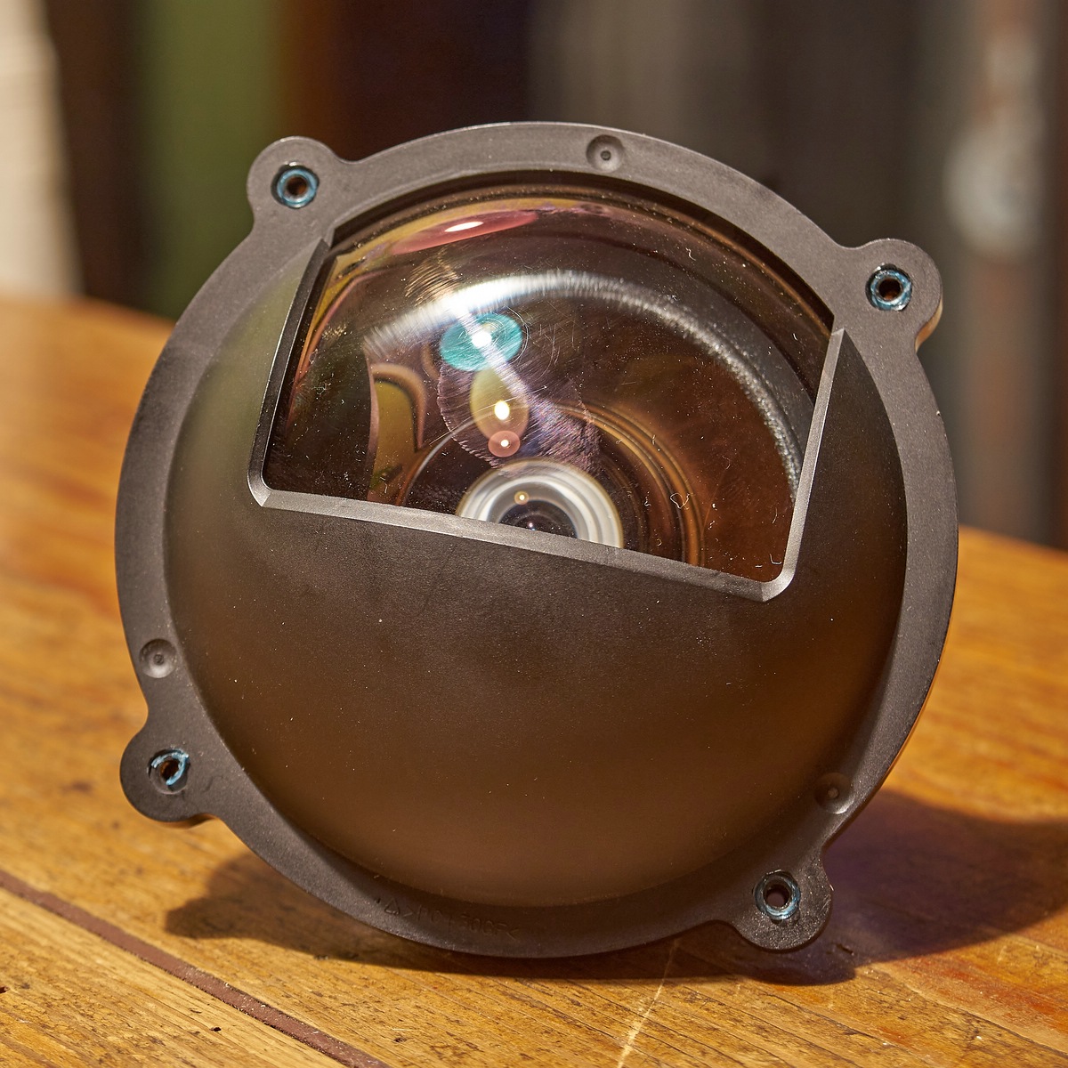 Das Objektiv kam mit einer Kunststoffkappe zur Begrenzung der Projektion, dahinter eine Kunststofflinse :