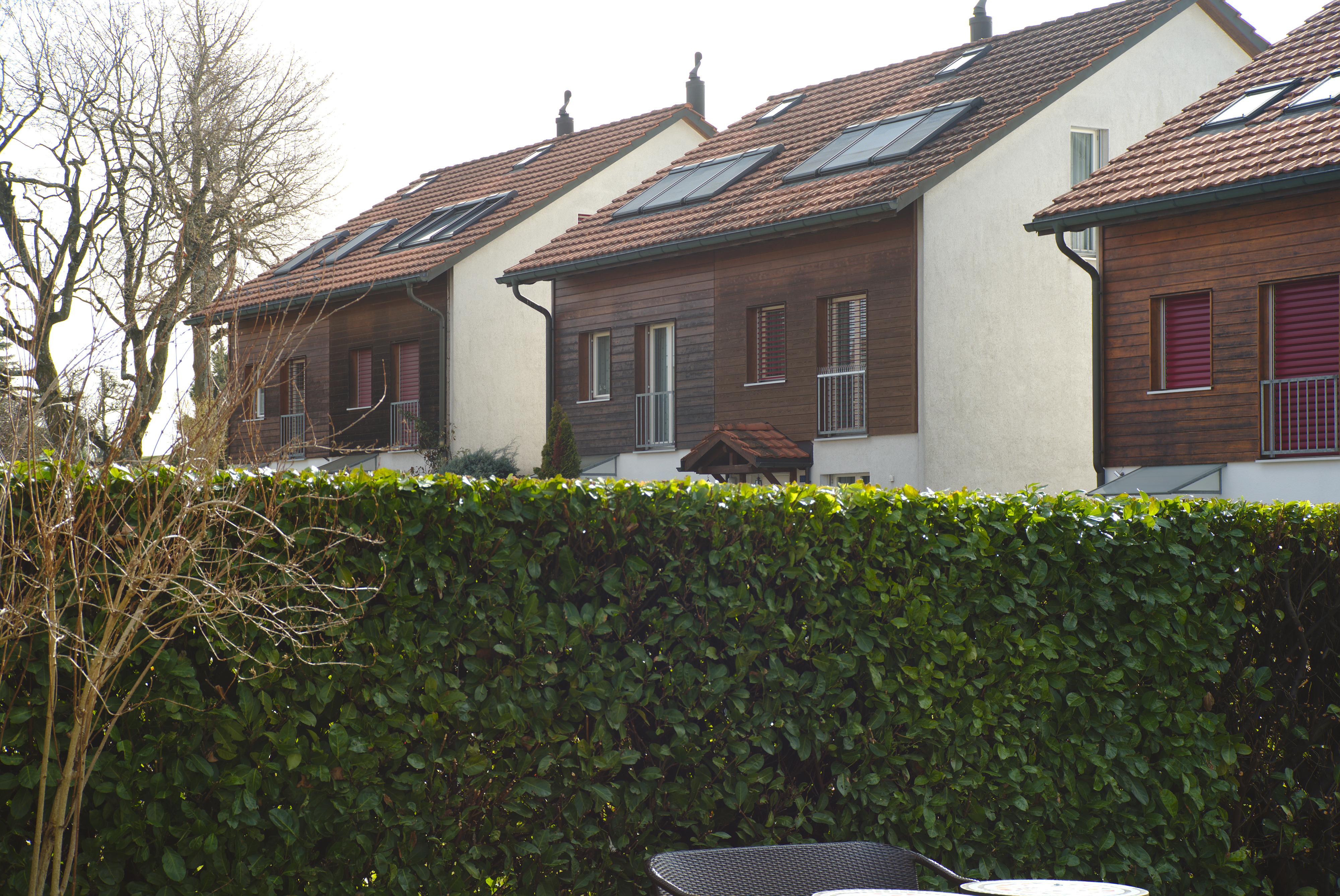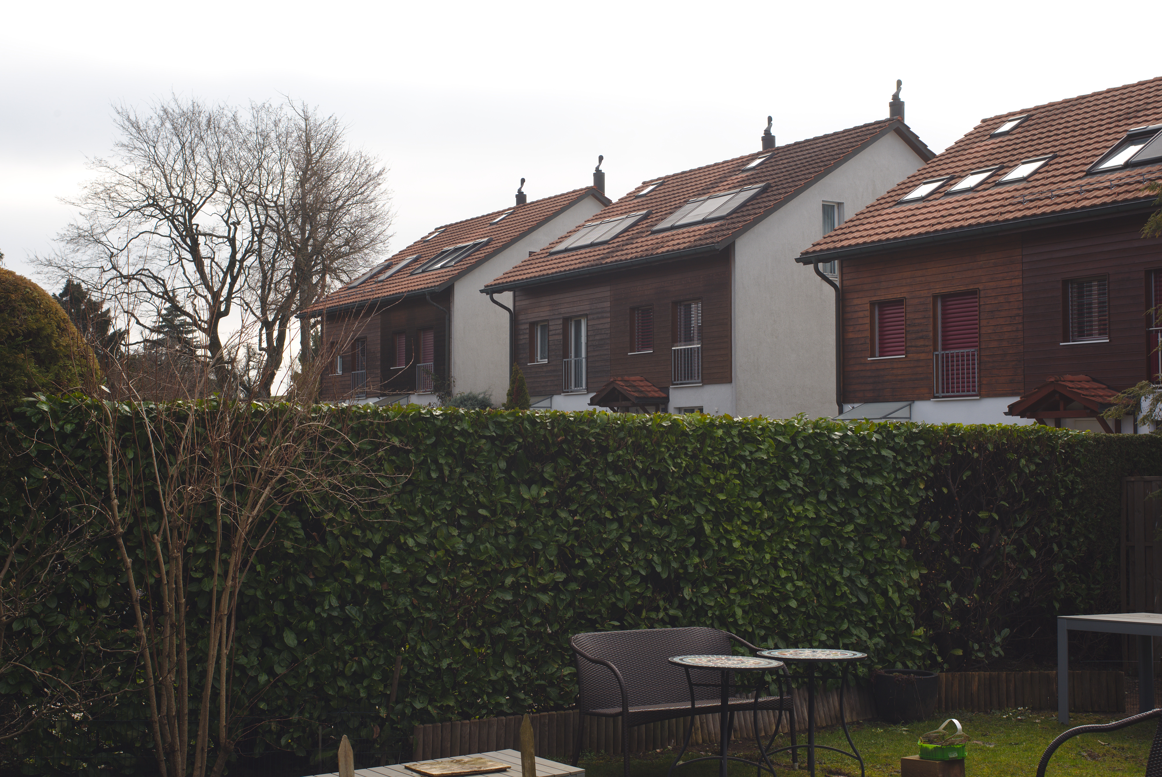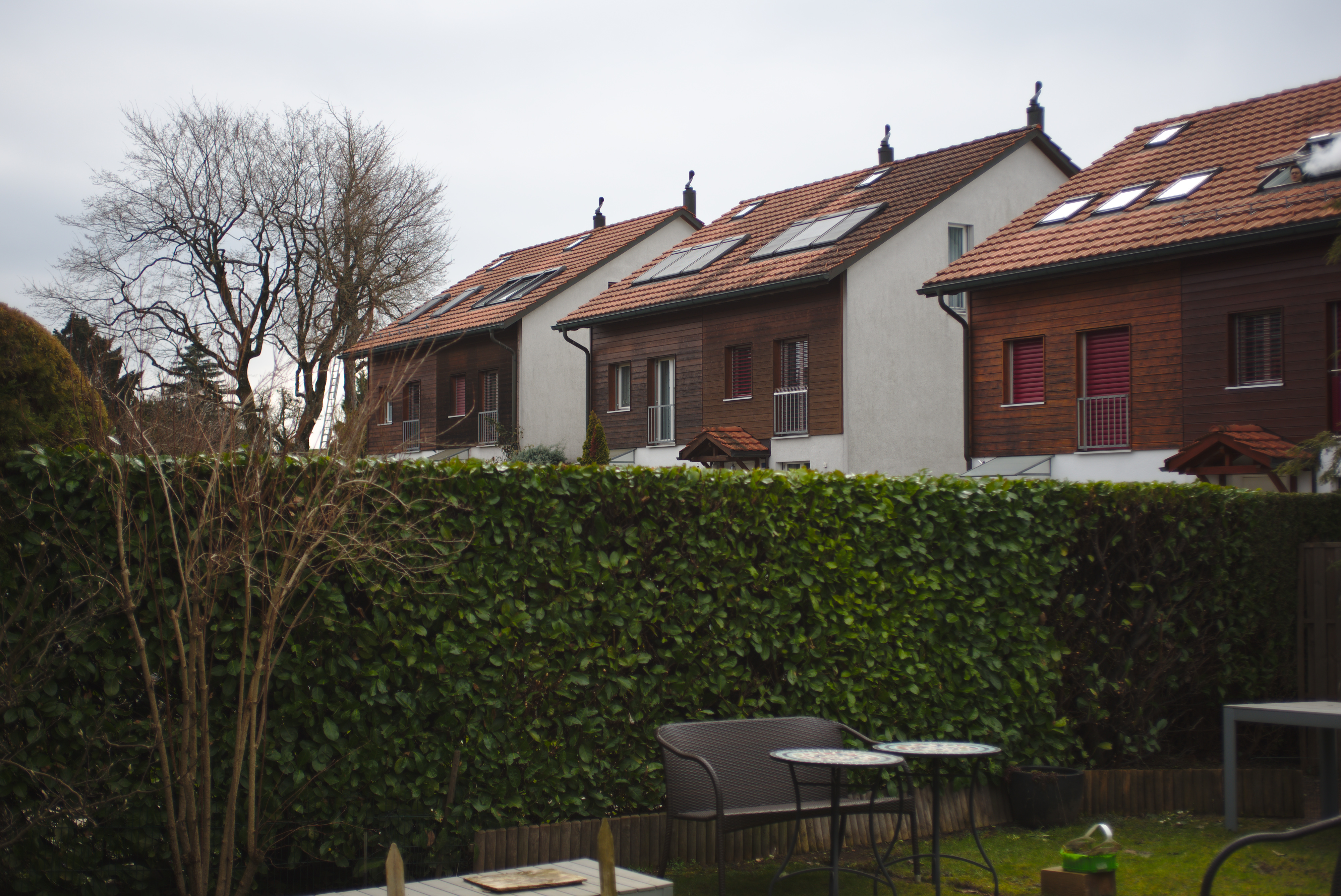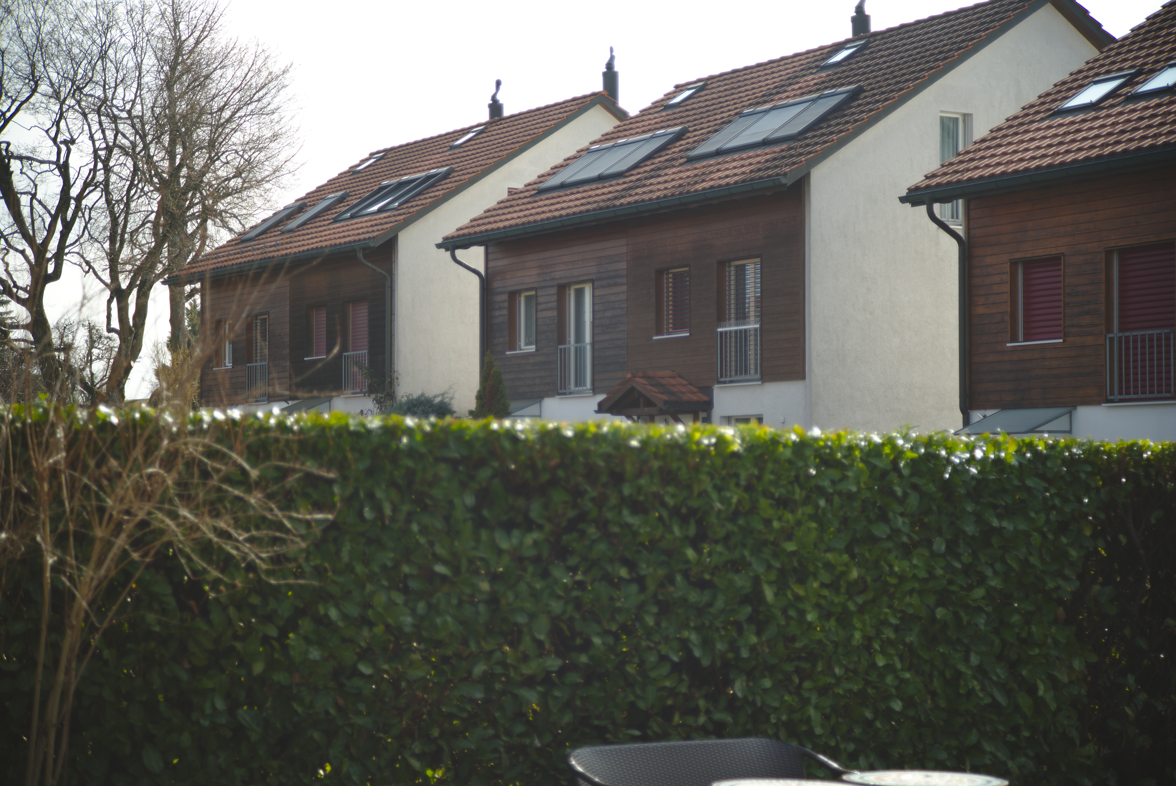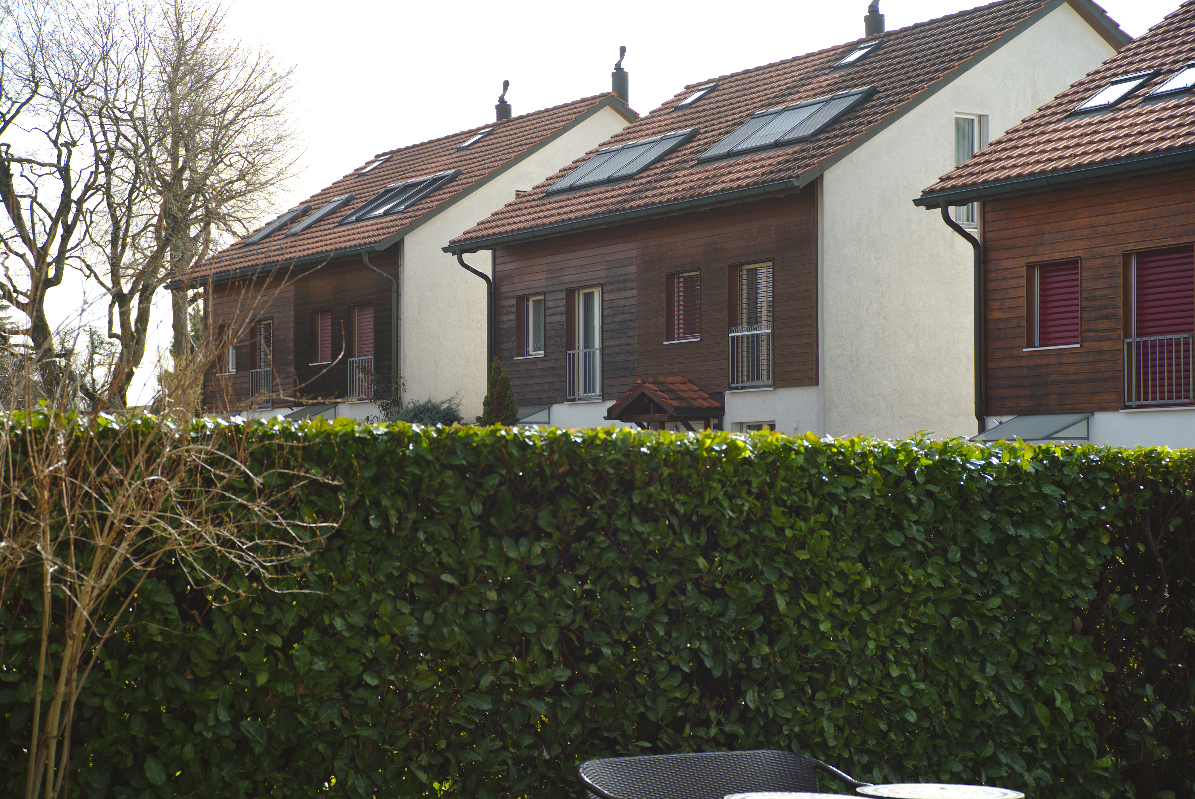Blick von unserer Terasse auf die Häuser der Nachbarschaft. Fokus auf den Firstzigel der Türüberdachung des mittleren Hauses. Entfernung ca. 40m. Der Baum im Hintergrund ist ca. 60m entfernt. Das vordere Haus ist ca. 20m. entfernt.