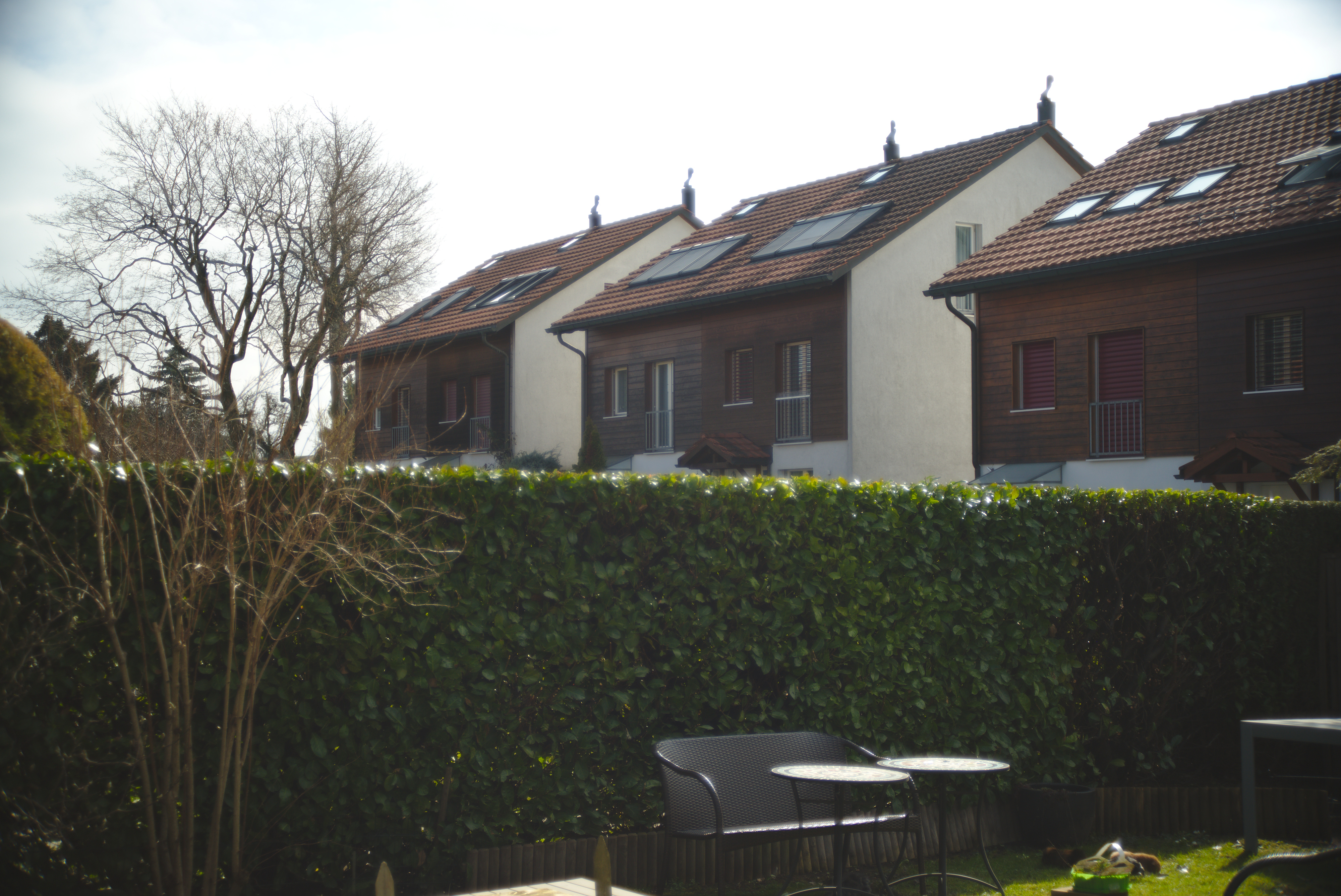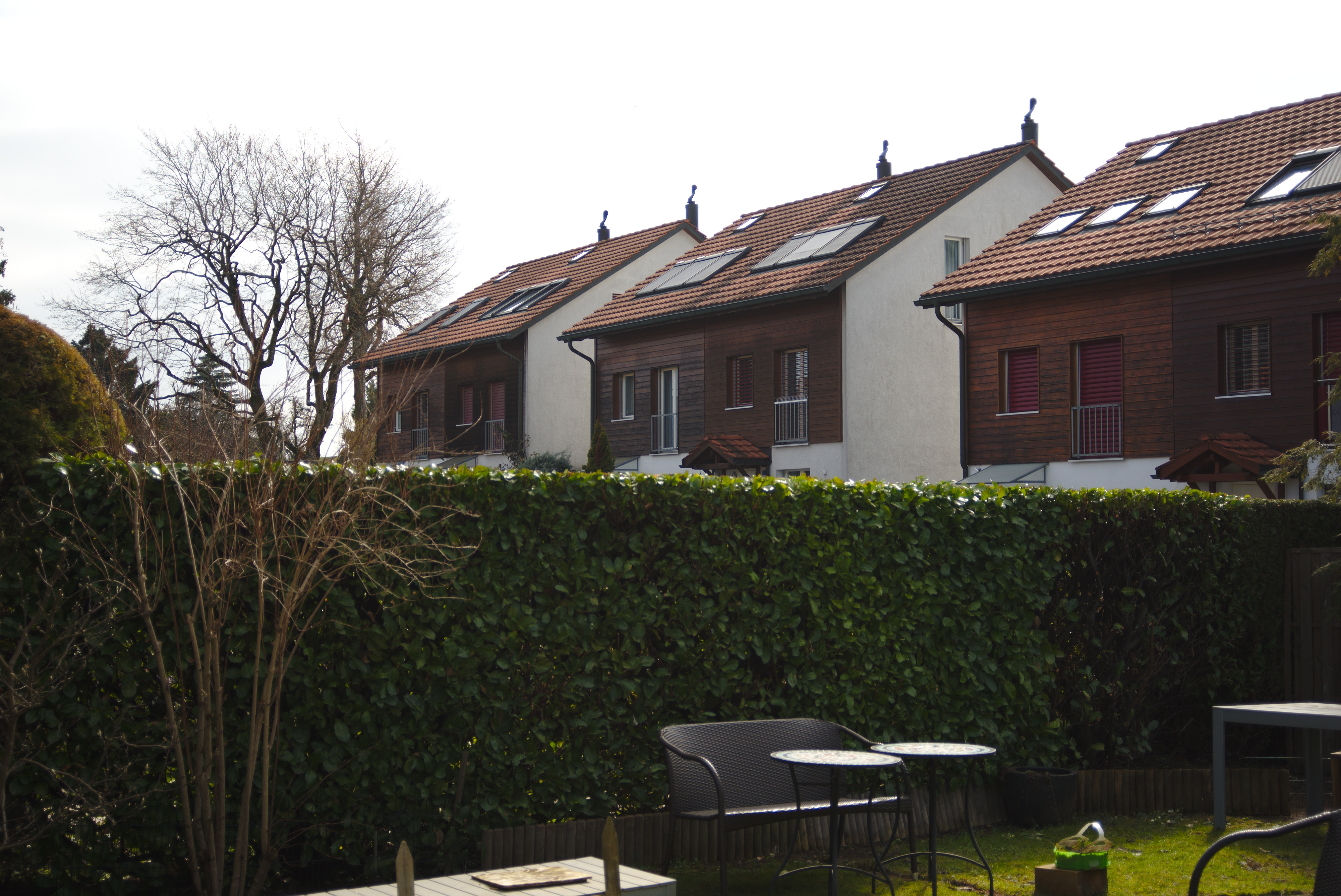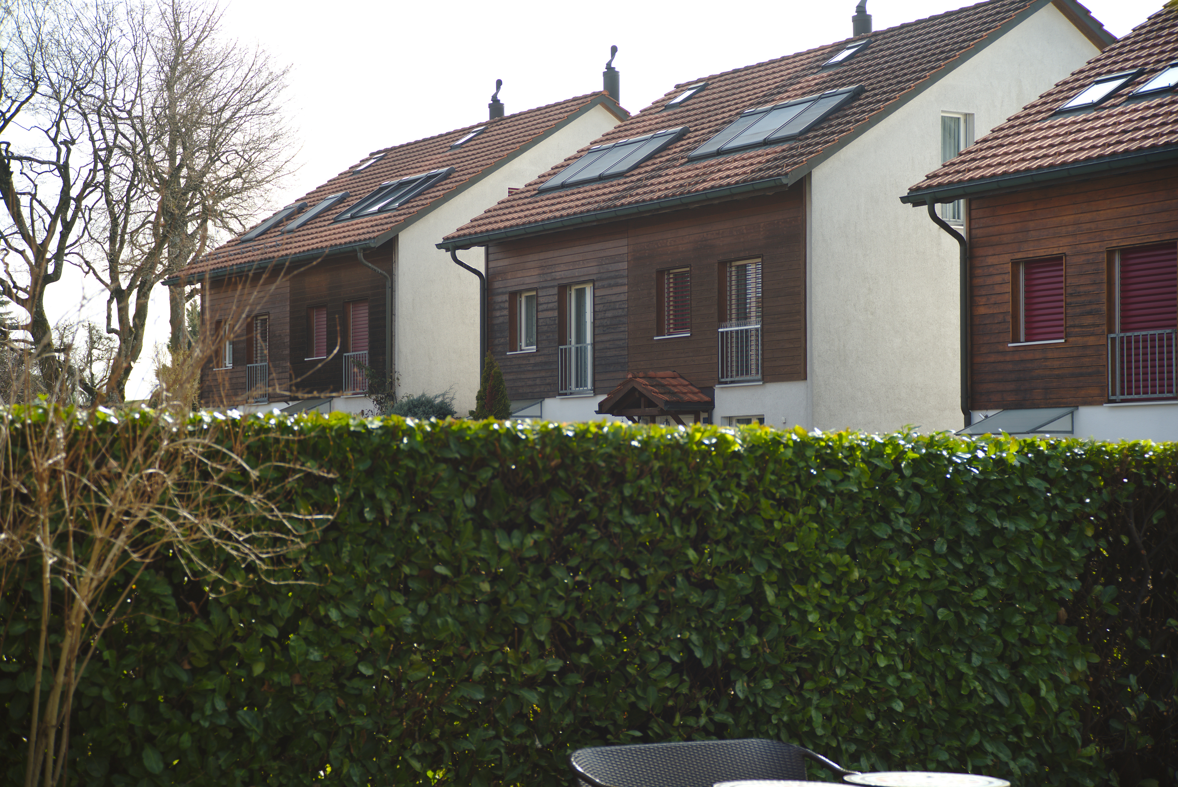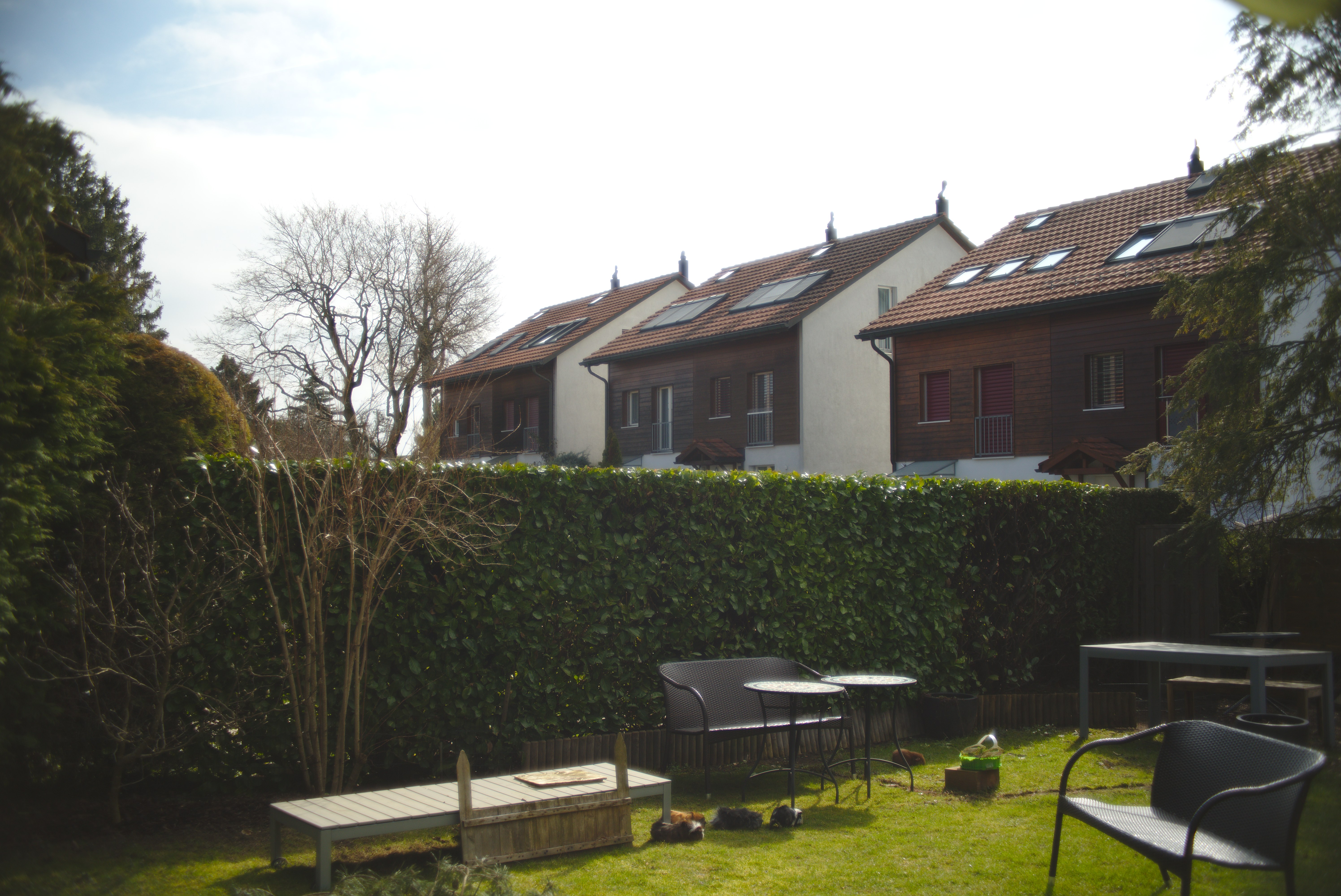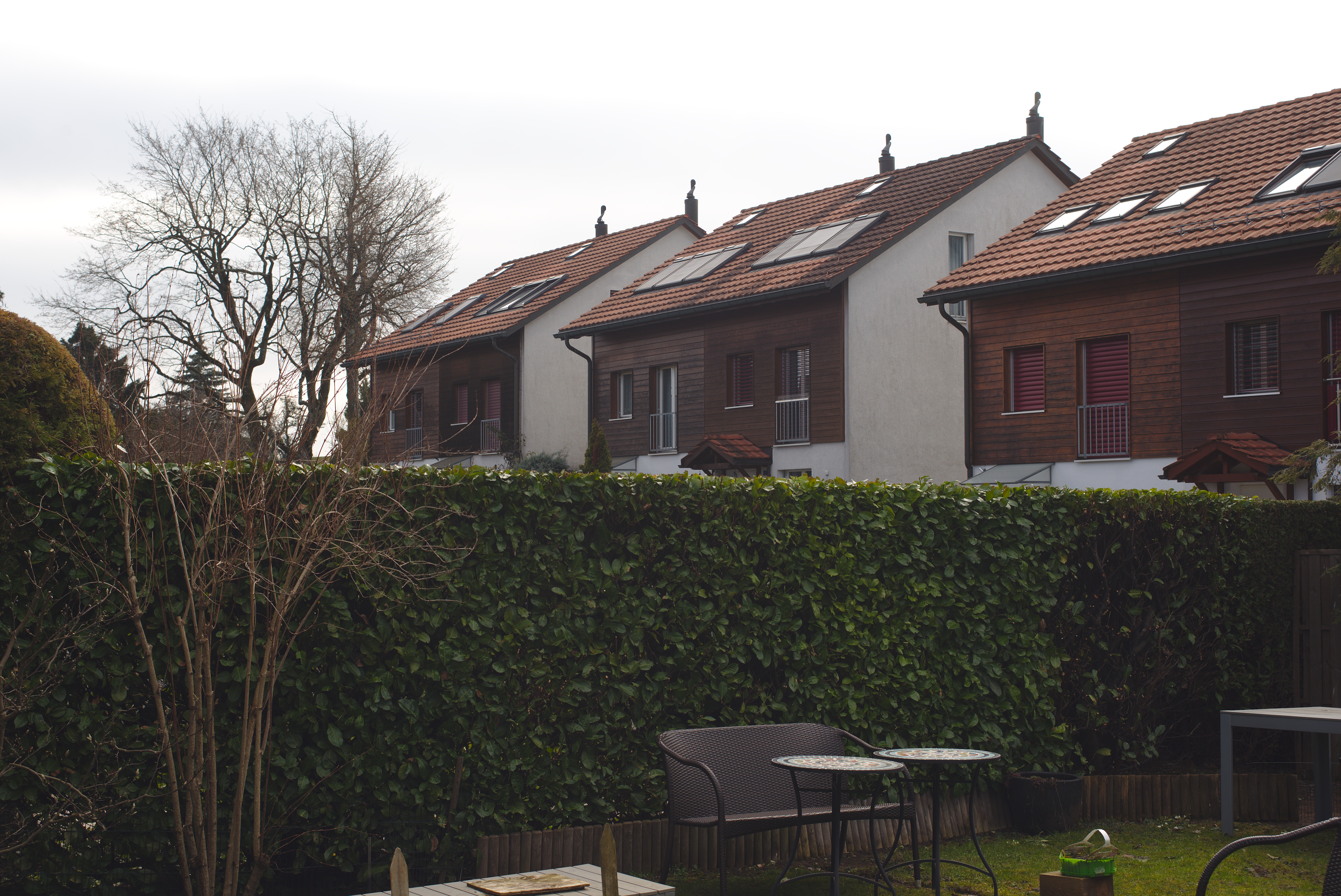 Blick von unserer Terasse auf die Häuser der Nachbarschaft. Fokus auf den Firstzigel der Türüberdachung des mittleren Hauses. Entfernung ca. 40m. Der Baum im Hintergrund ist ca. 60m entfernt. Das vordere Haus ist ca. 20m. entfernt.