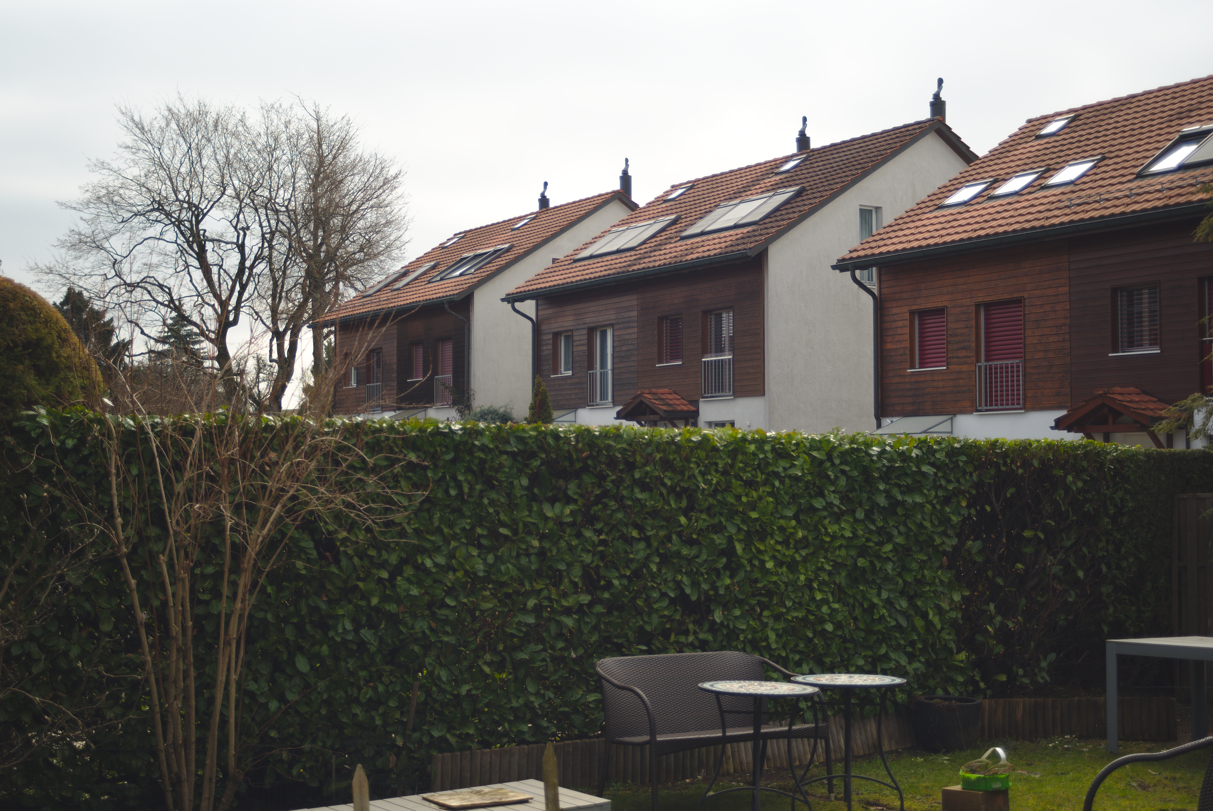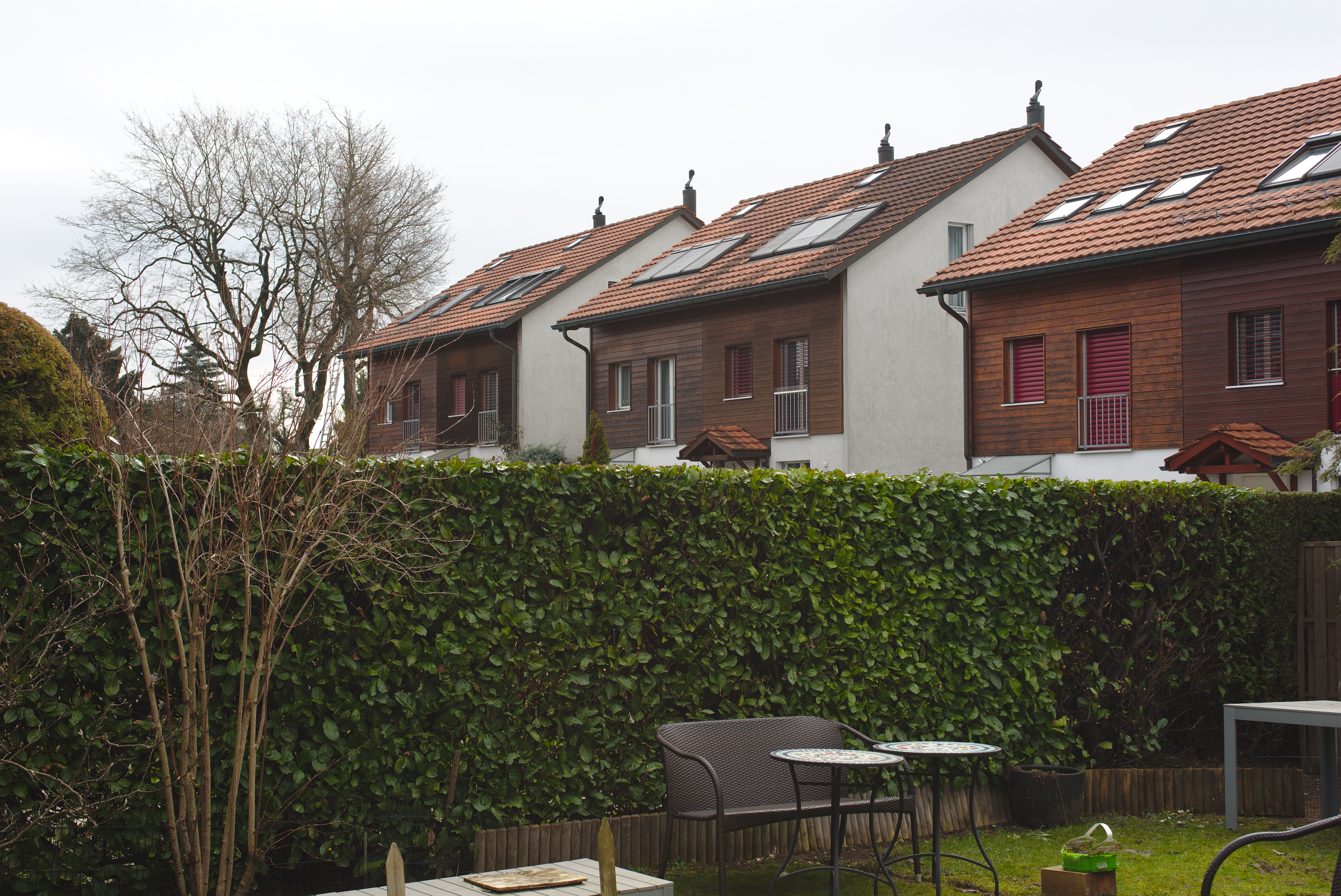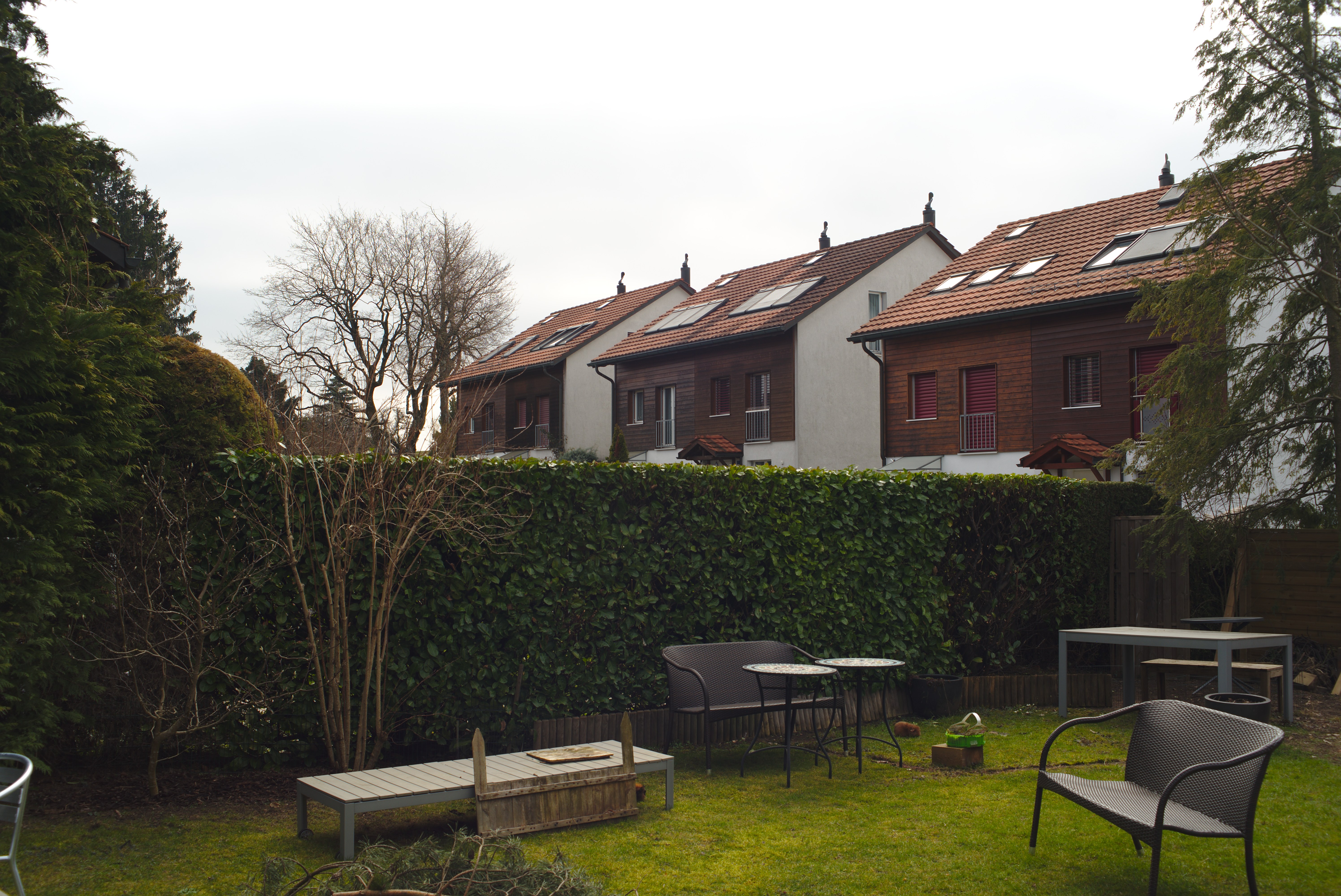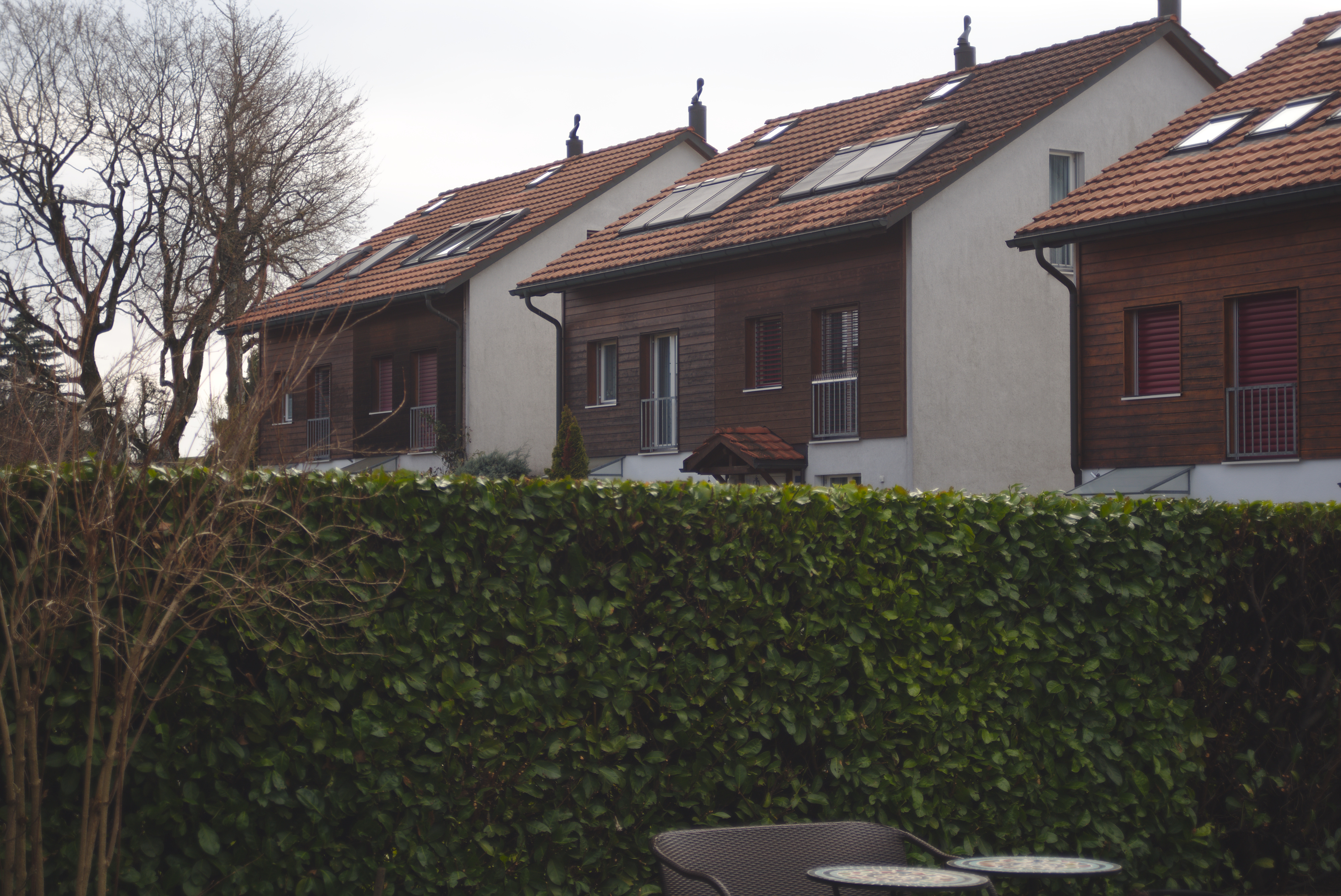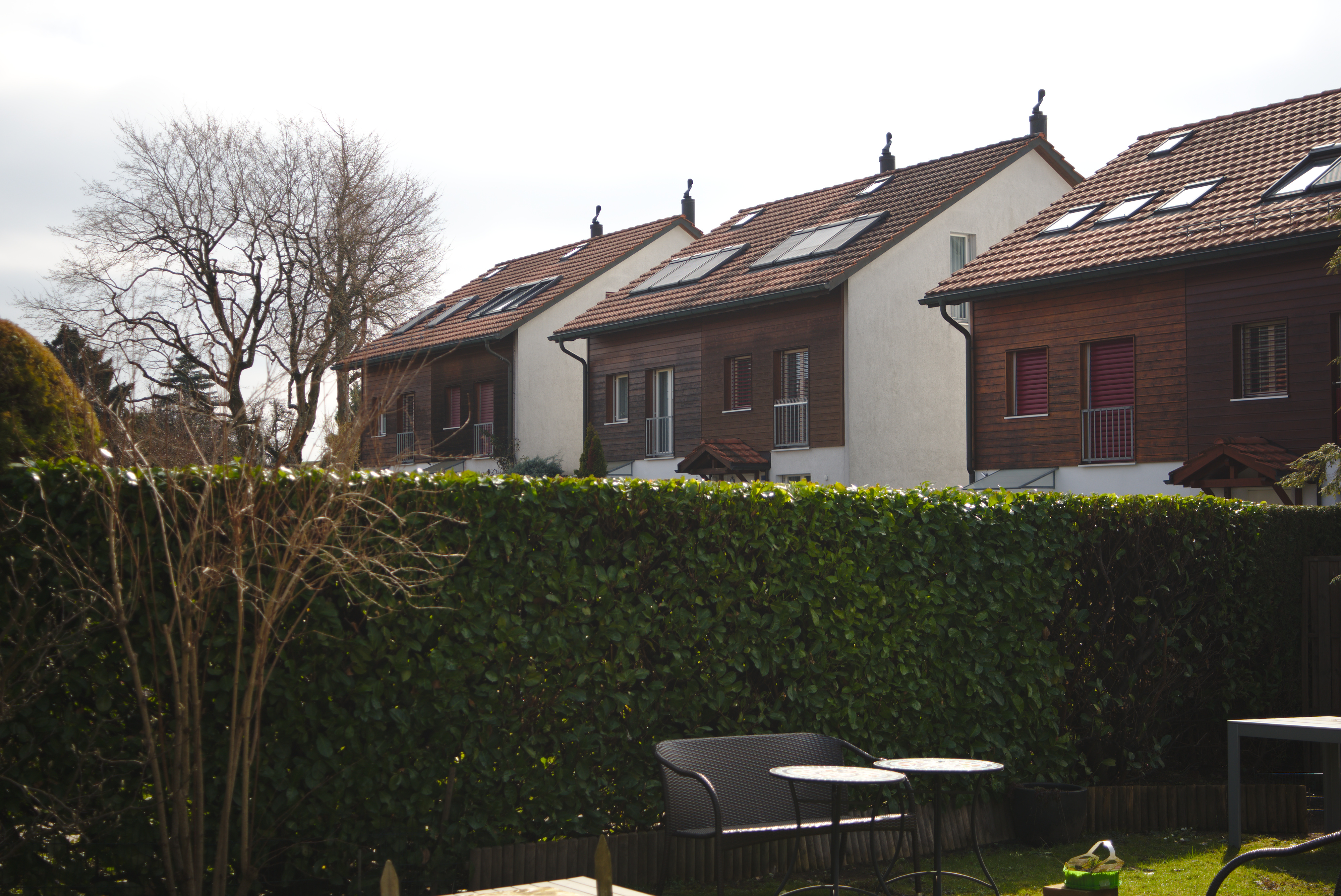 Blick von unserer Terasse auf die Häuser der Nachbarschaft. Fokus auf den Firstzigel der Türüberdachung des mittleren Hauses. Entfernung ca. 40m. Der Baum im Hintergrund ist ca. 60m entfernt. Das vordere Haus ist ca. 20m. entfernt.