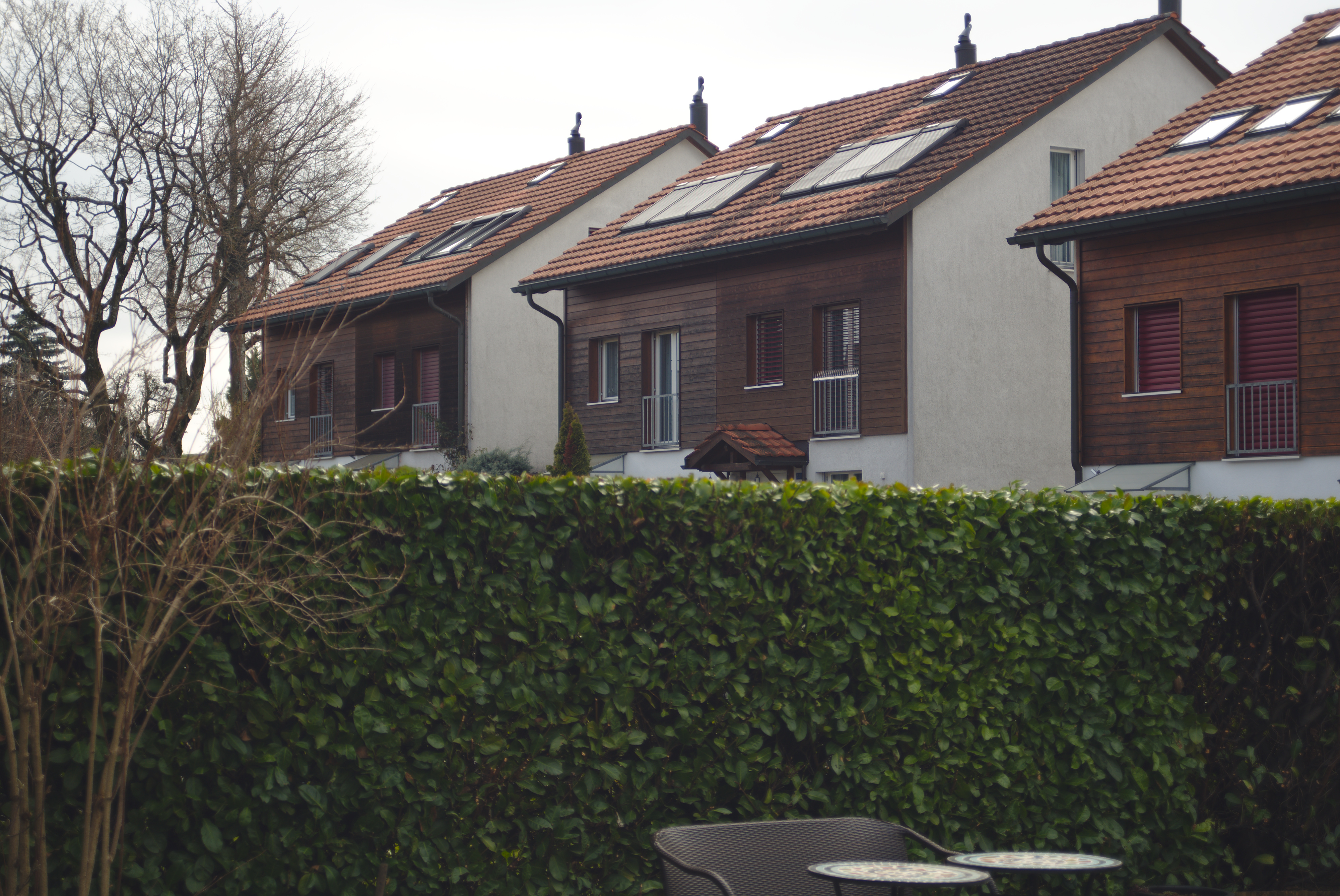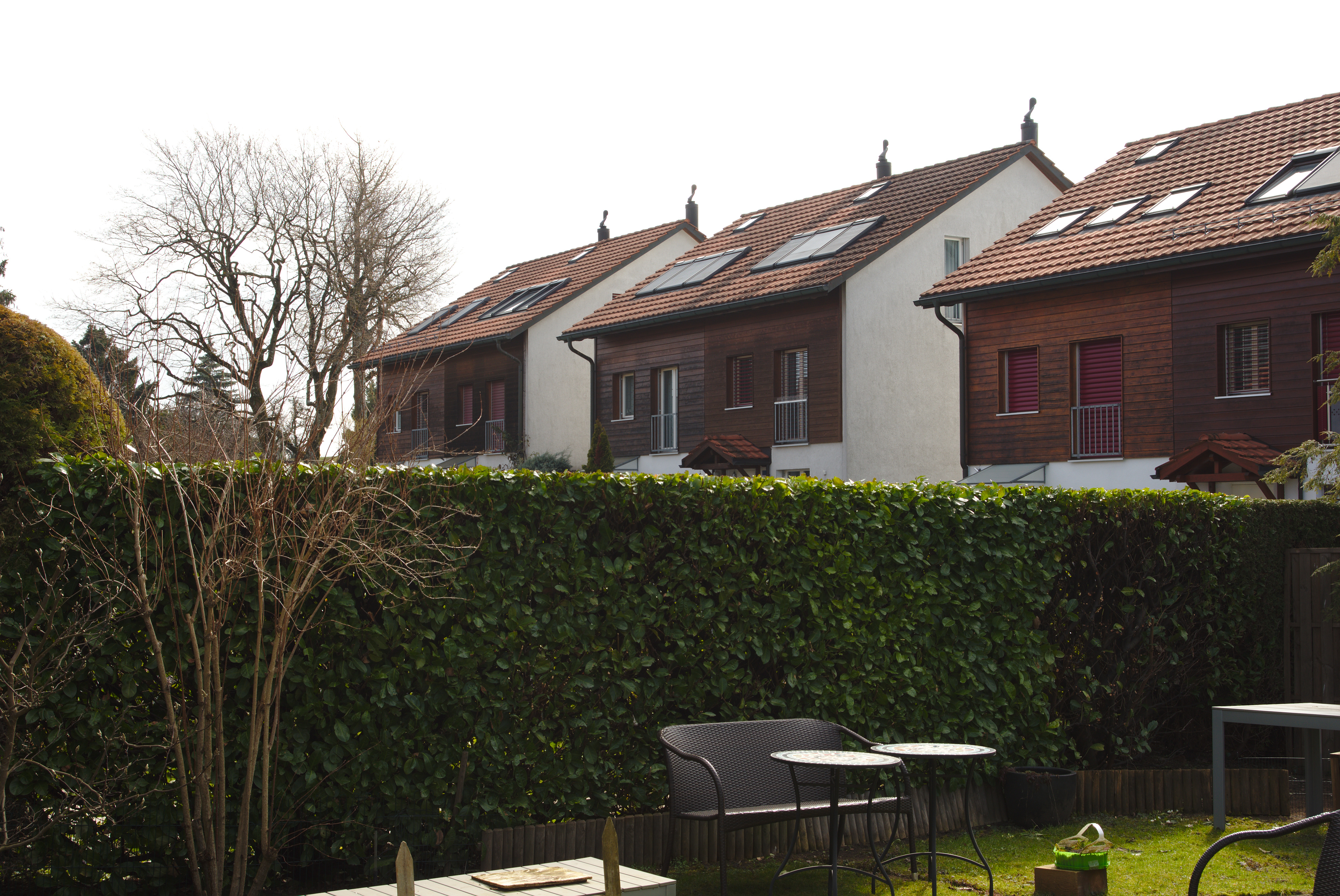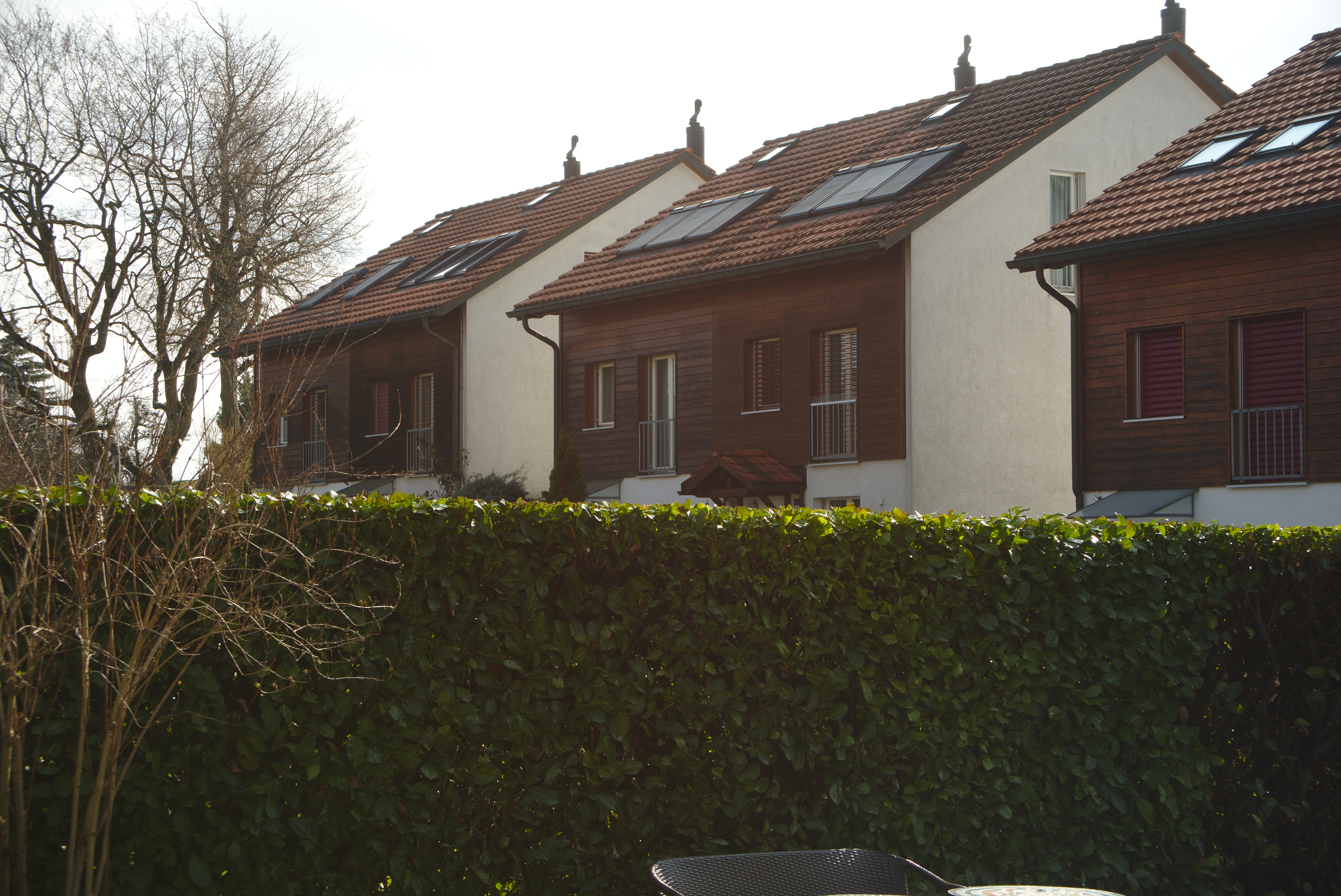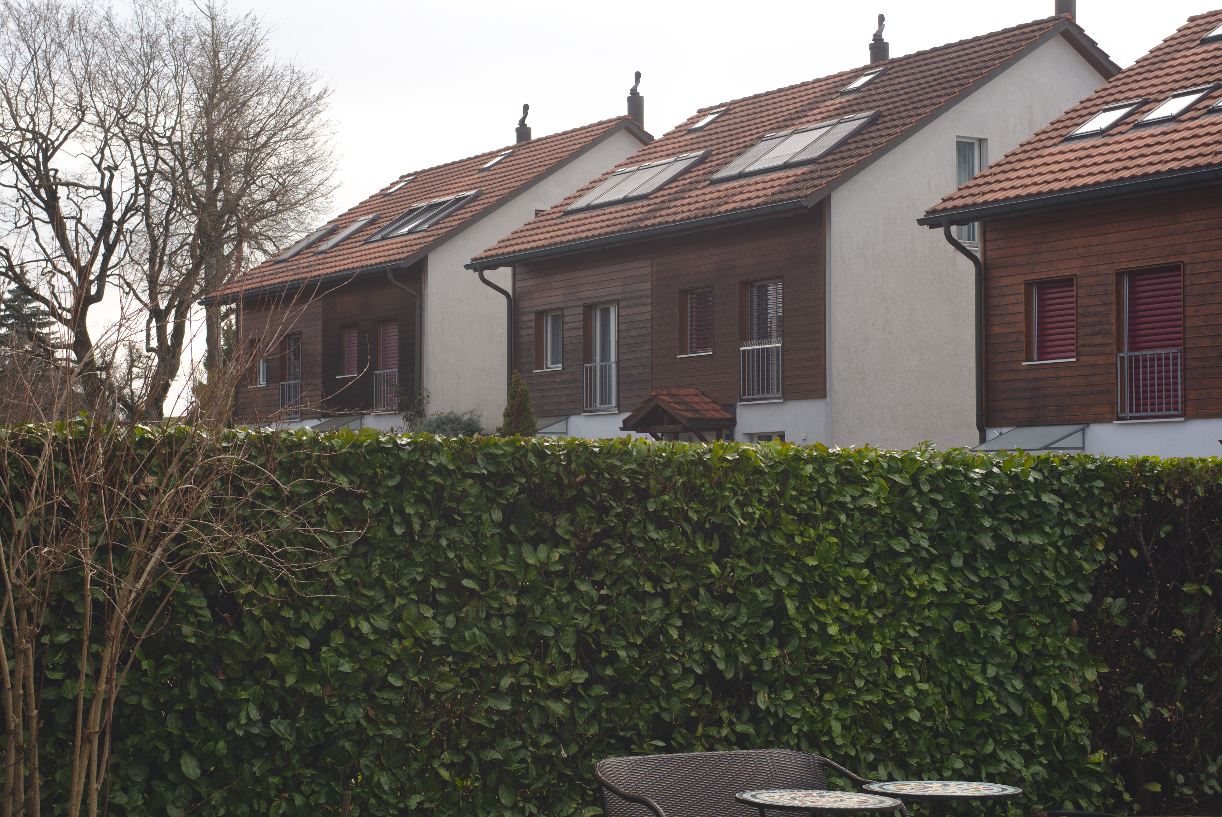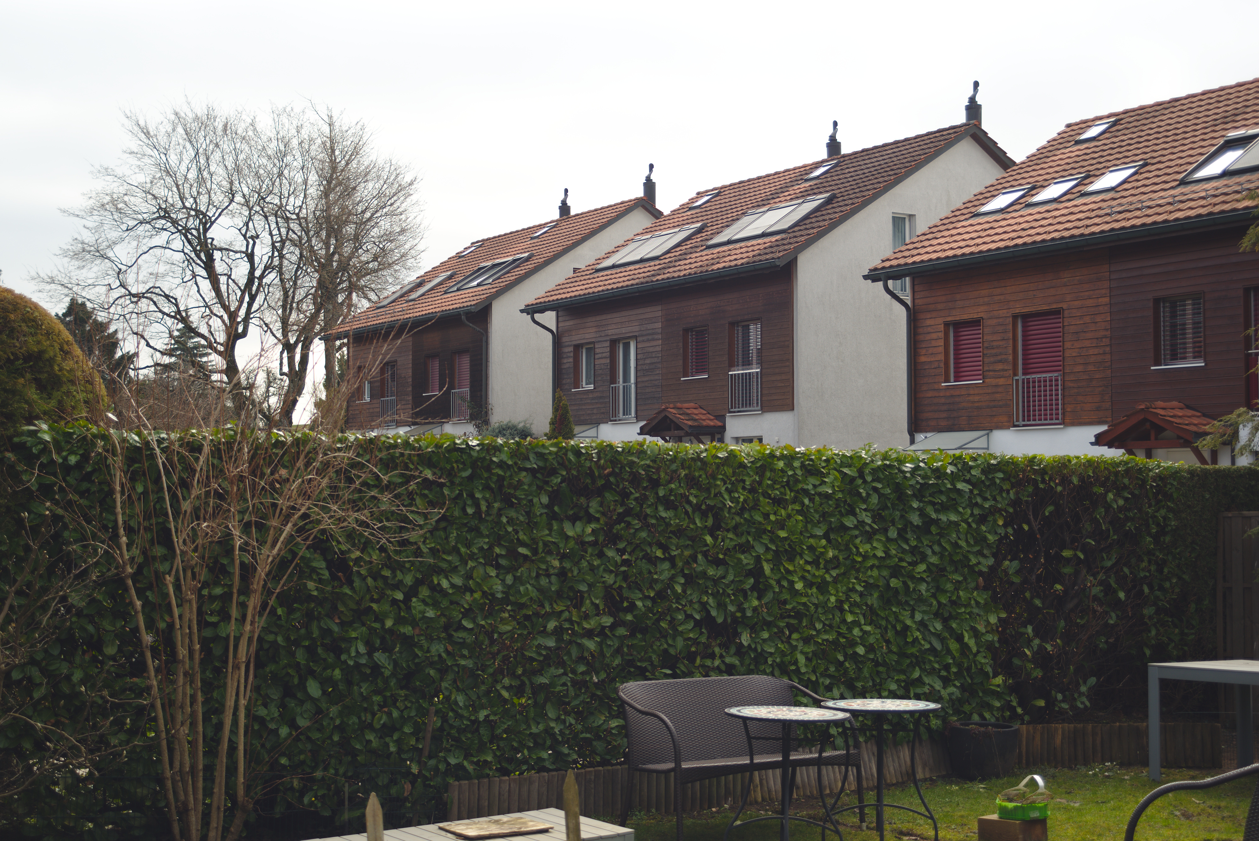 Blick von unserer Terasse auf die Häuser der Nachbarschaft. Fokus auf den Firstzigel der Türüberdachung des mittleren Hauses. Entfernung ca. 40m. Der Baum im Hintergrund ist ca. 60m entfernt. Das vordere Haus ist ca. 20m. entfernt.