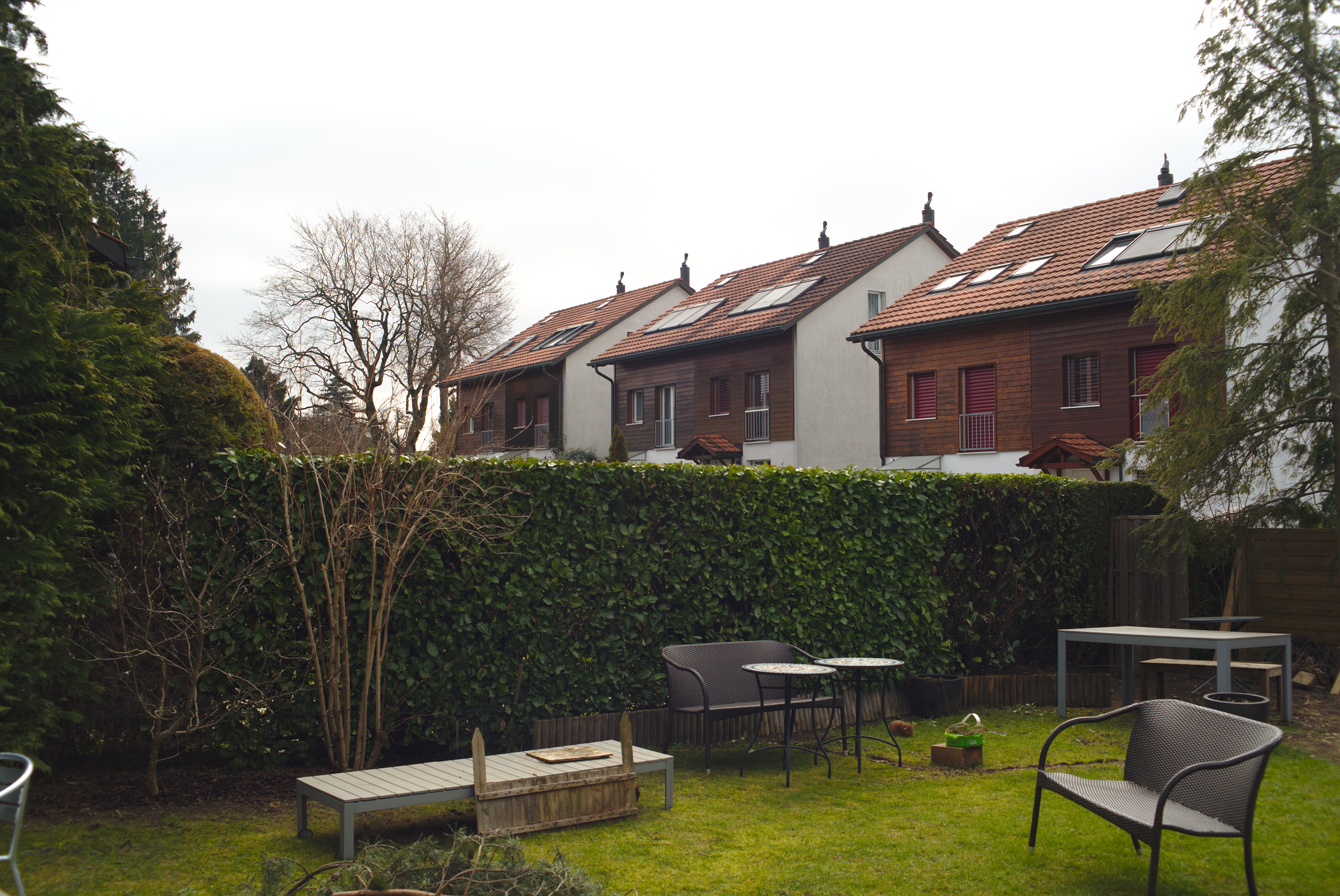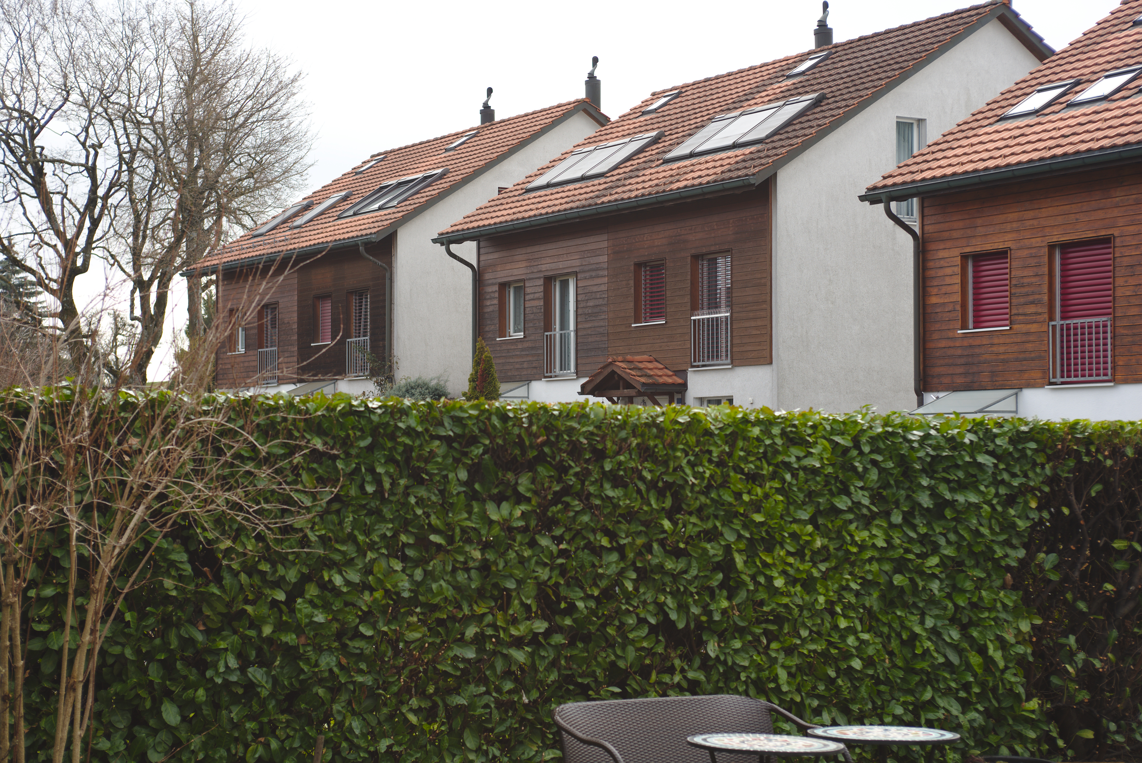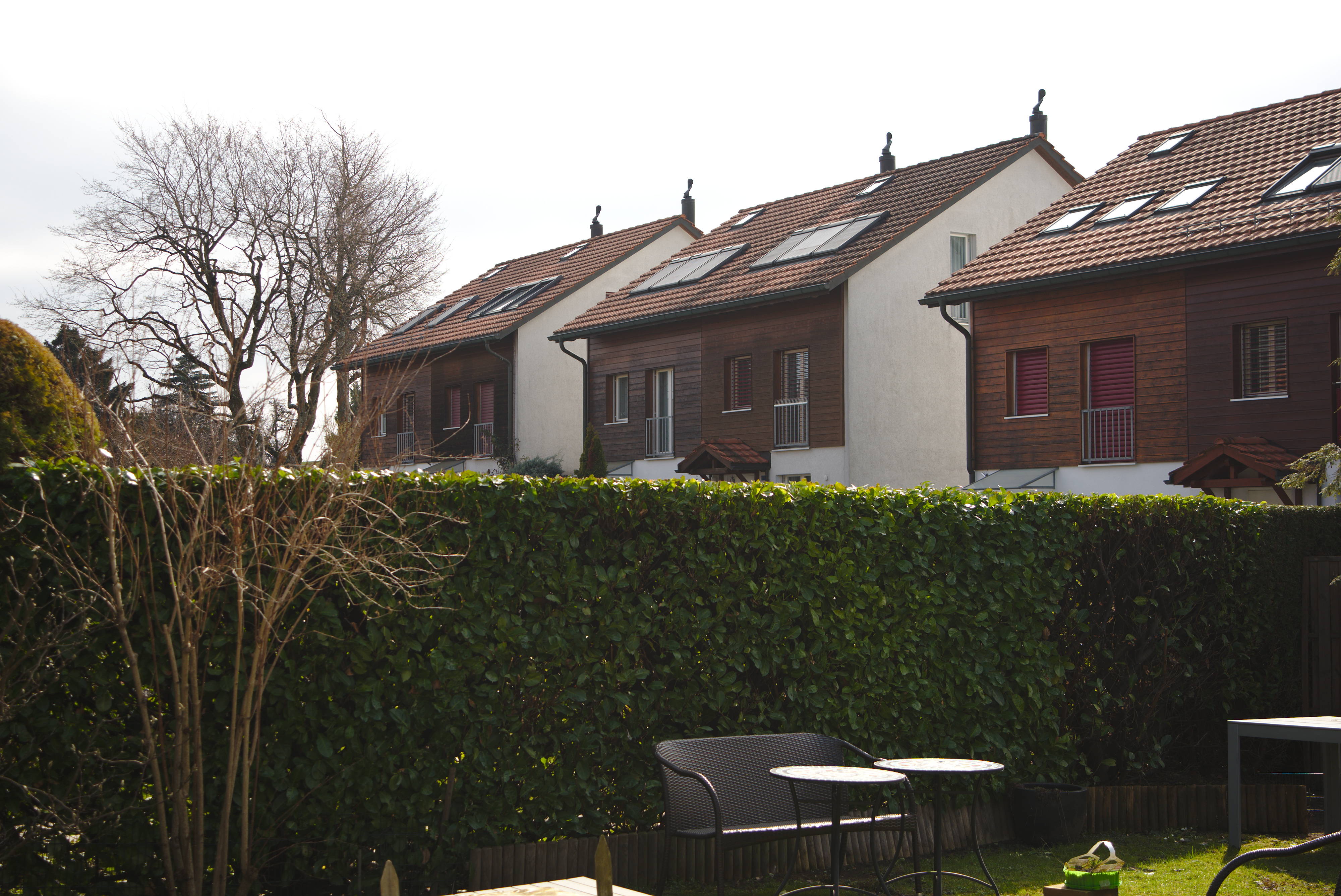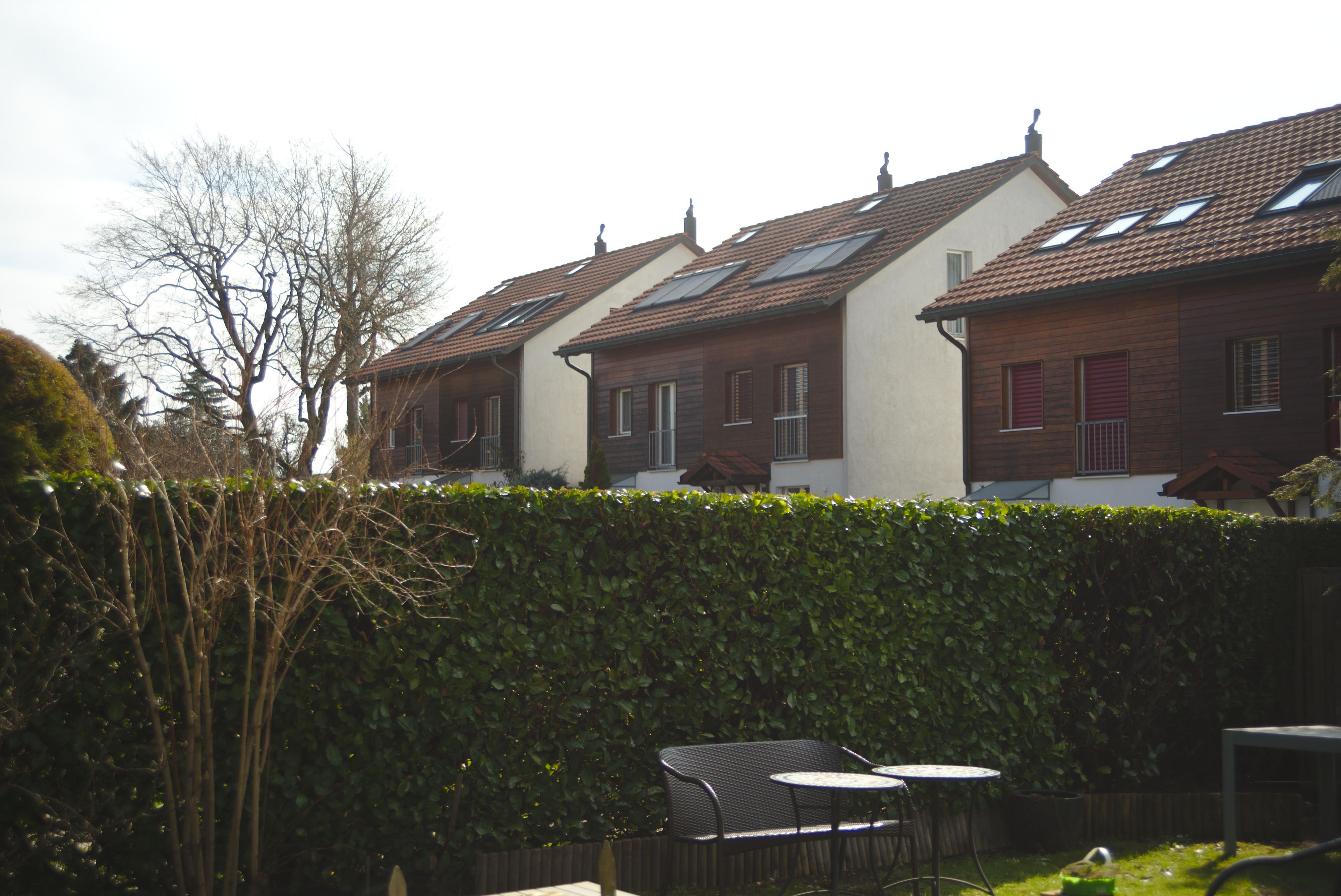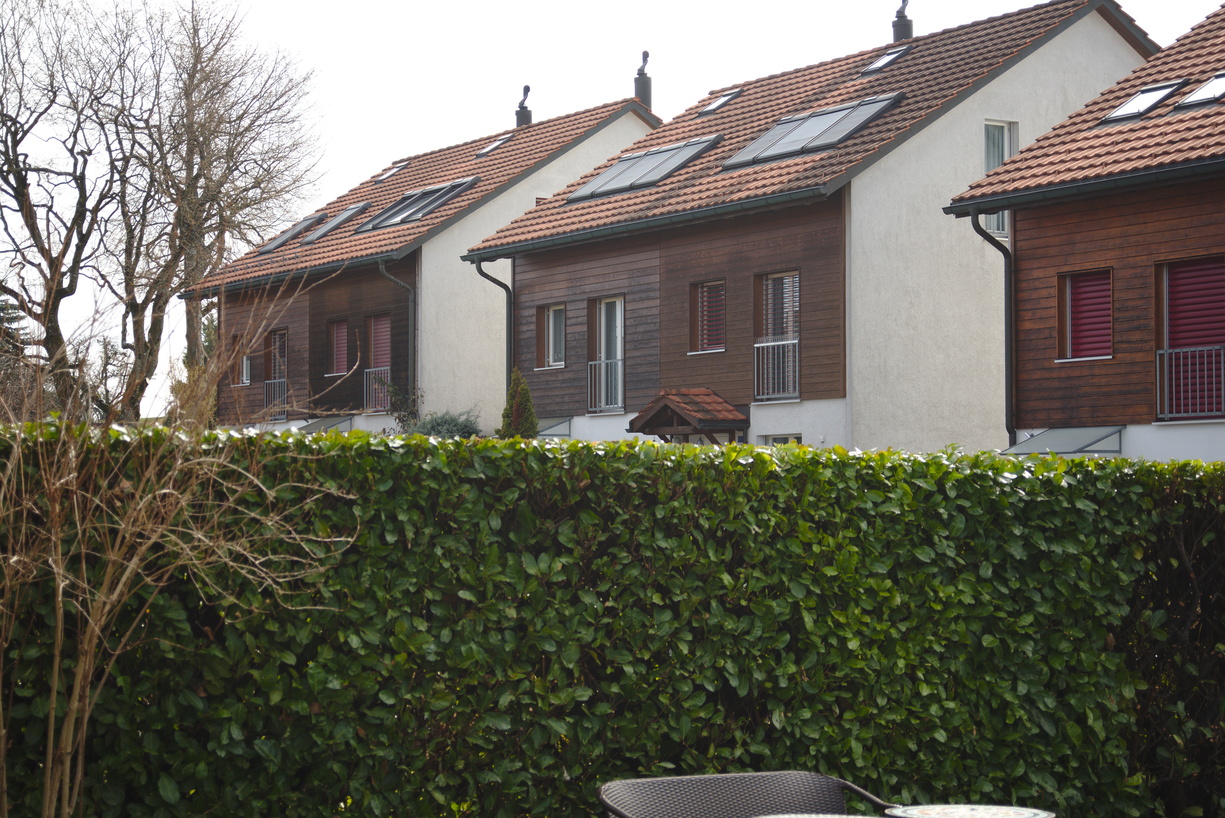 Blick von unserer Terasse auf die Häuser der Nachbarschaft. Fokus auf den Firstzigel der Türüberdachung des mittleren Hauses. Entfernung ca. 40m. Der Baum im Hintergrund ist ca. 60m entfernt. Das vordere Haus ist ca. 20m. entfernt.