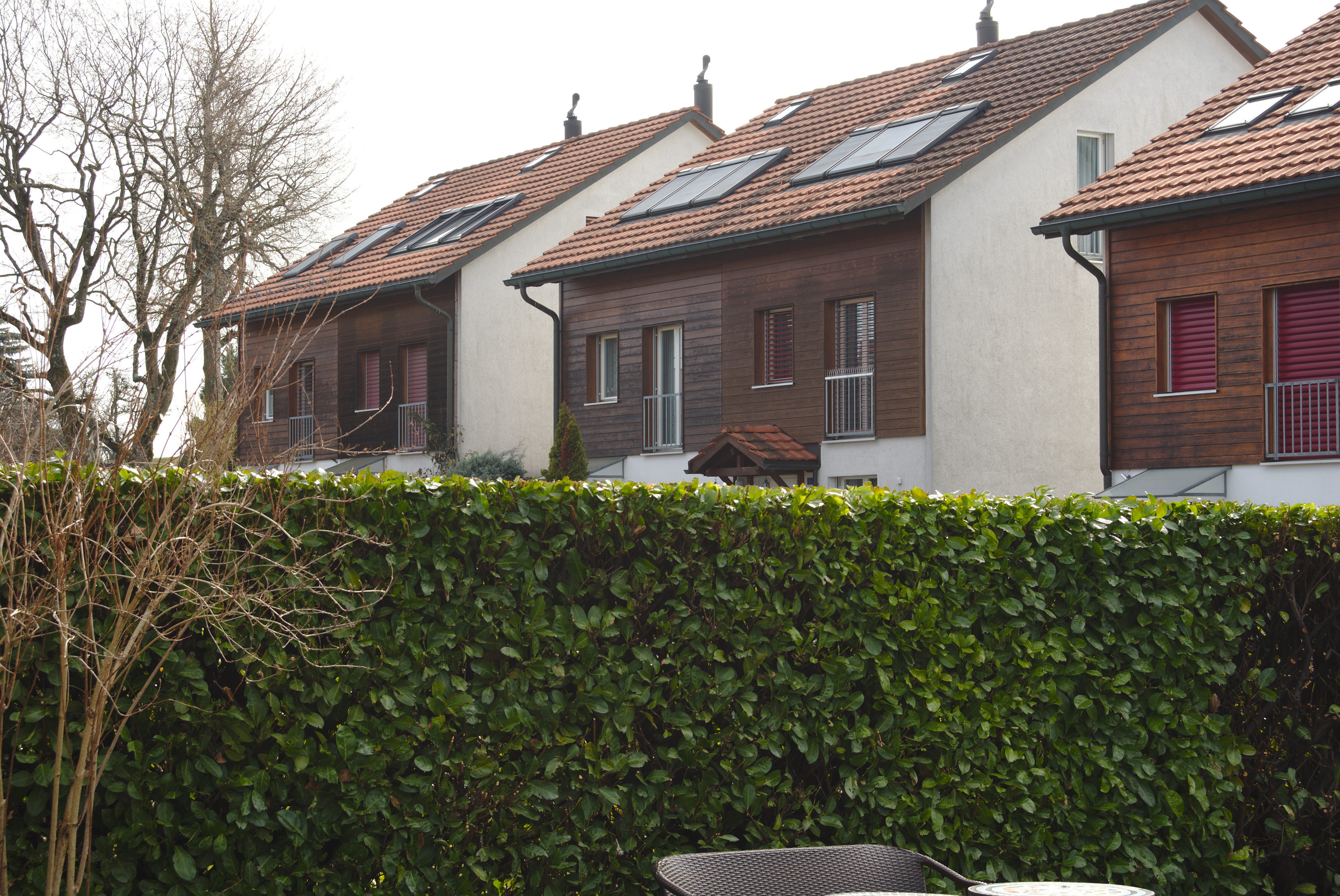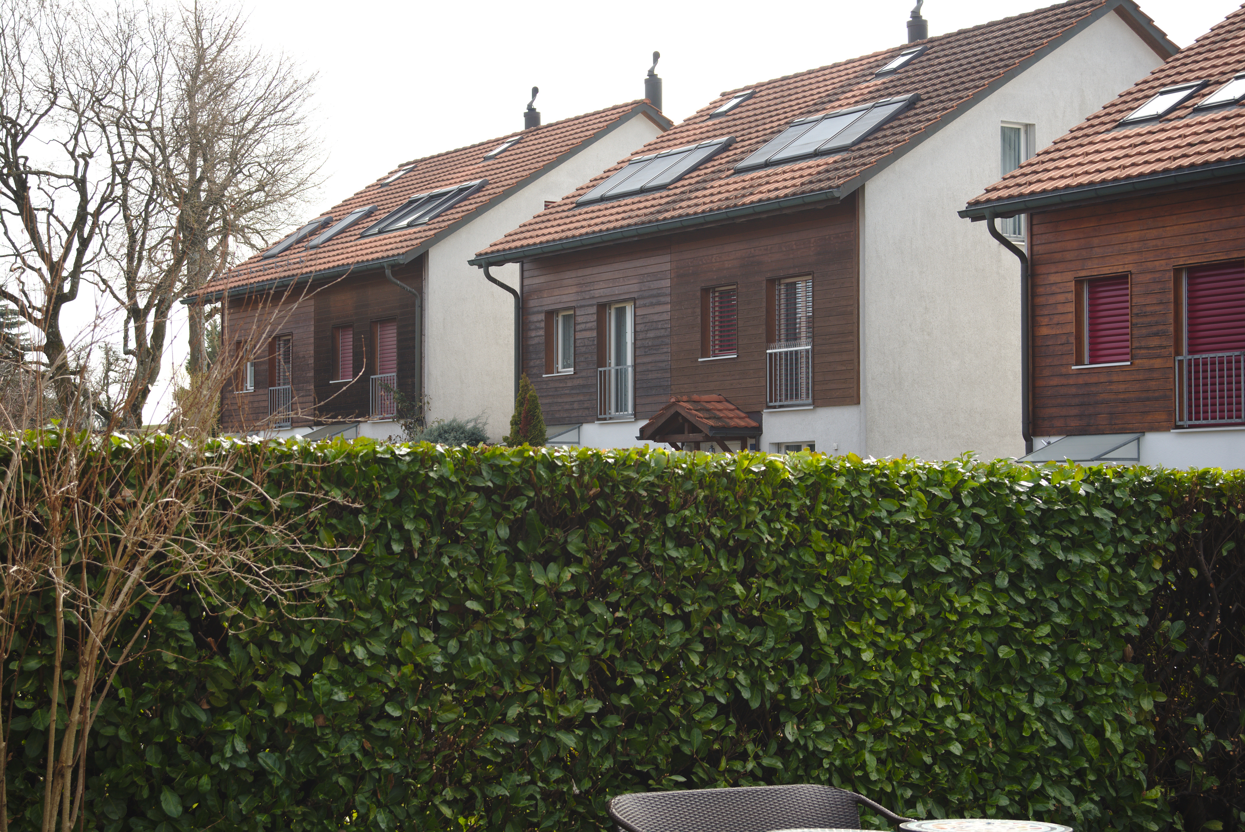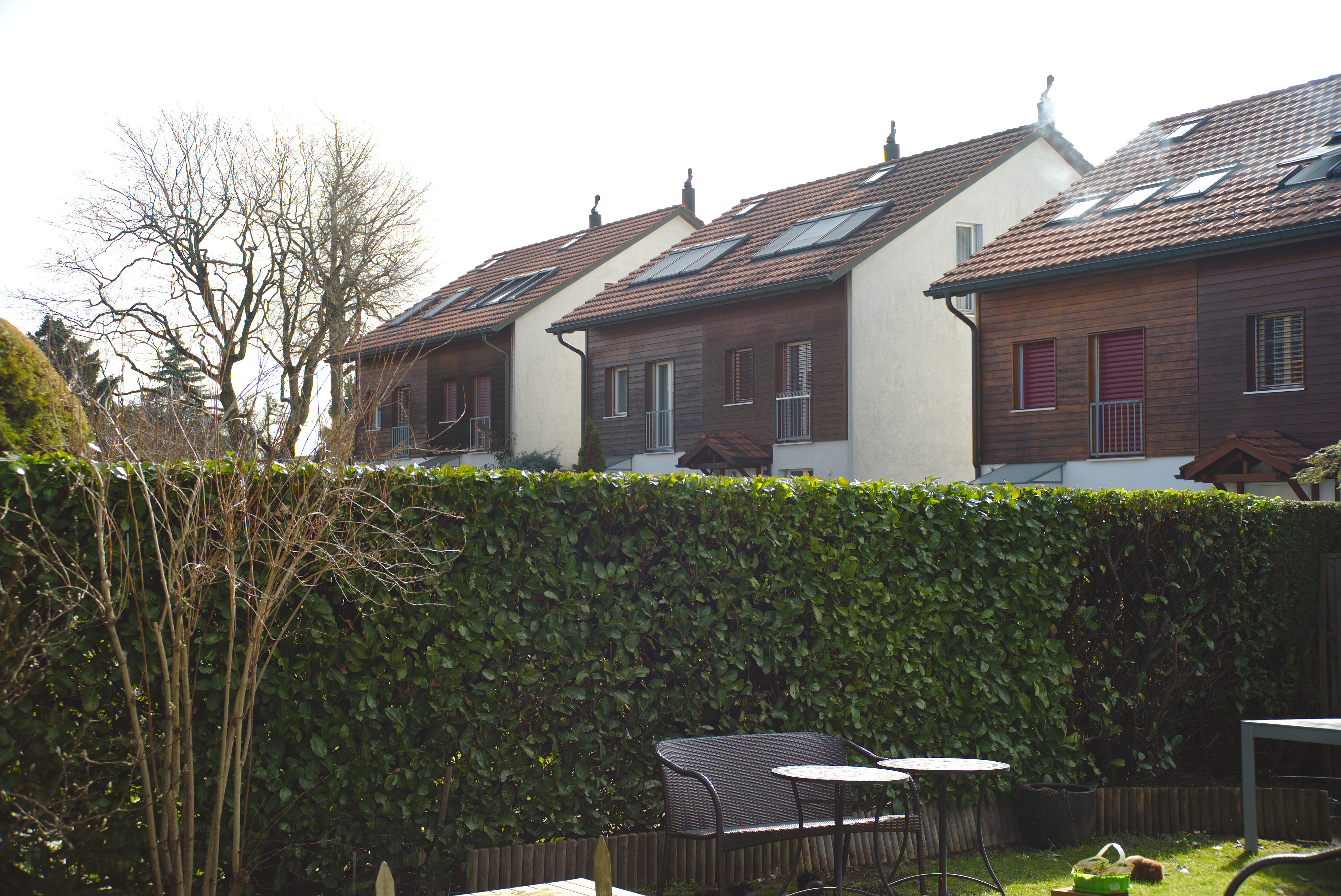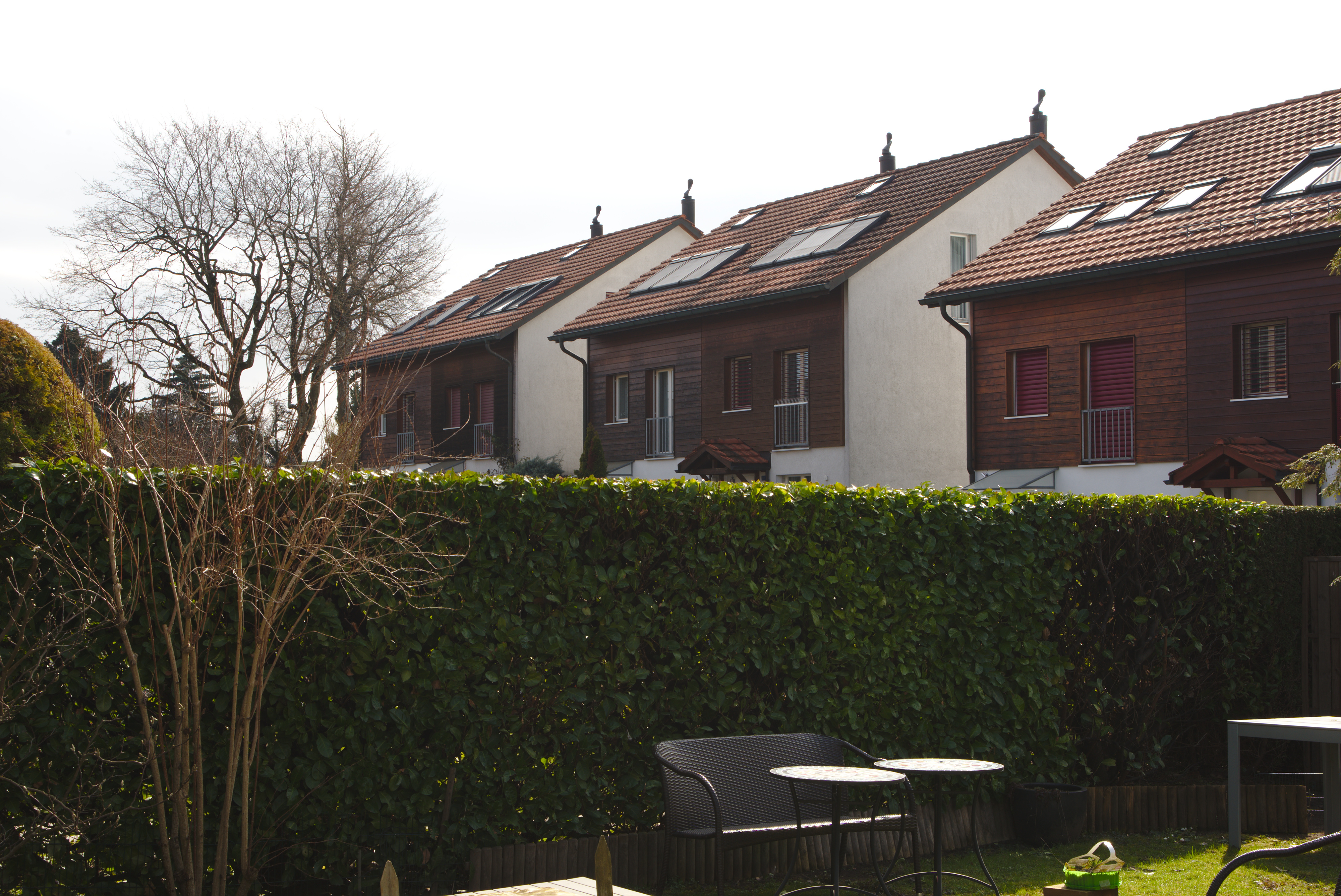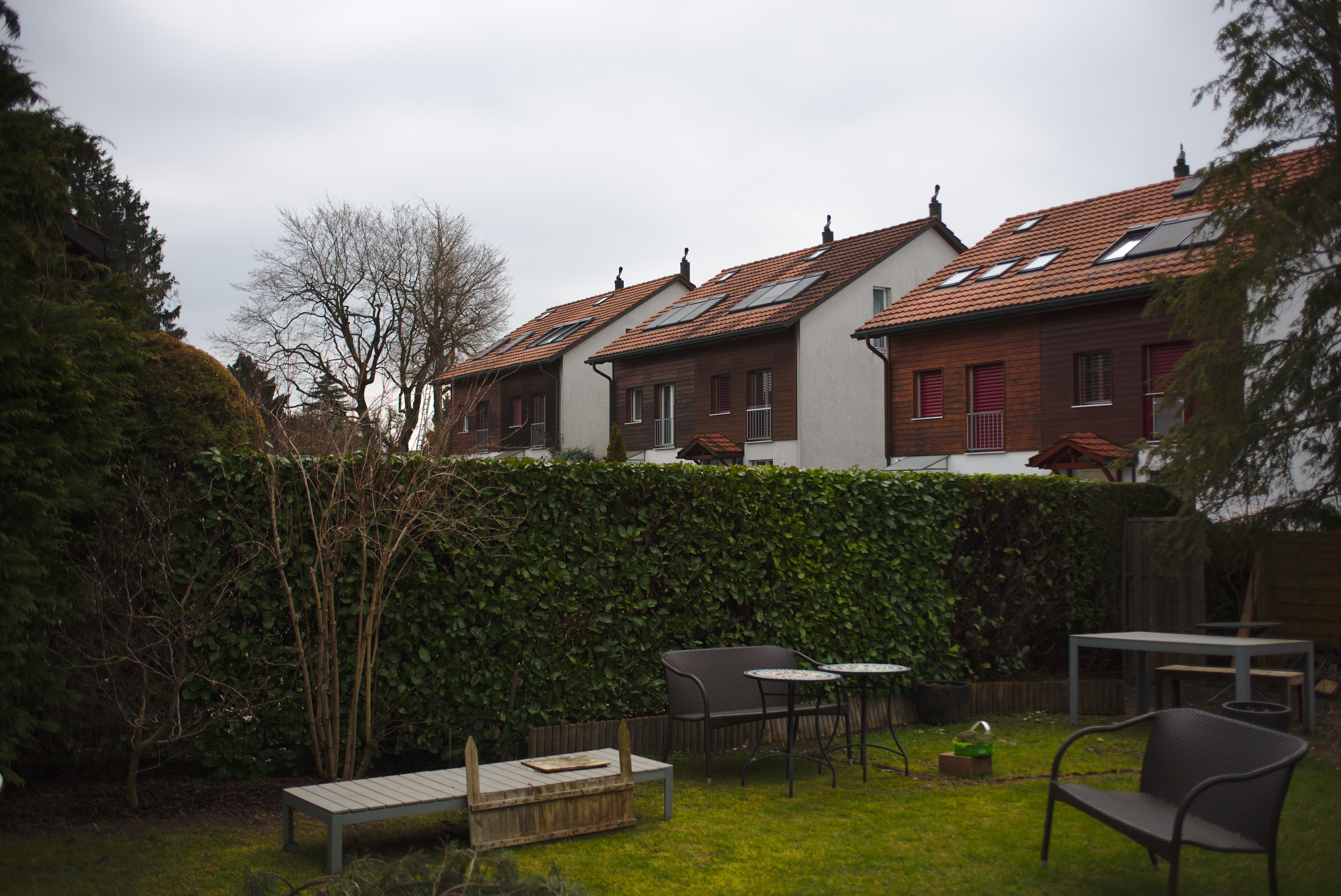 Blick von unserer Terasse auf die Häuser der Nachbarschaft. Fokus auf den Firstzigel der Türüberdachung des mittleren Hauses. Entfernung ca. 40m. Der Baum im Hintergrund ist ca. 60m entfernt. Das vordere Haus ist ca. 20m. entfernt.