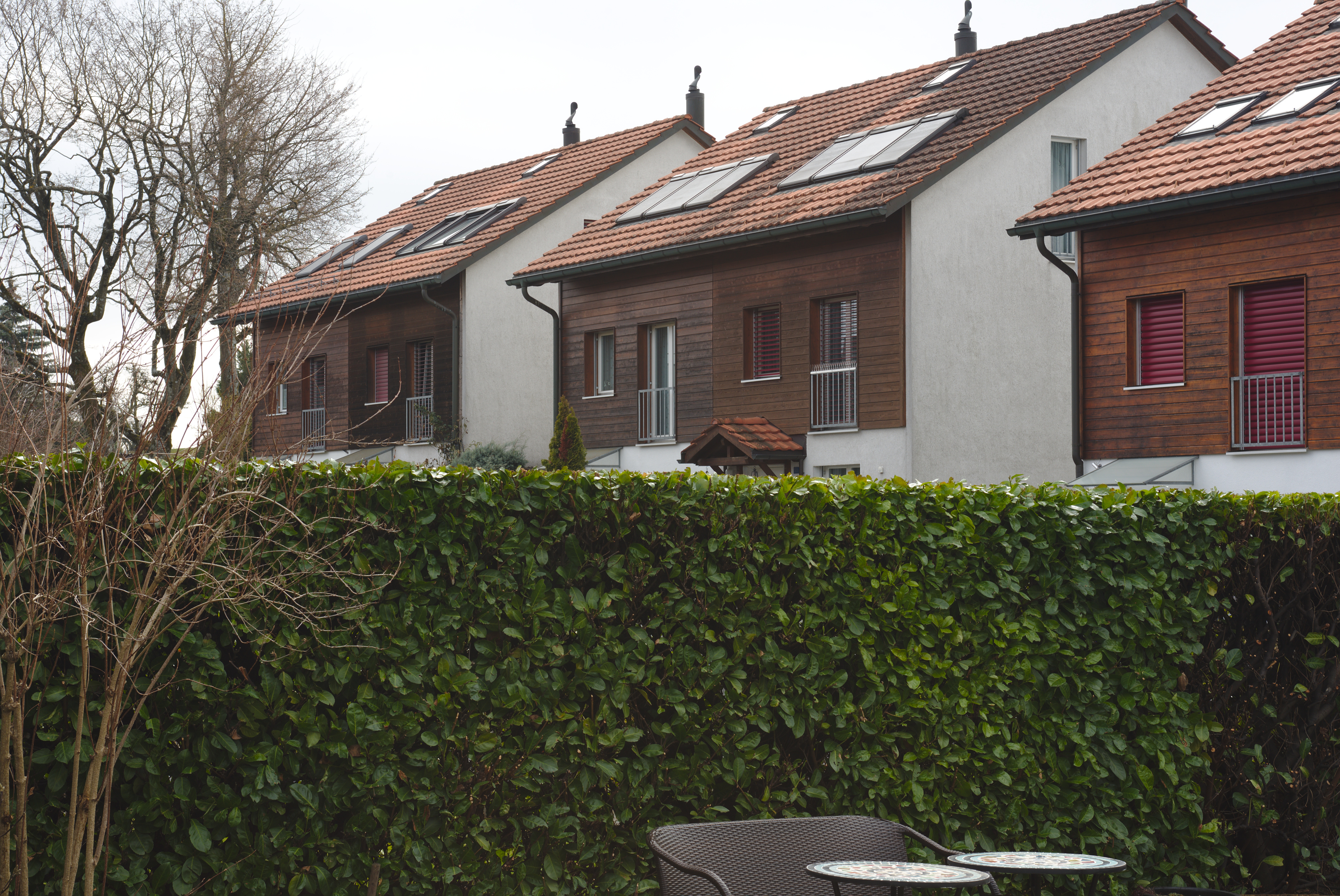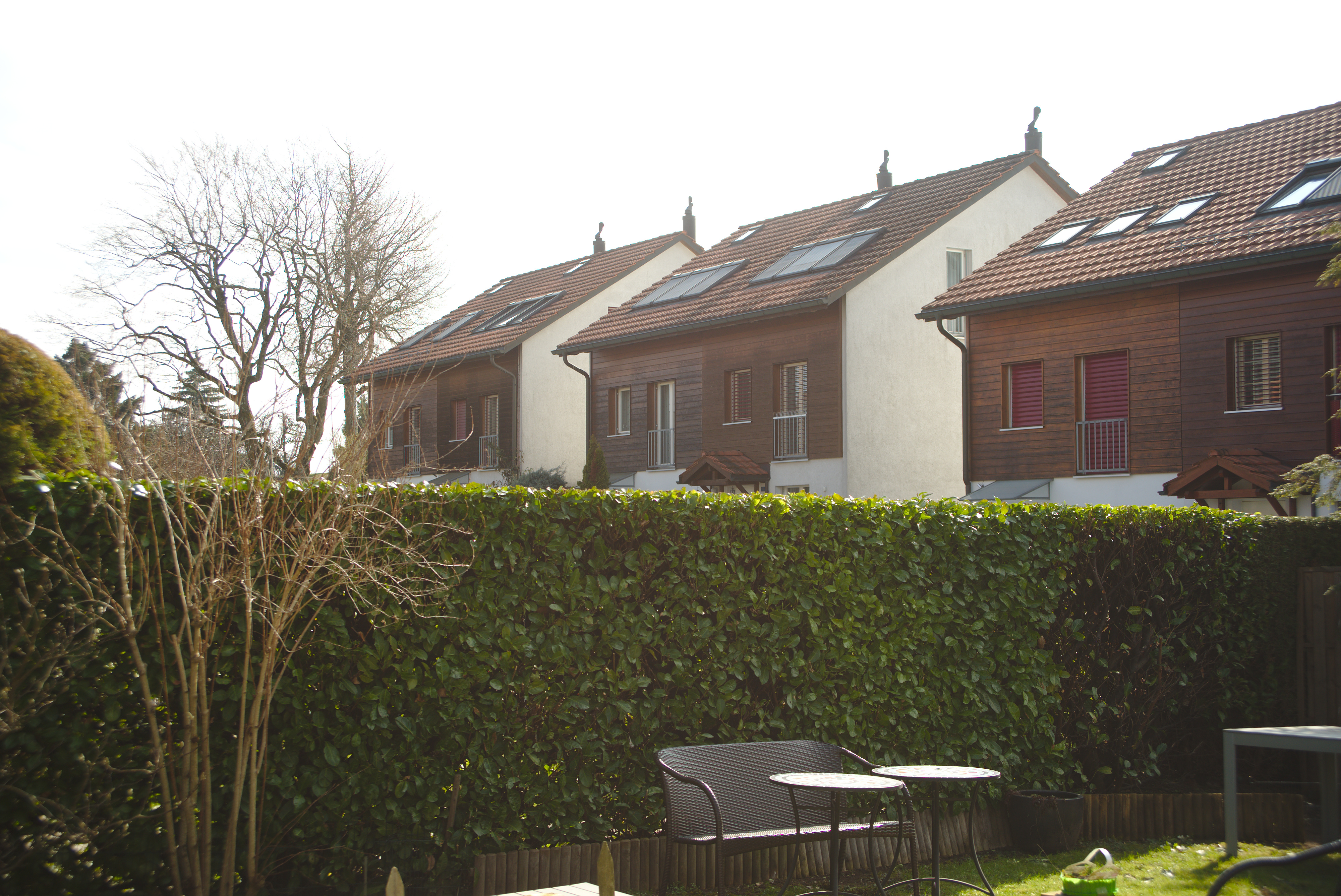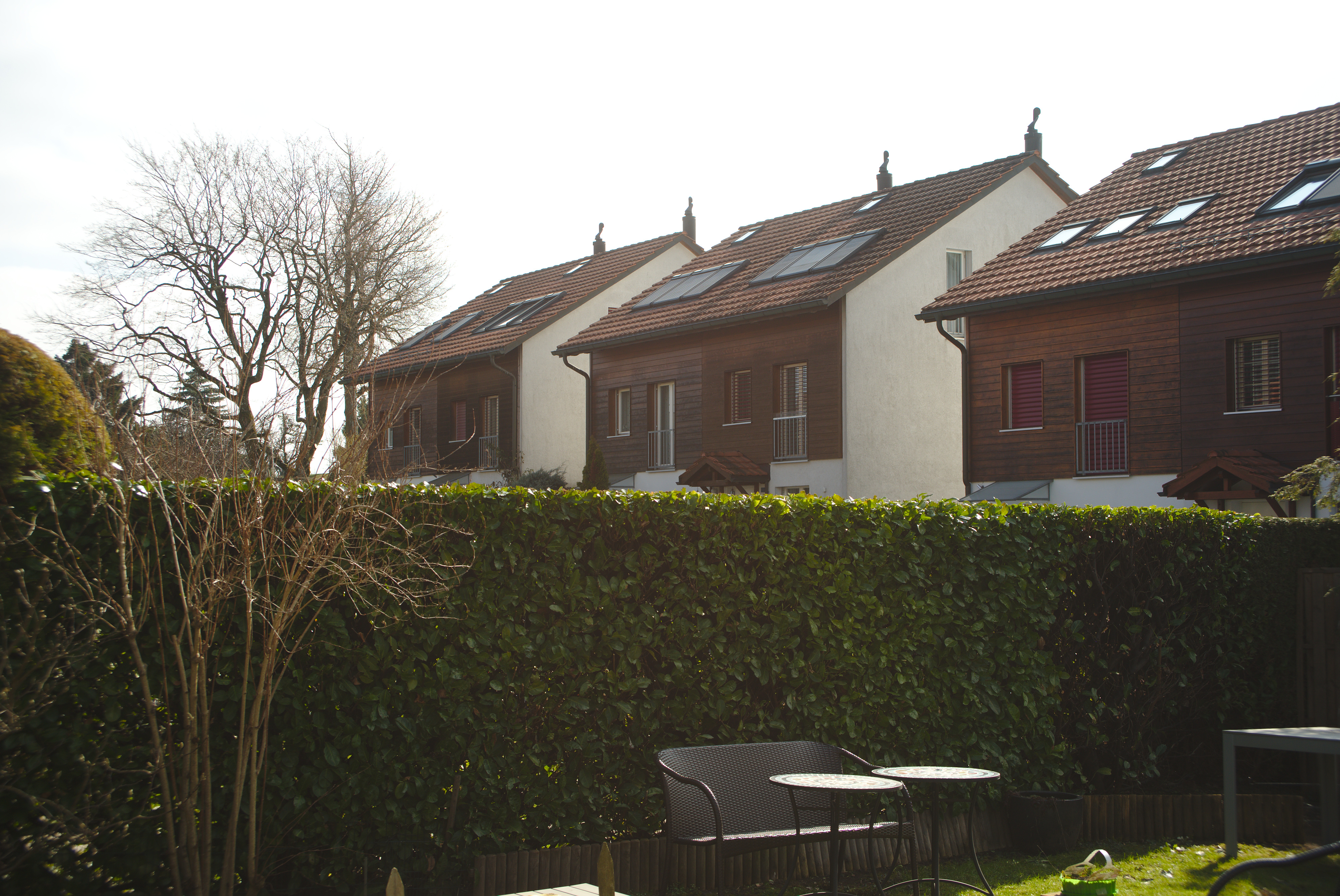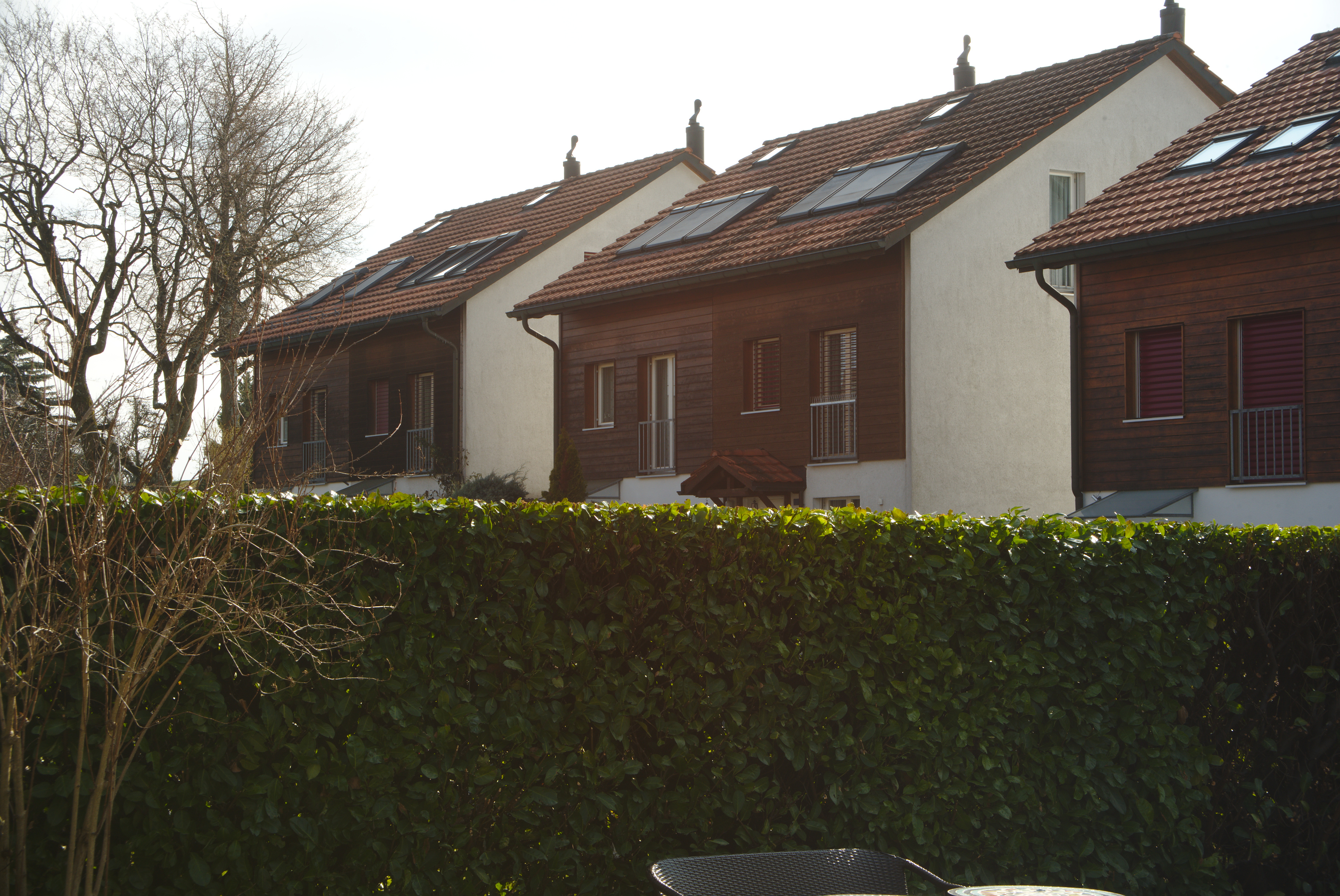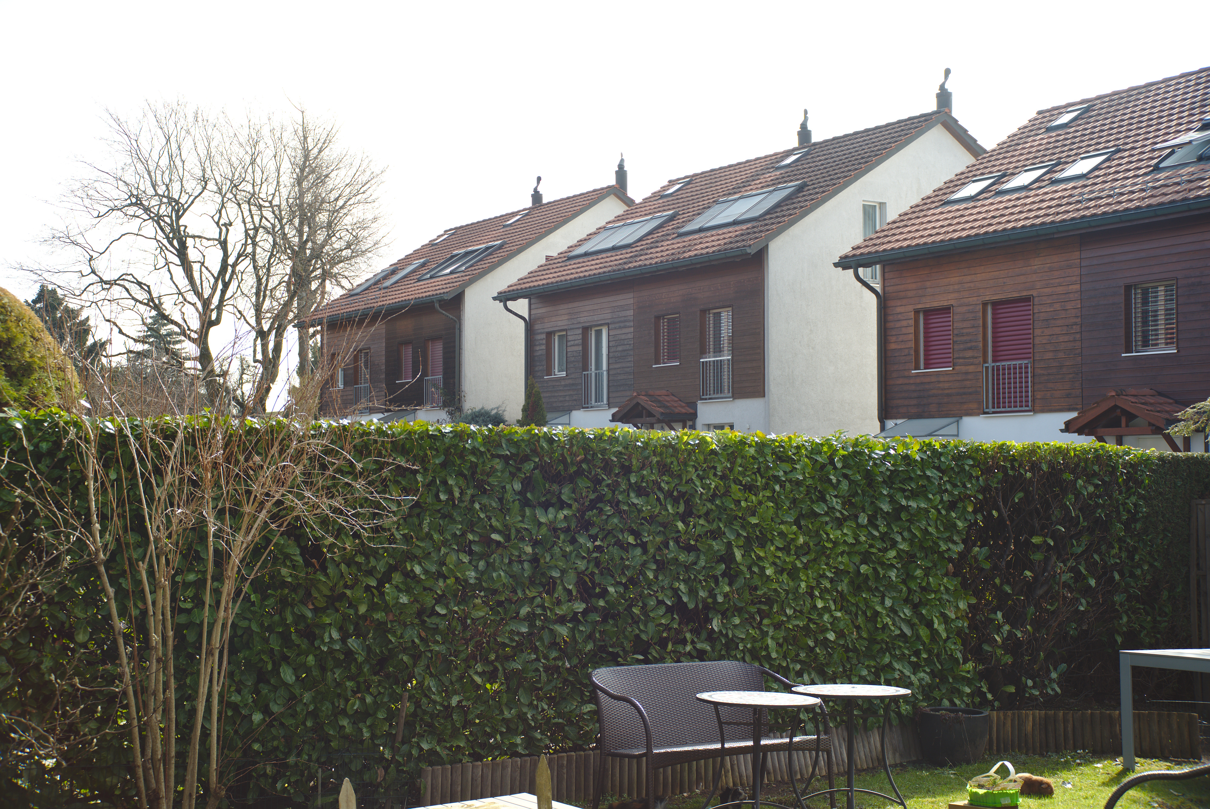 Blick von unserer Terasse auf die Häuser der Nachbarschaft. Fokus auf den Firstzigel der Türüberdachung des mittleren Hauses. Entfernung ca. 40m. Der Baum im Hintergrund ist ca. 60m entfernt. Das vordere Haus ist ca. 20m. entfernt.