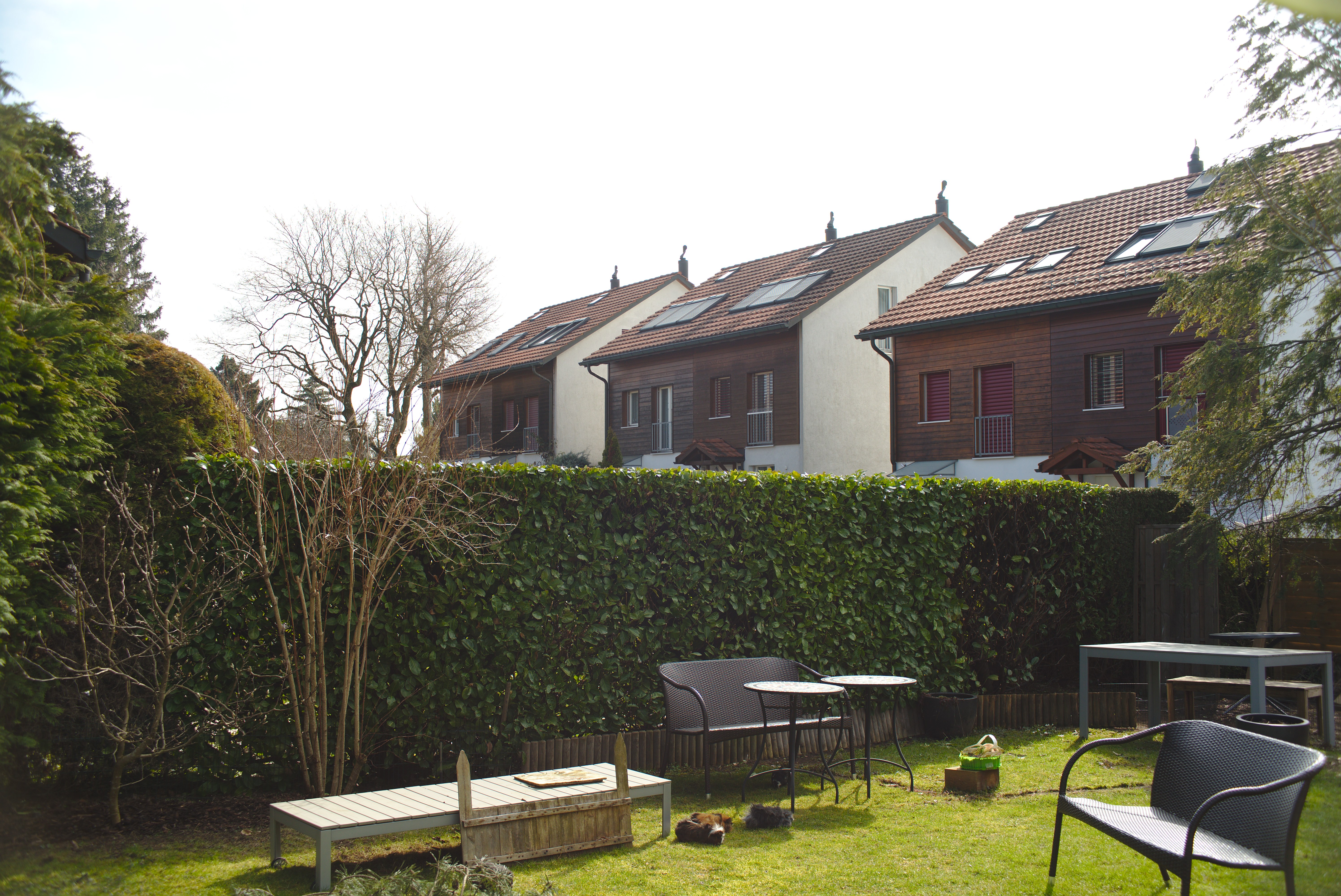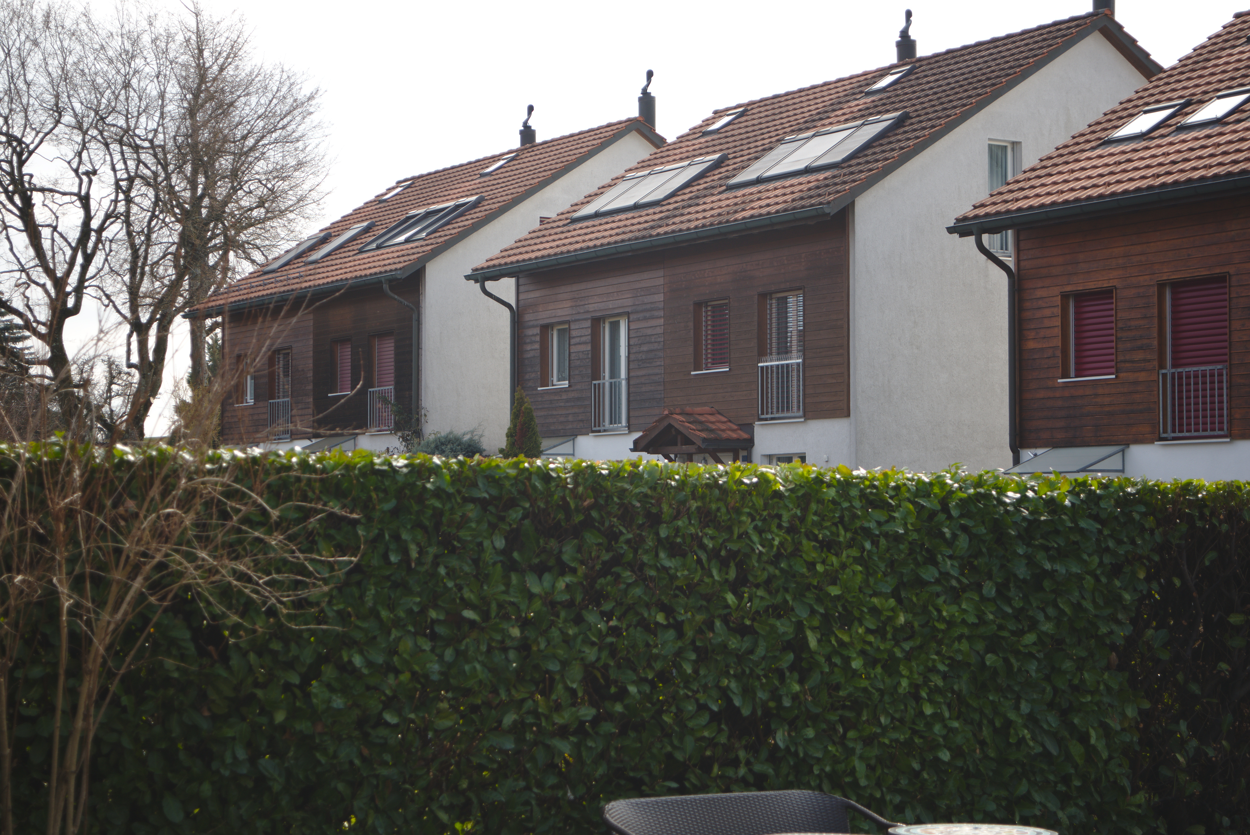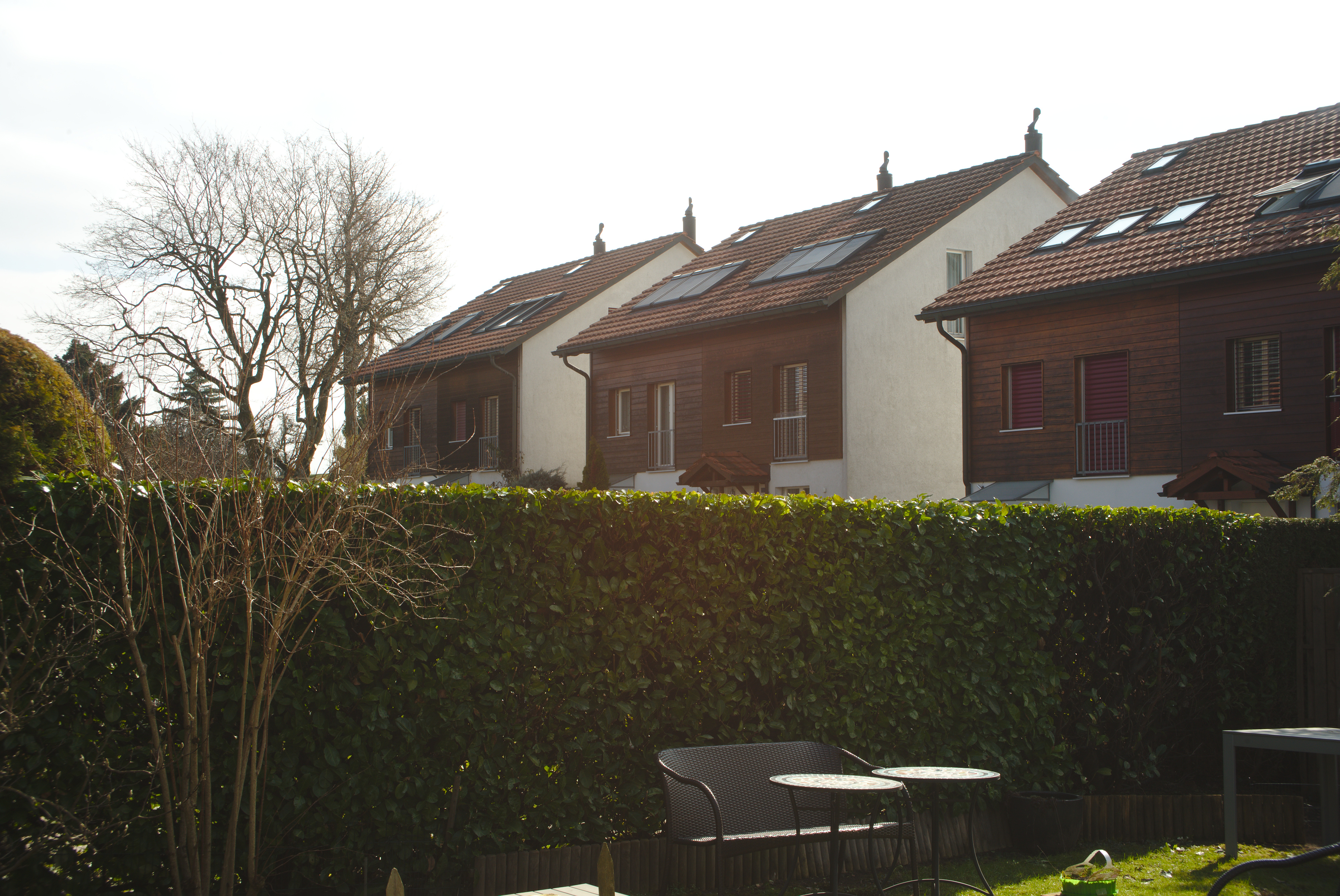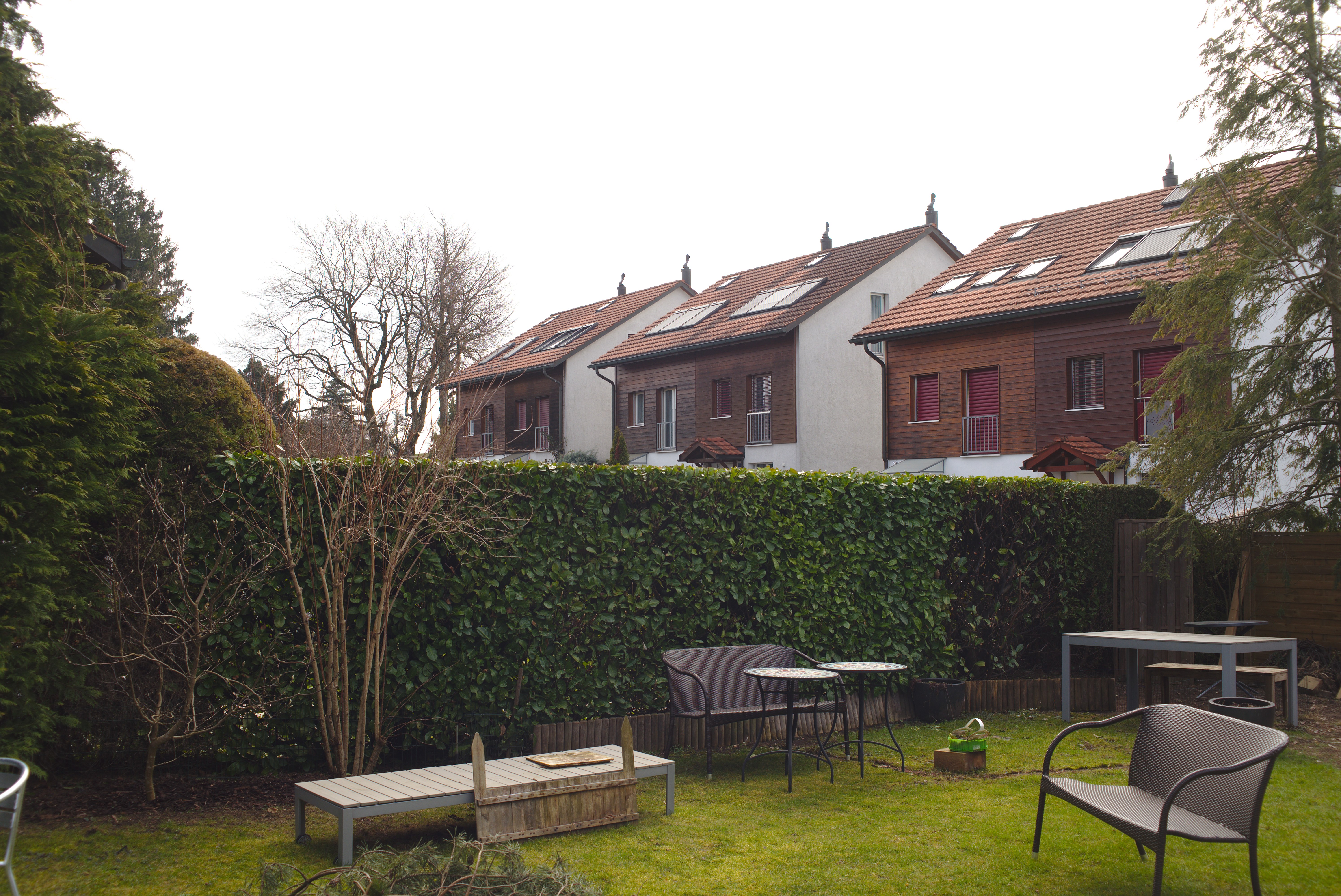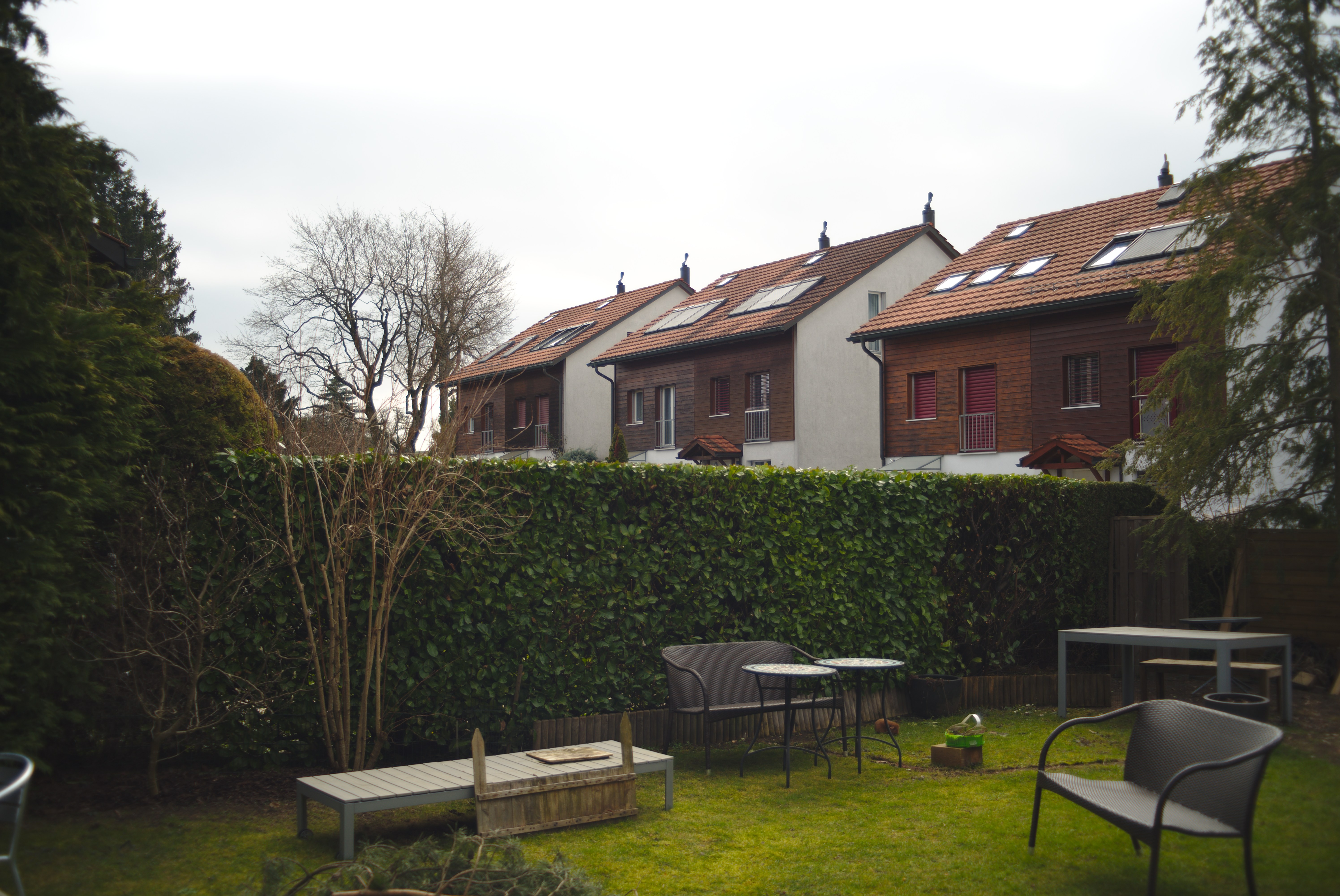 Blick von unserer Terasse auf die Häuser der Nachbarschaft. Fokus auf den Firstzigel der Türüberdachung des mittleren Hauses. Entfernung ca. 40m. Der Baum im Hintergrund ist ca. 60m entfernt. Das vordere Haus ist ca. 20m. entfernt.