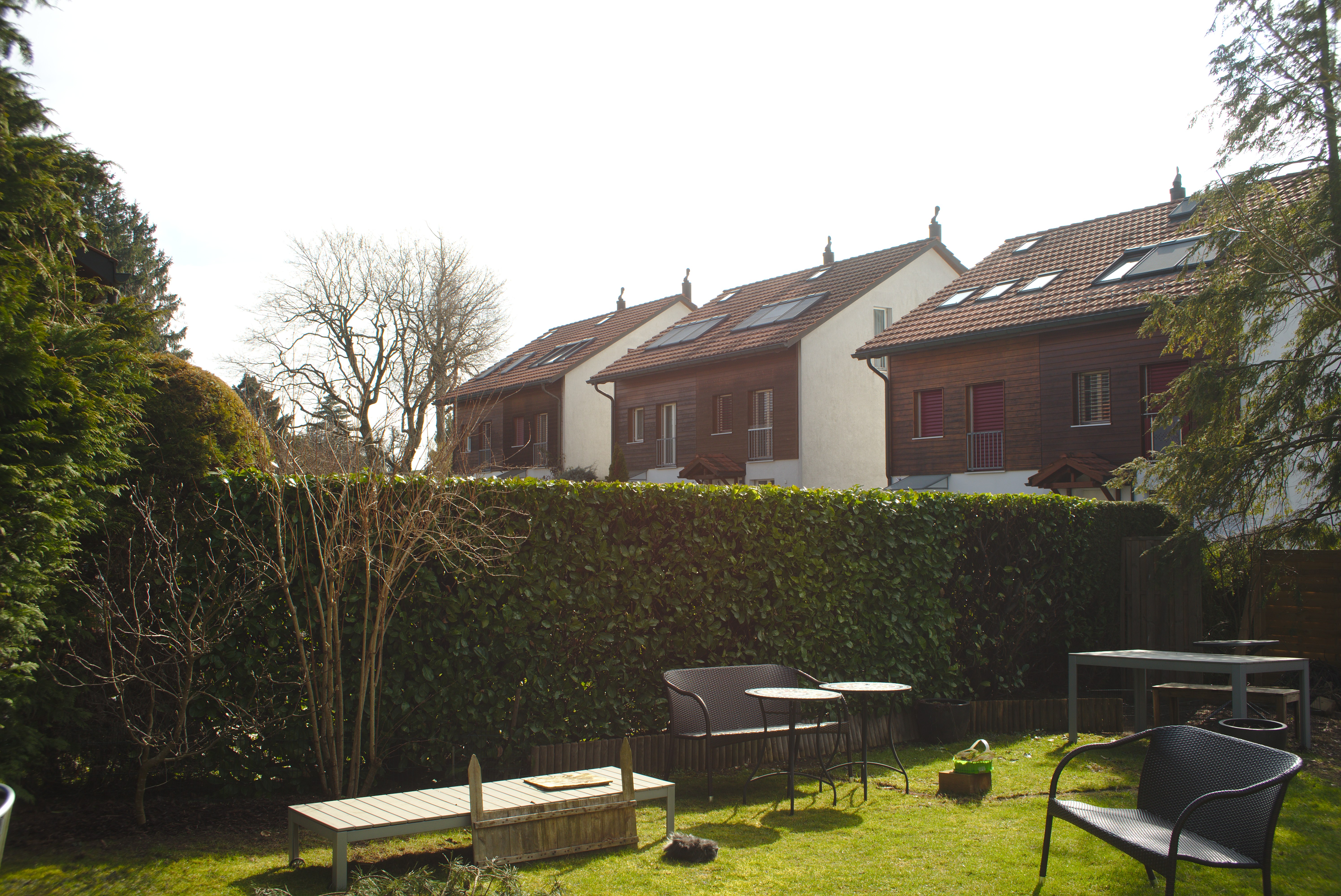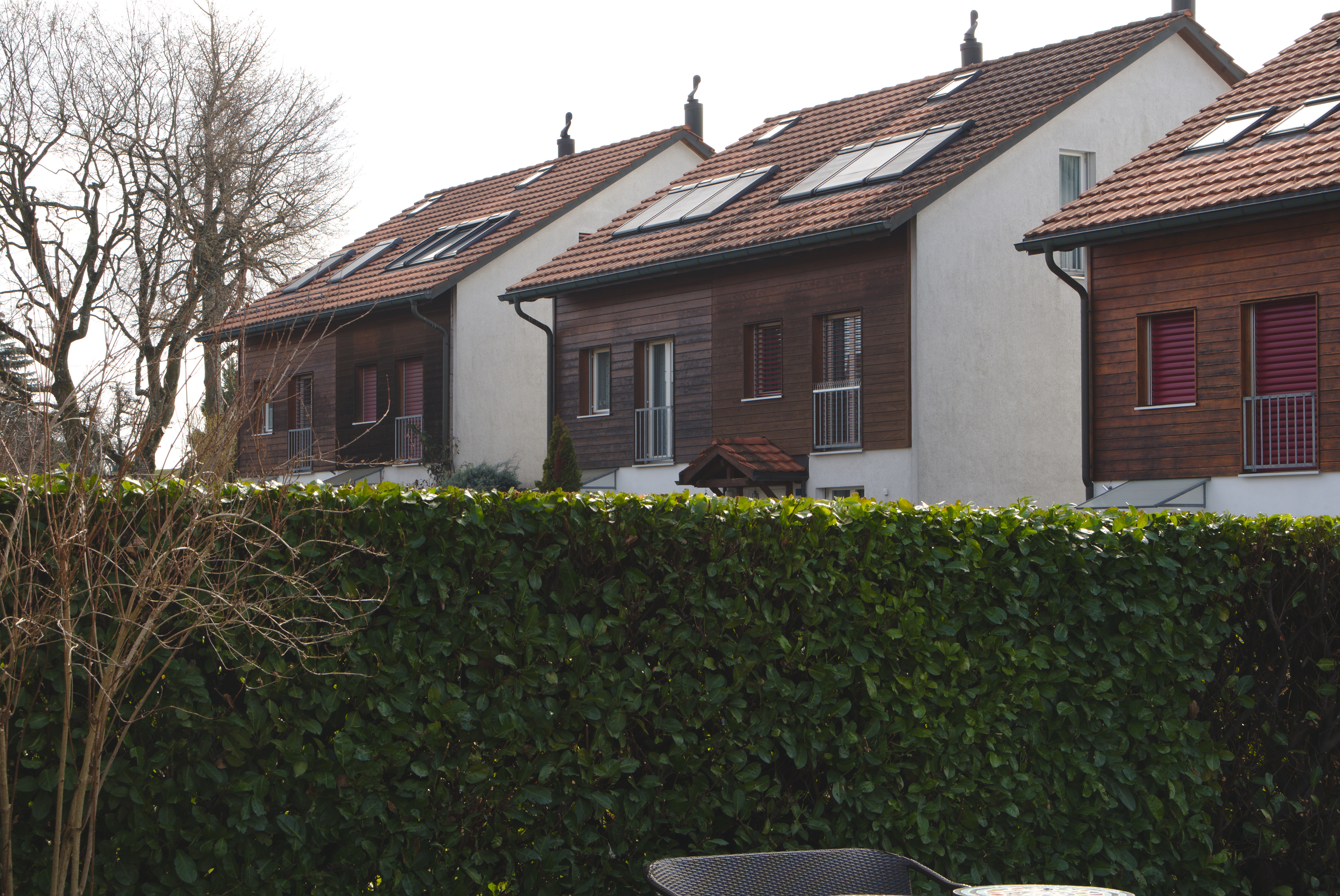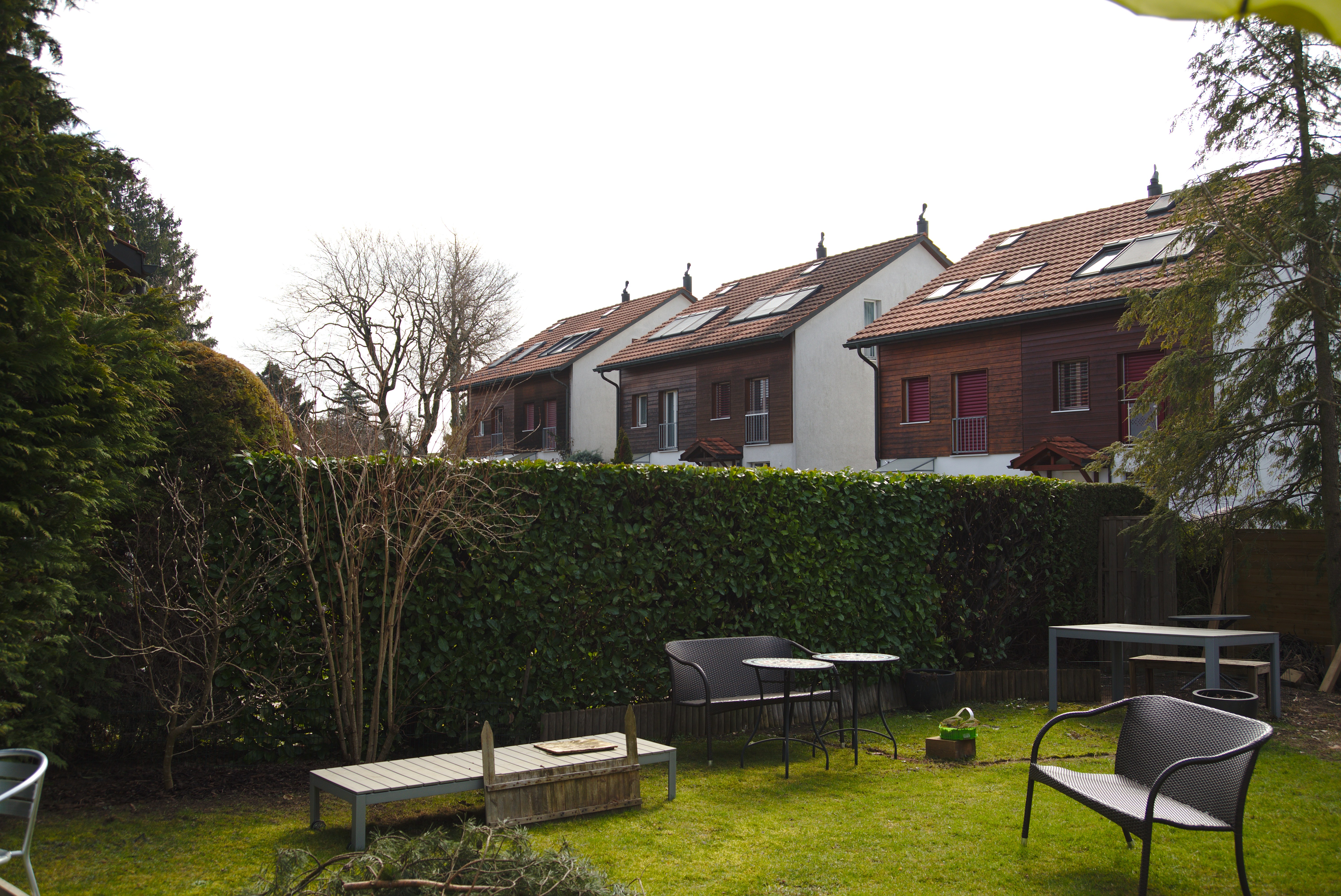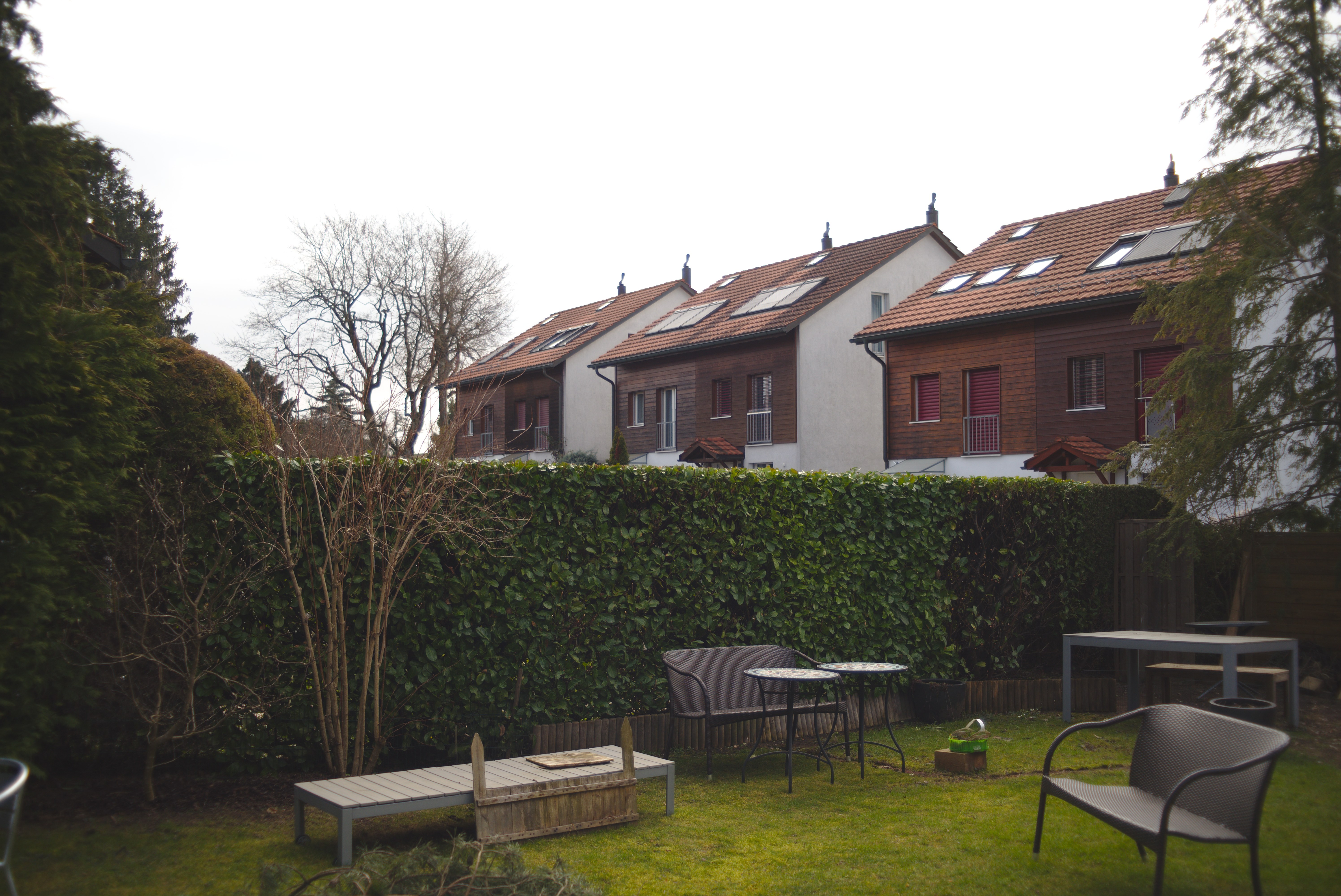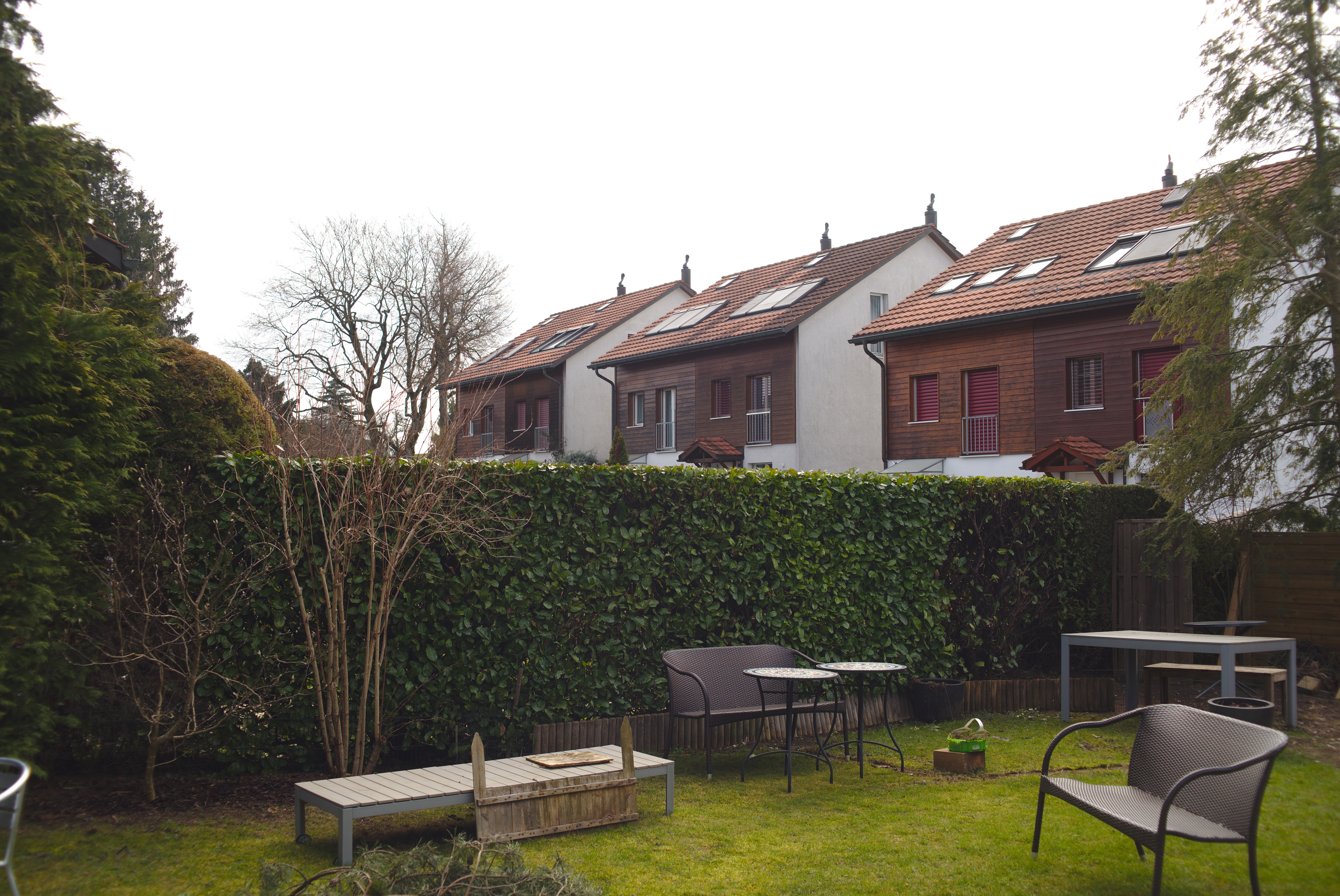 Blick von unserer Terasse auf die Häuser der Nachbarschaft. Fokus auf den Firstzigel der Türüberdachung des mittleren Hauses. Entfernung ca. 40m. Der Baum im Hintergrund ist ca. 60m entfernt. Das vordere Haus ist ca. 20m. entfernt.