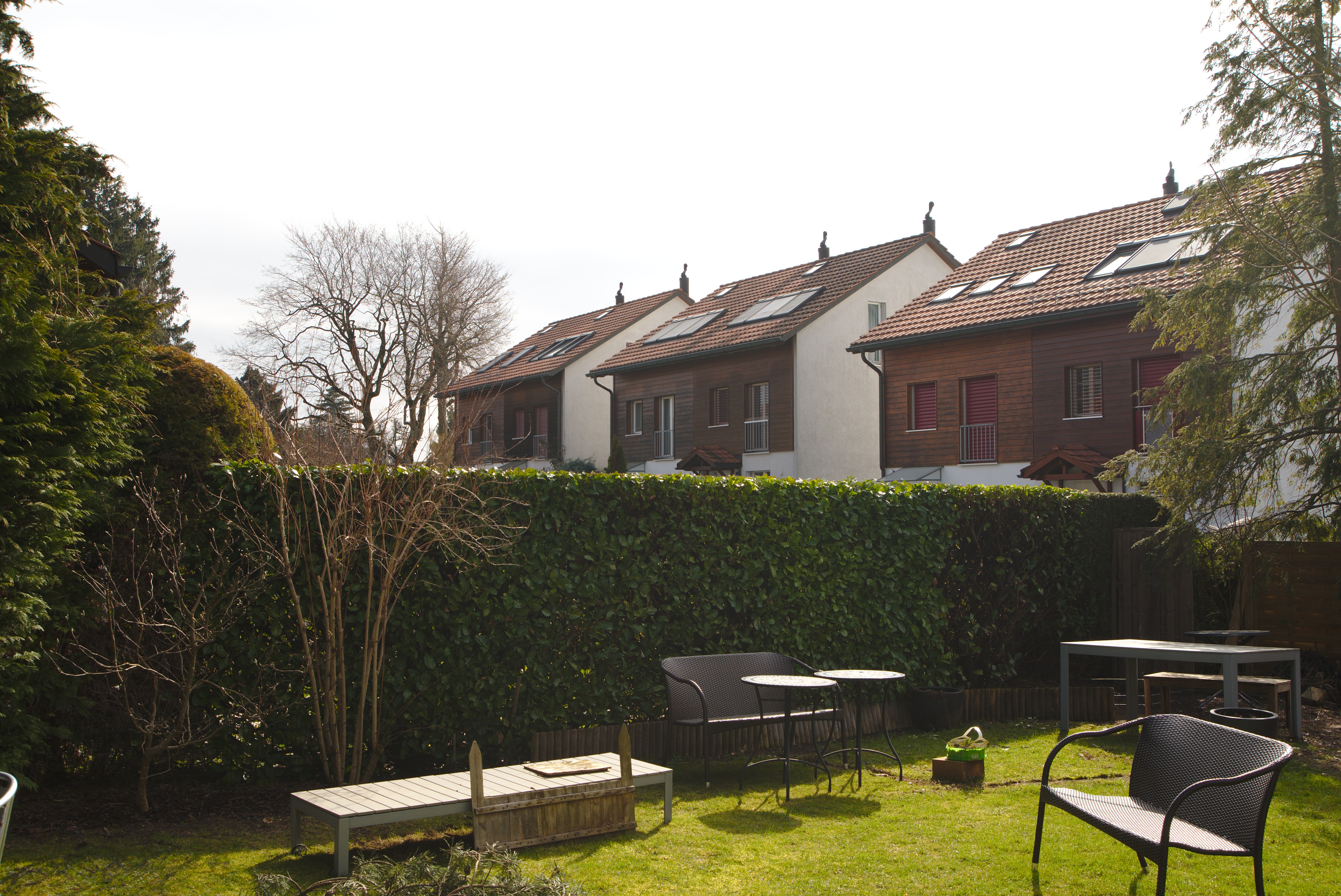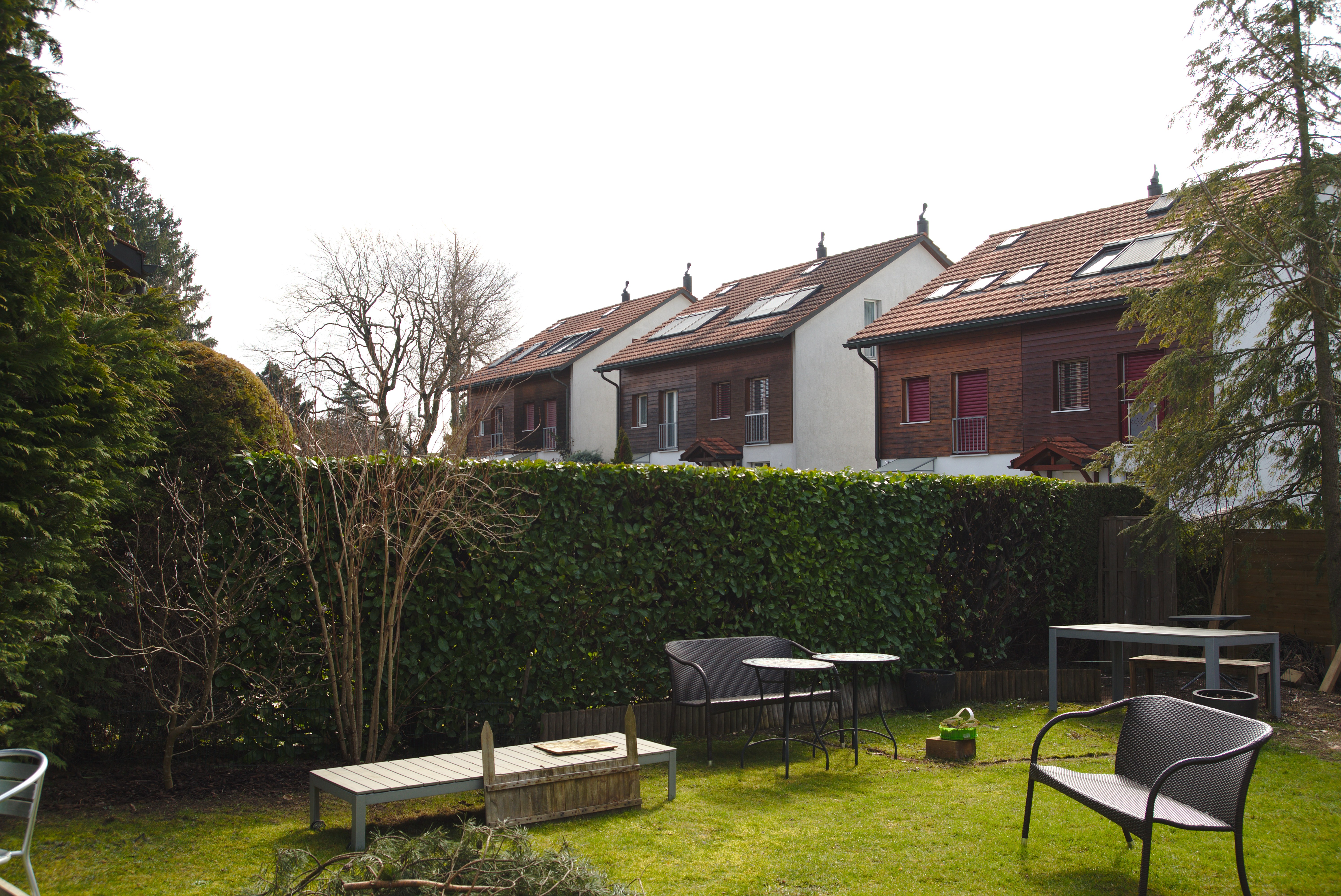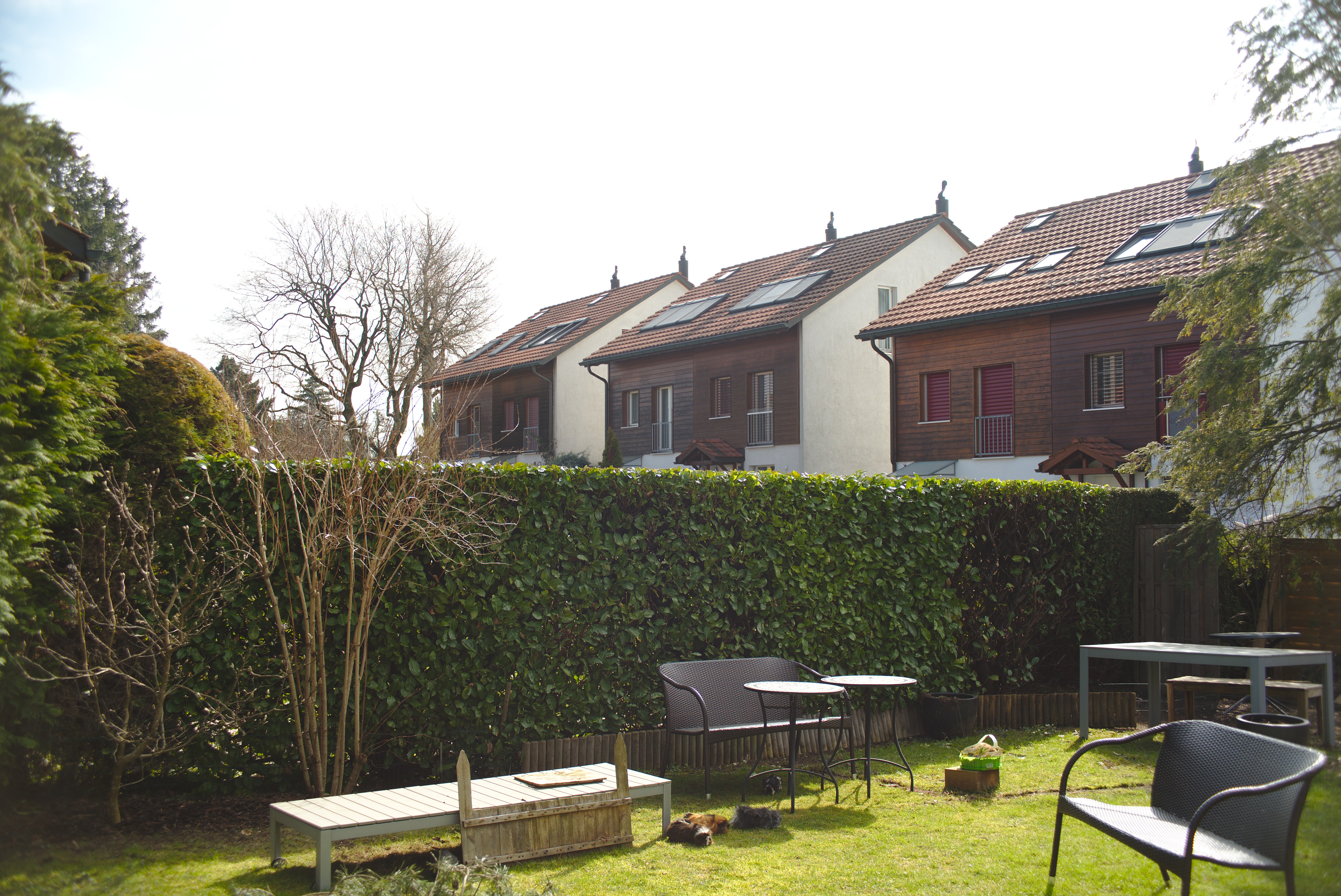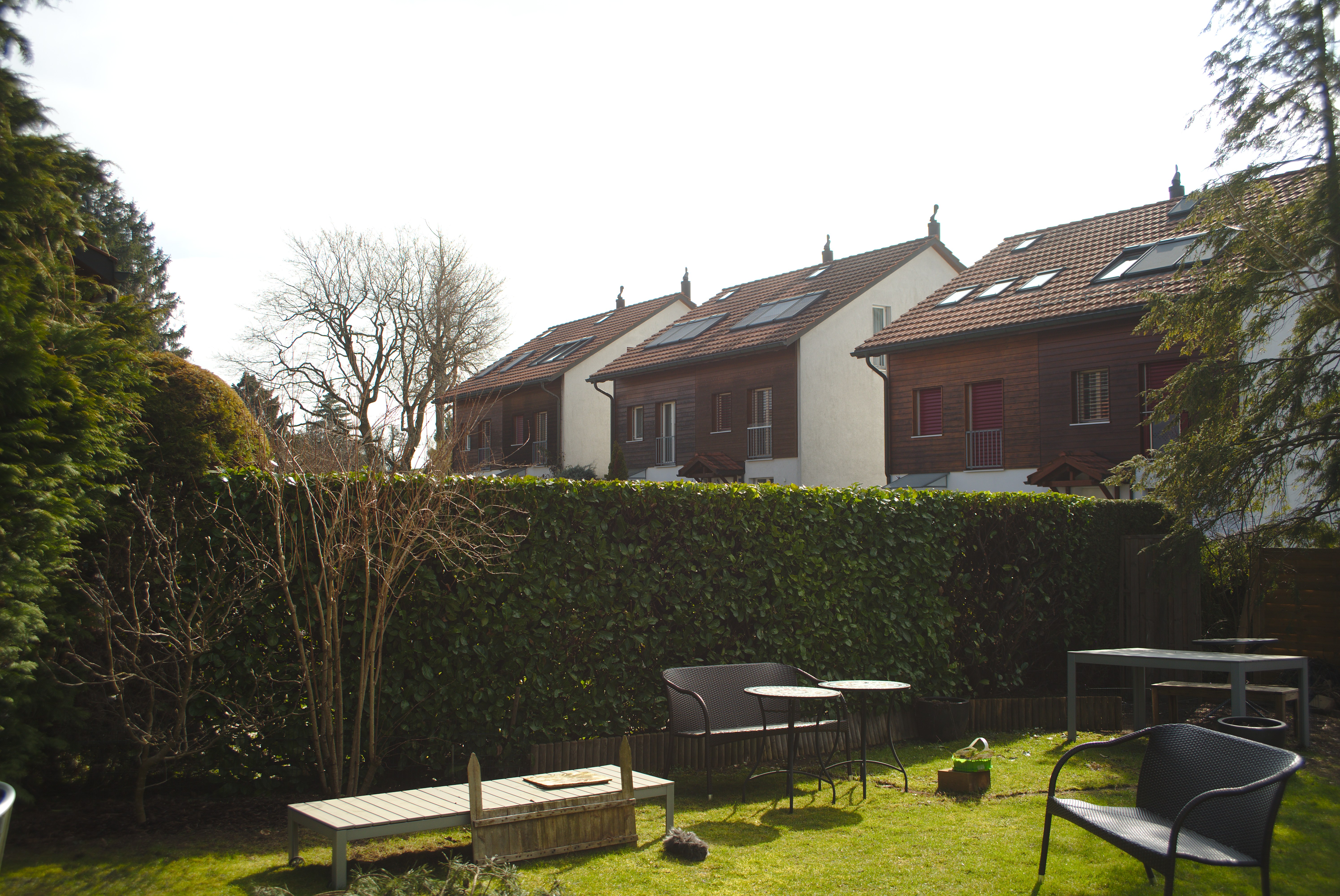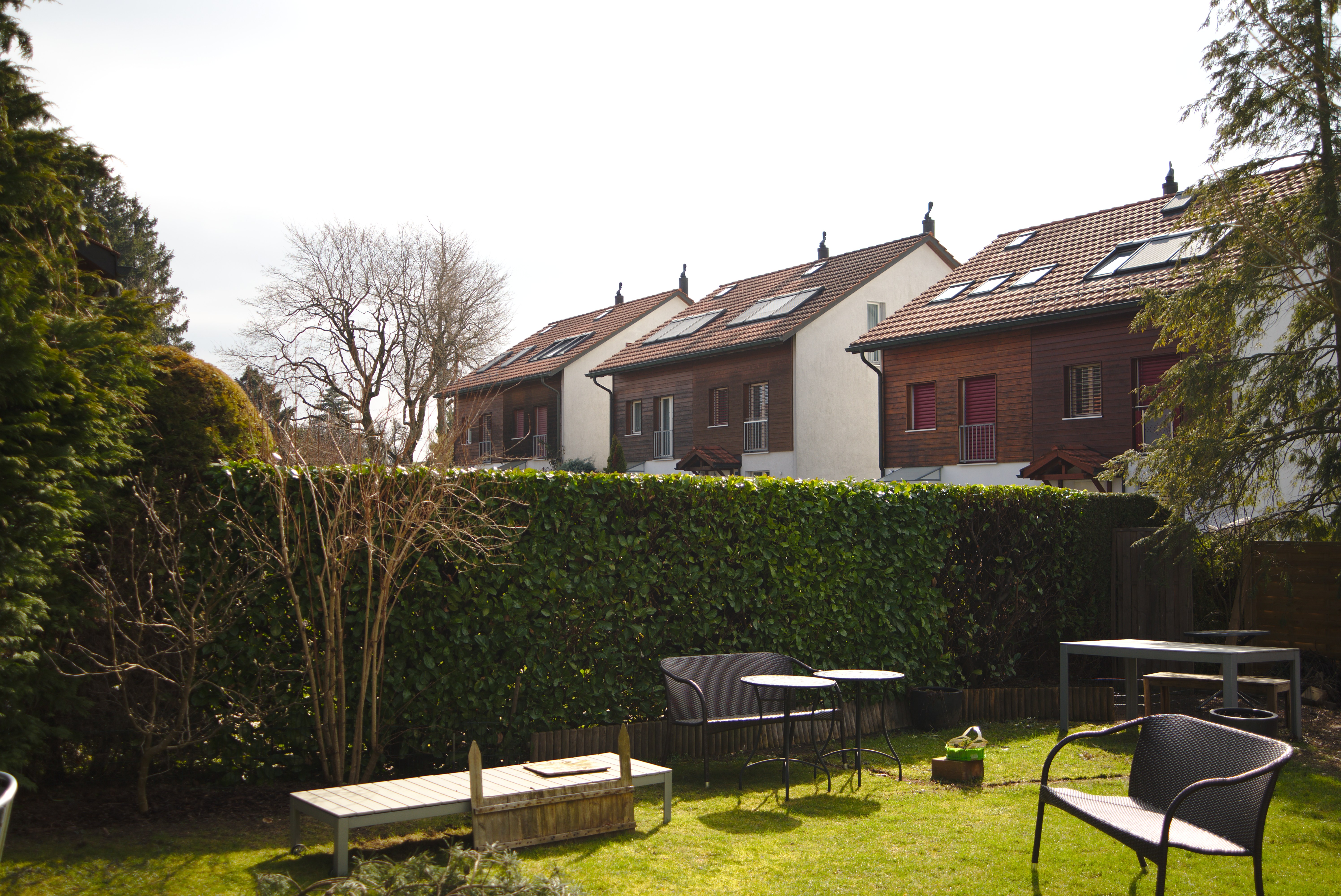 Blick von unserer Terasse auf die Häuser der Nachbarschaft. Fokus auf den Firstzigel der Türüberdachung des mittleren Hauses. Entfernung ca. 40m. Der Baum im Hintergrund ist ca. 60m entfernt. Das vordere Haus ist ca. 20m. entfernt.