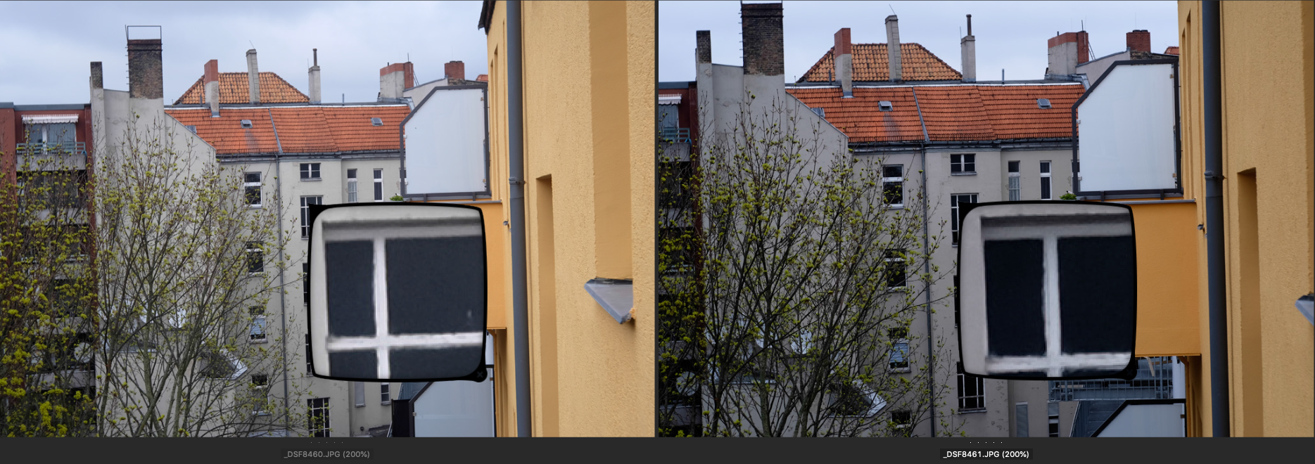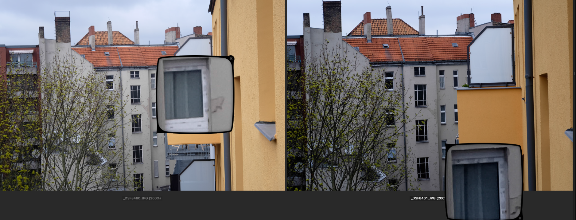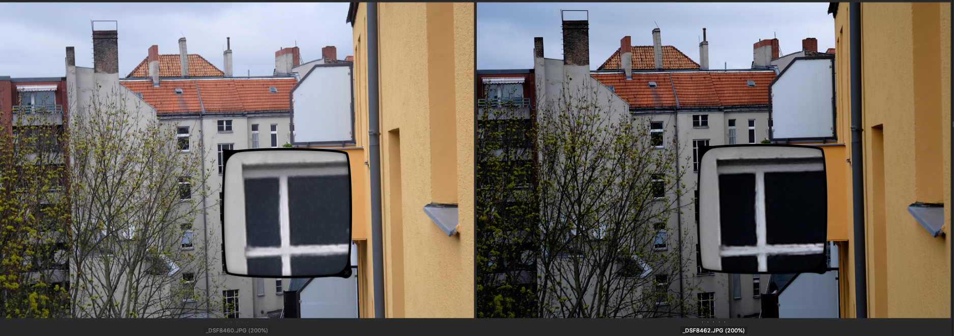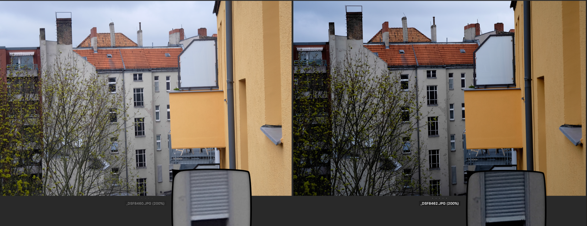 Jeweils links das Choro und rechts das Ultralit Blende 8, SS 1/250, ISO 200. Der Fokus liegt auf dem großen obersten Fenster des Treppenhauses gegenüber.