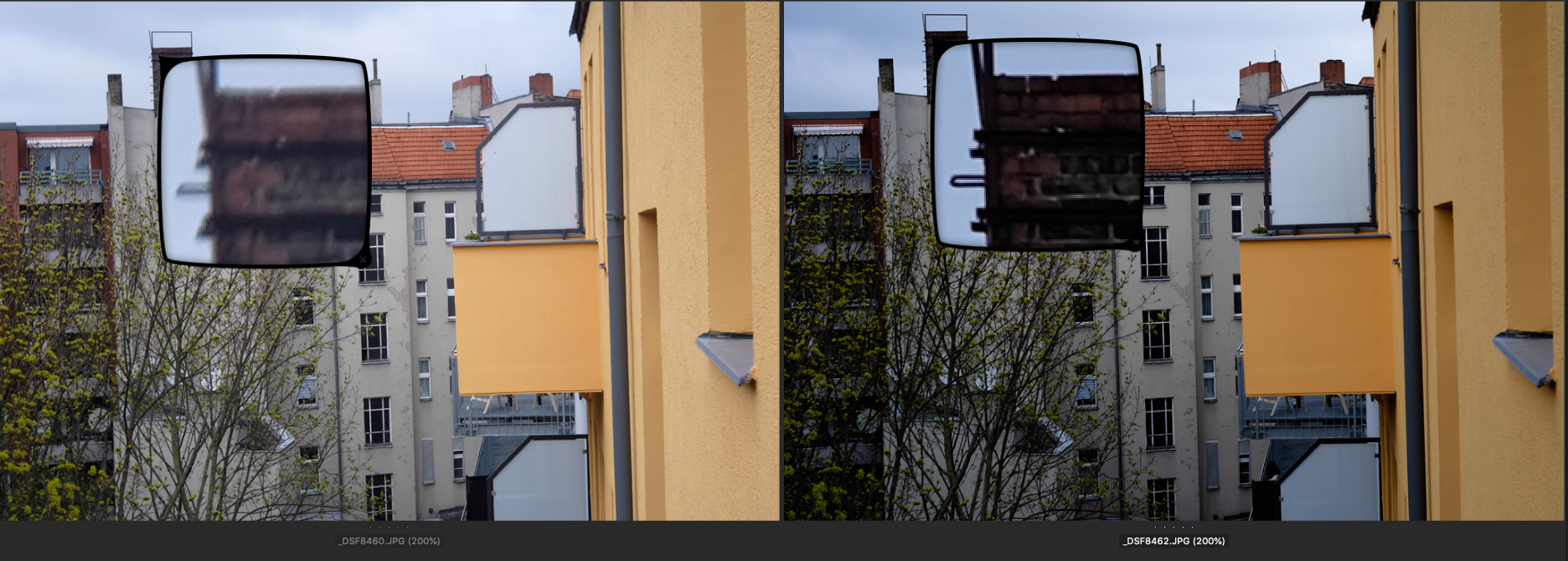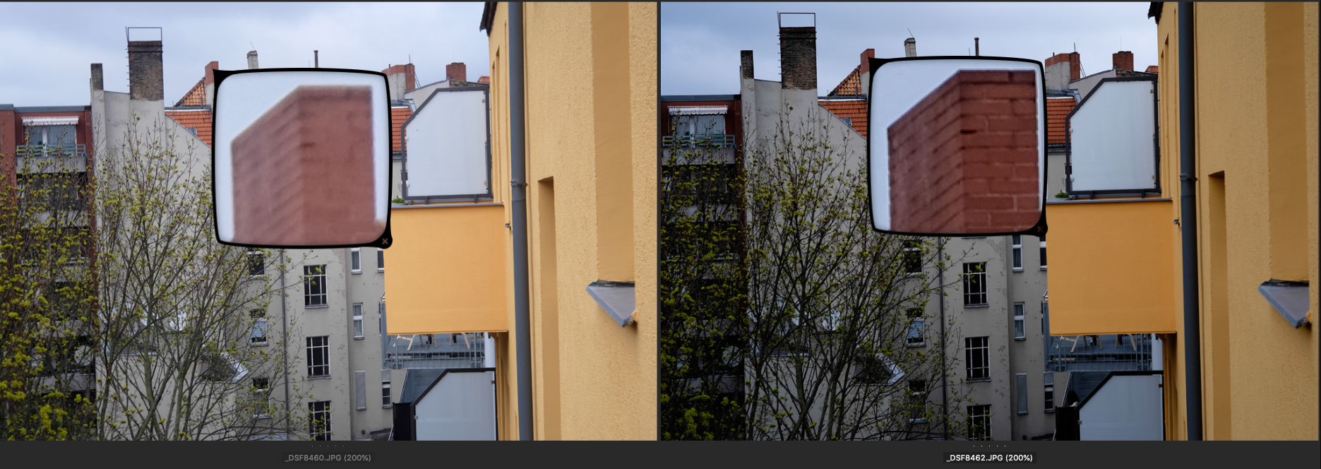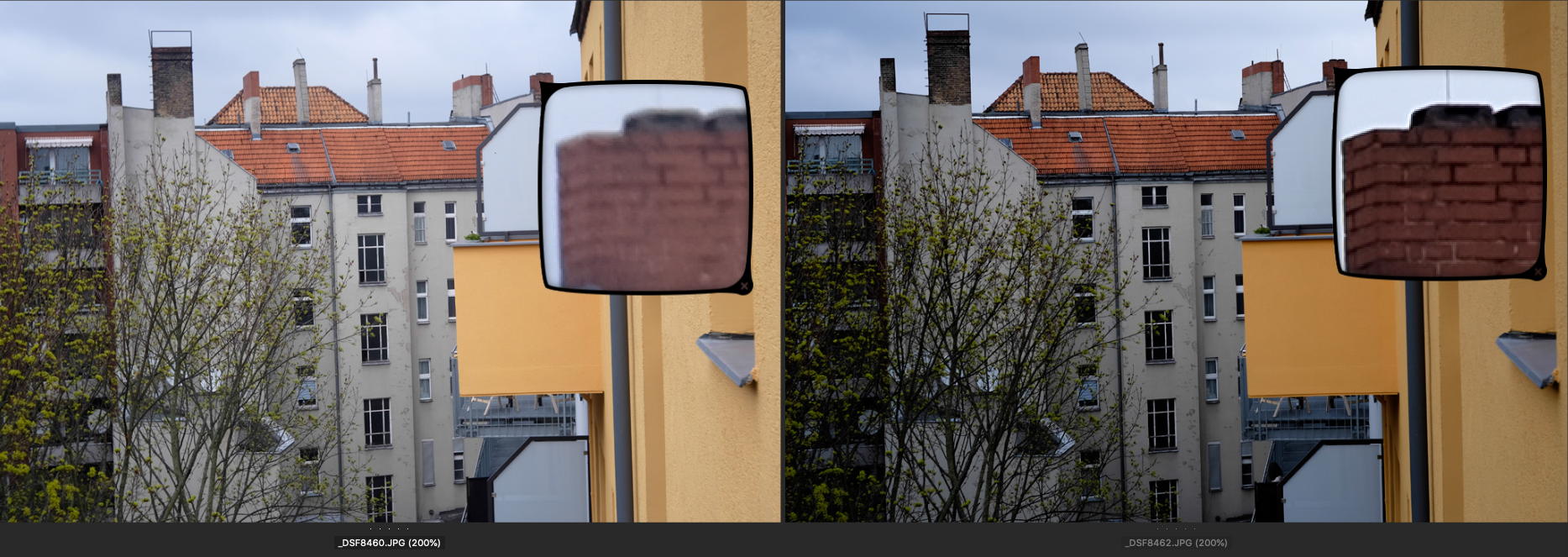 Jeweils links das Choro und rechts das Ultralit Blende 8, SS 1/250, ISO 200. Der Fokus liegt auf dem großen obersten Fenster des Treppenhauses gegenüber.
