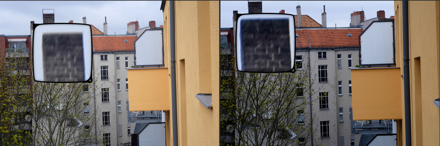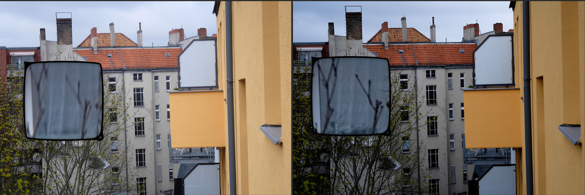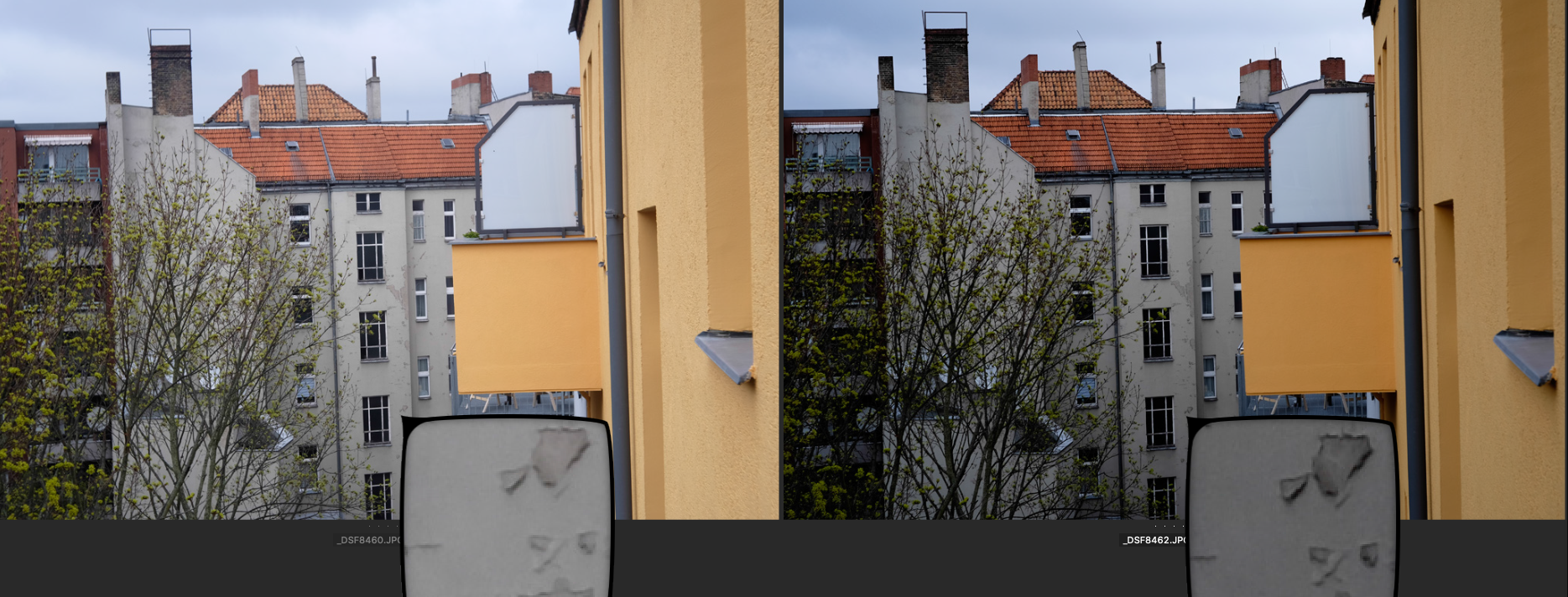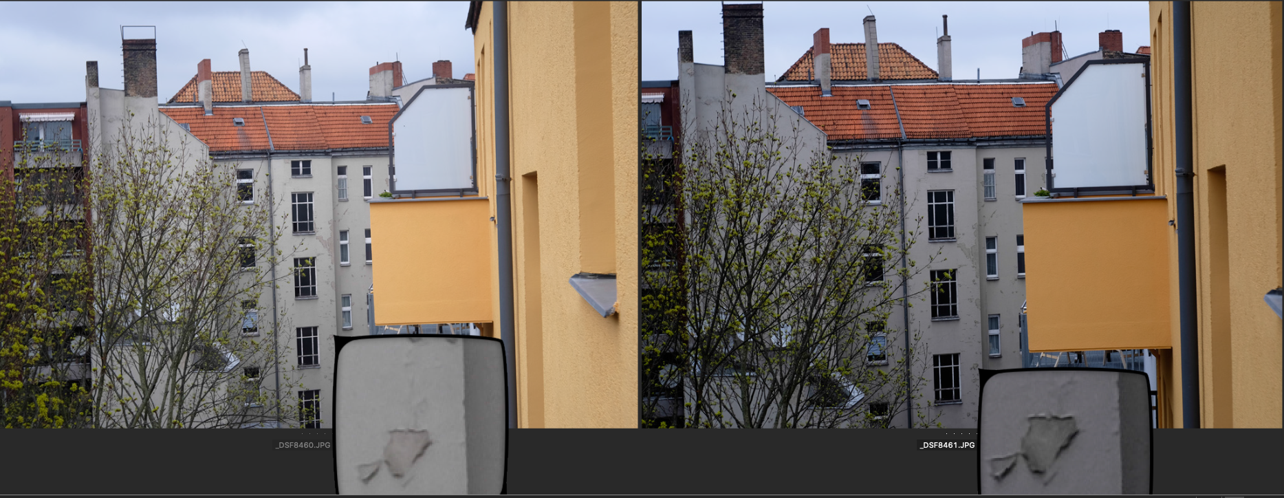 Jeweils links das Choro und rechts das Ultralit Blende 8, SS 1/250, ISO 200. Der Fokus liegt auf dem großen obersten Fenster des Treppenhauses gegenüber.