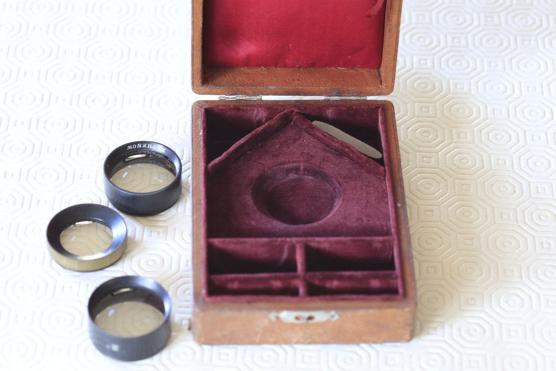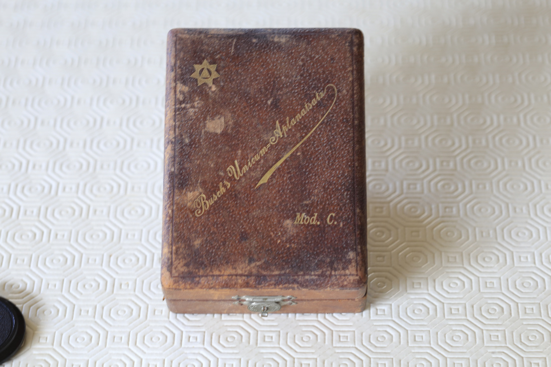 Das Busch Unicum Aplanat ist mein ältestes Objektiv, ich vermute so ca. 110 Jahre alt. Die Bezeichnung Objektiv ist nicht ganz korrekt, es handelt sich um einen unvergüteten Linsensatz, welcher bei unterschiedlicher Zusammenstellung der einzelnen Linsen zu verschiedenen Brennweiten -zB.15 cm oder 25 cm- führt. Erstaunlich, die Gläser sind noch klar und das Behältnis aus Leder ist mit rotem Samt ausgelegt hat einen fein ziselierten Verschluss, das war damals sicher sehr wertvoll und somit entsprechend ausgestattet.